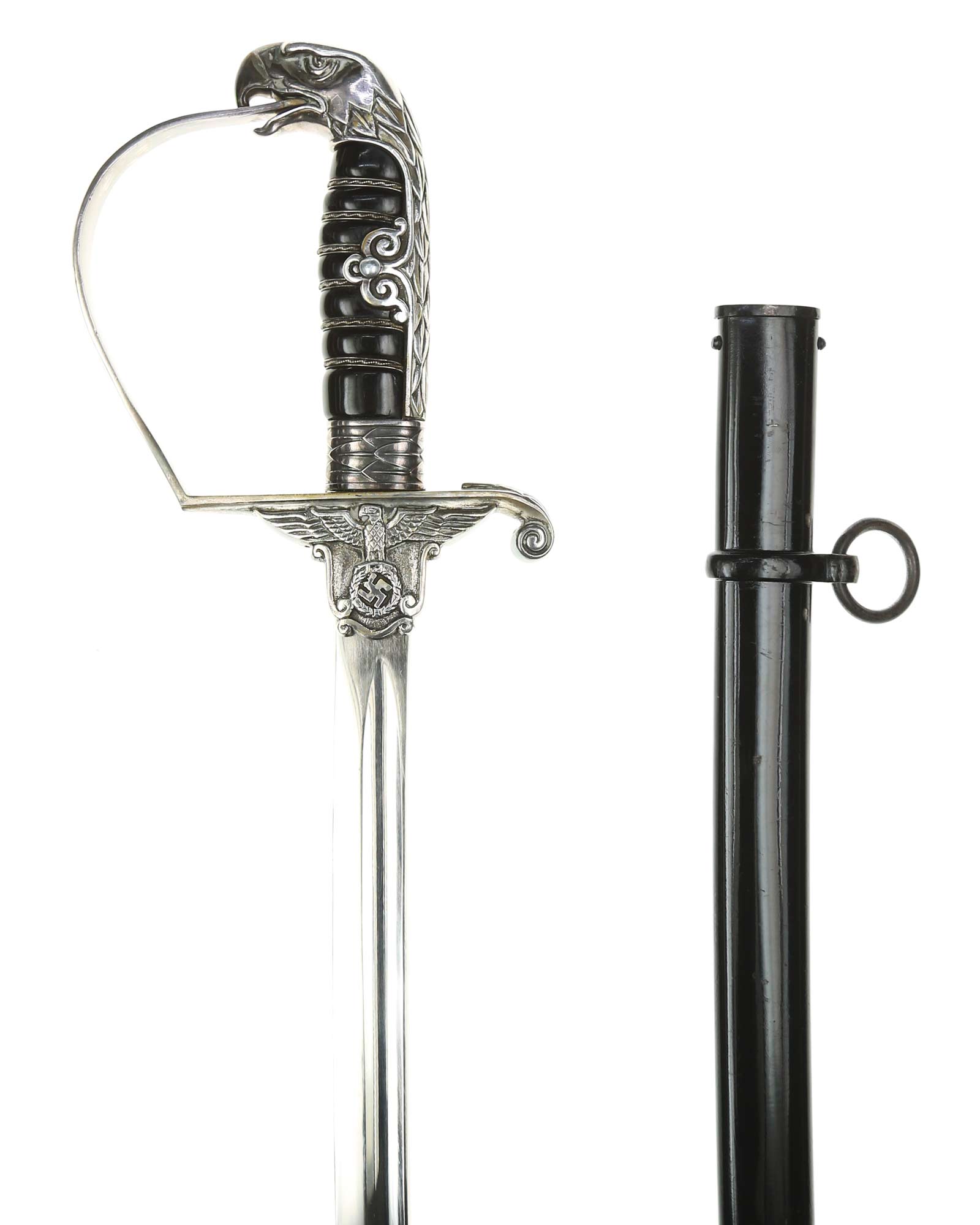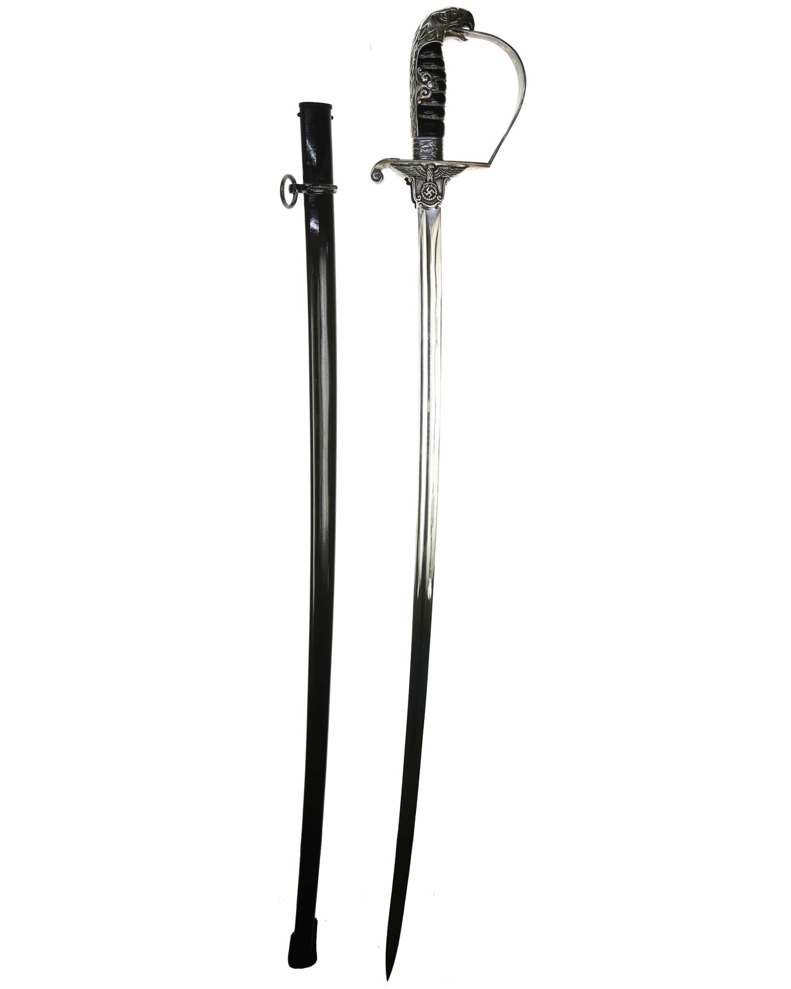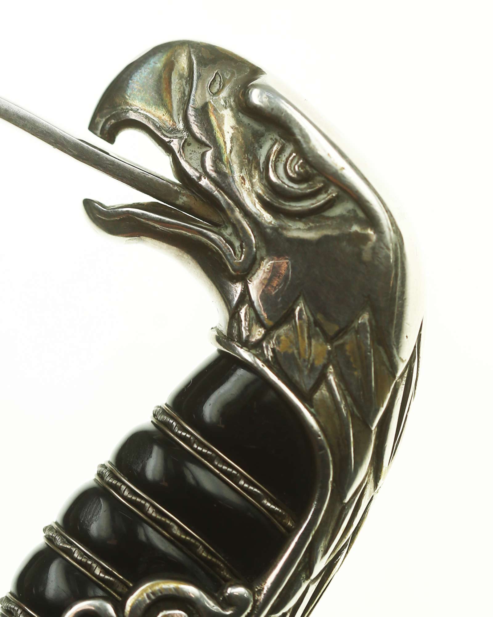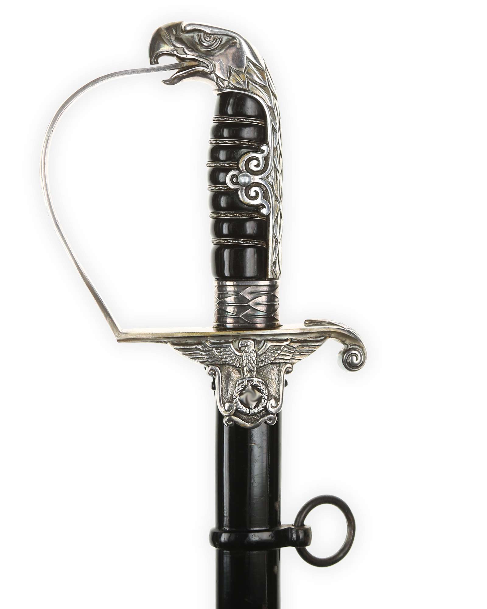 Sabre for judicial officers (model number 1763) manufactured by Carl Eickhorn Solingen. Nickel-plated blade with double-sided fuller. Silver-plated hilt with decoration, eagle head cap and black plastic grip. Black lacquered steel scabbard. Length approx. 107 cm.