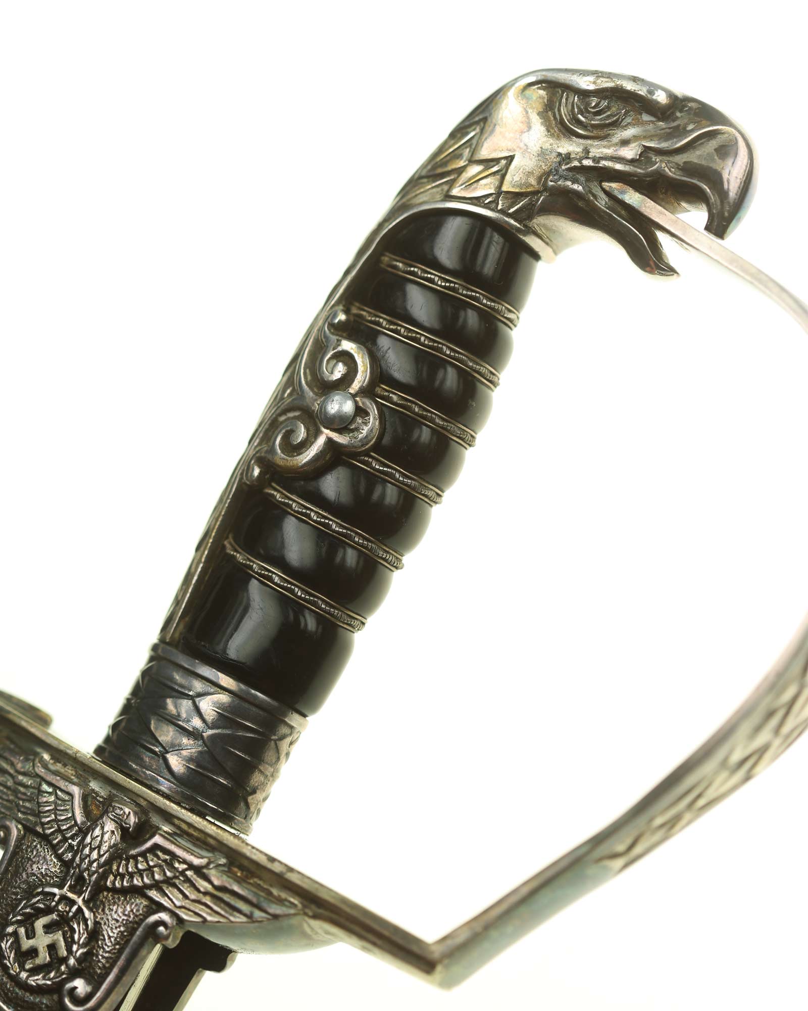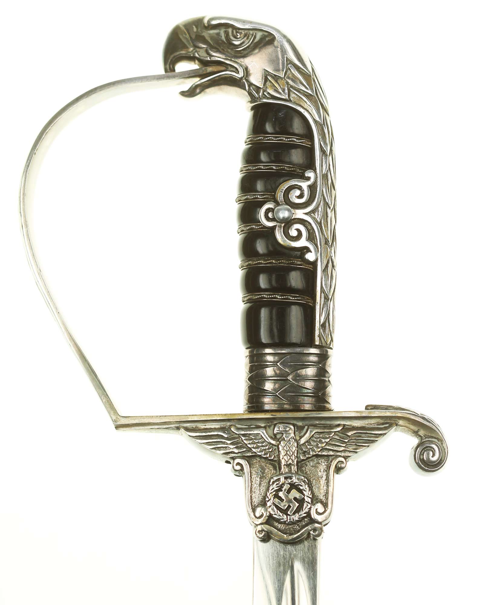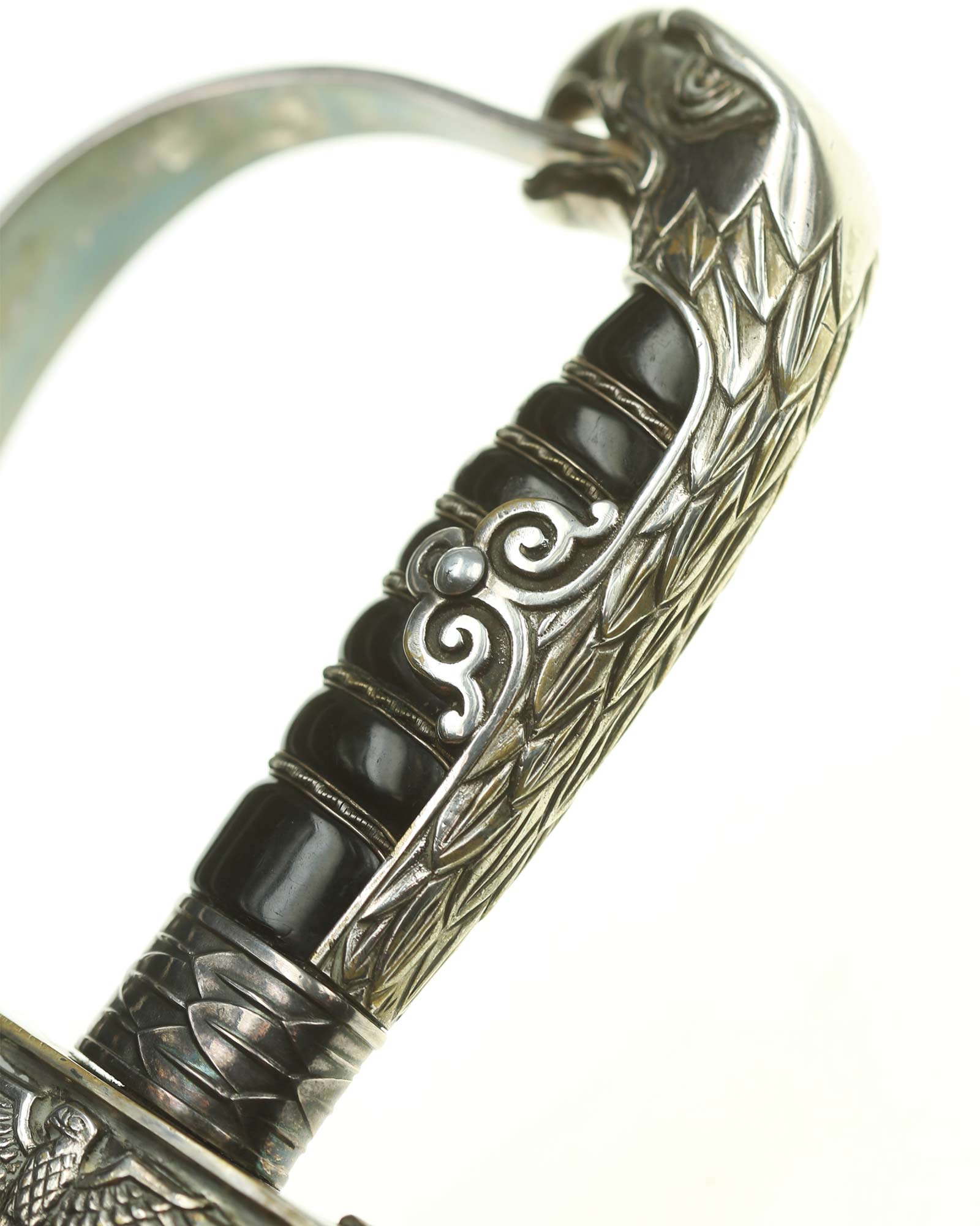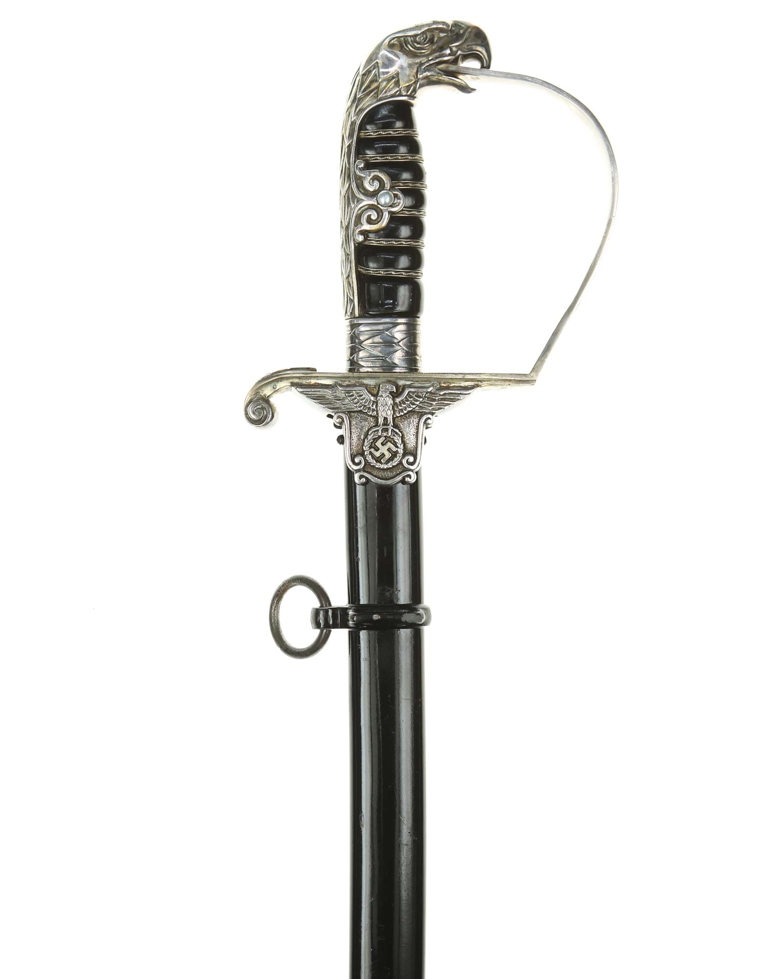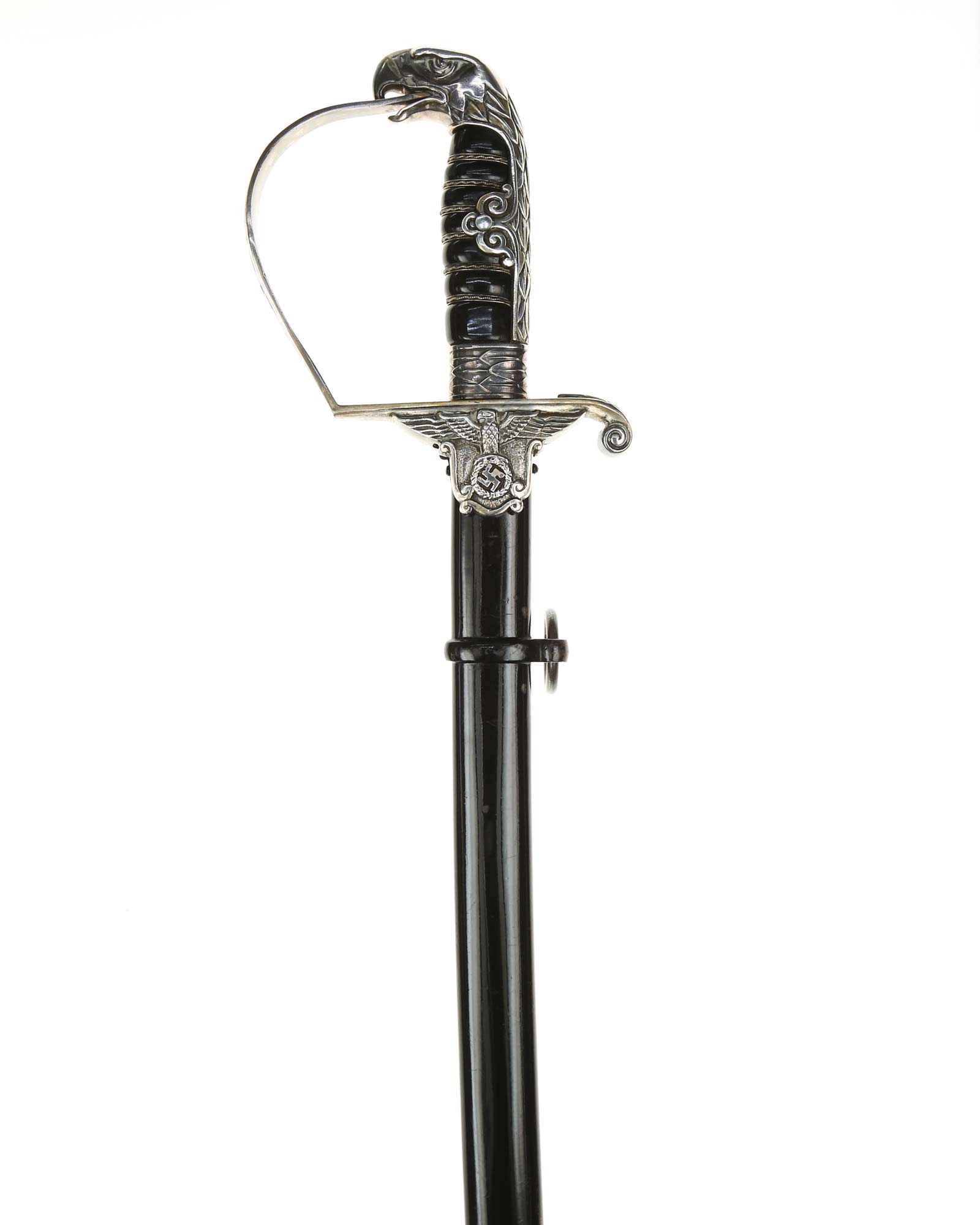 Sabre for judicial officers (model number 1763) manufactured by Carl Eickhorn Solingen. Nickel-plated blade with double-sided fuller. Silver-plated hilt with decoration, eagle head cap and black plastic grip. Black lacquered steel scabbard. Length approx. 107 cm.
