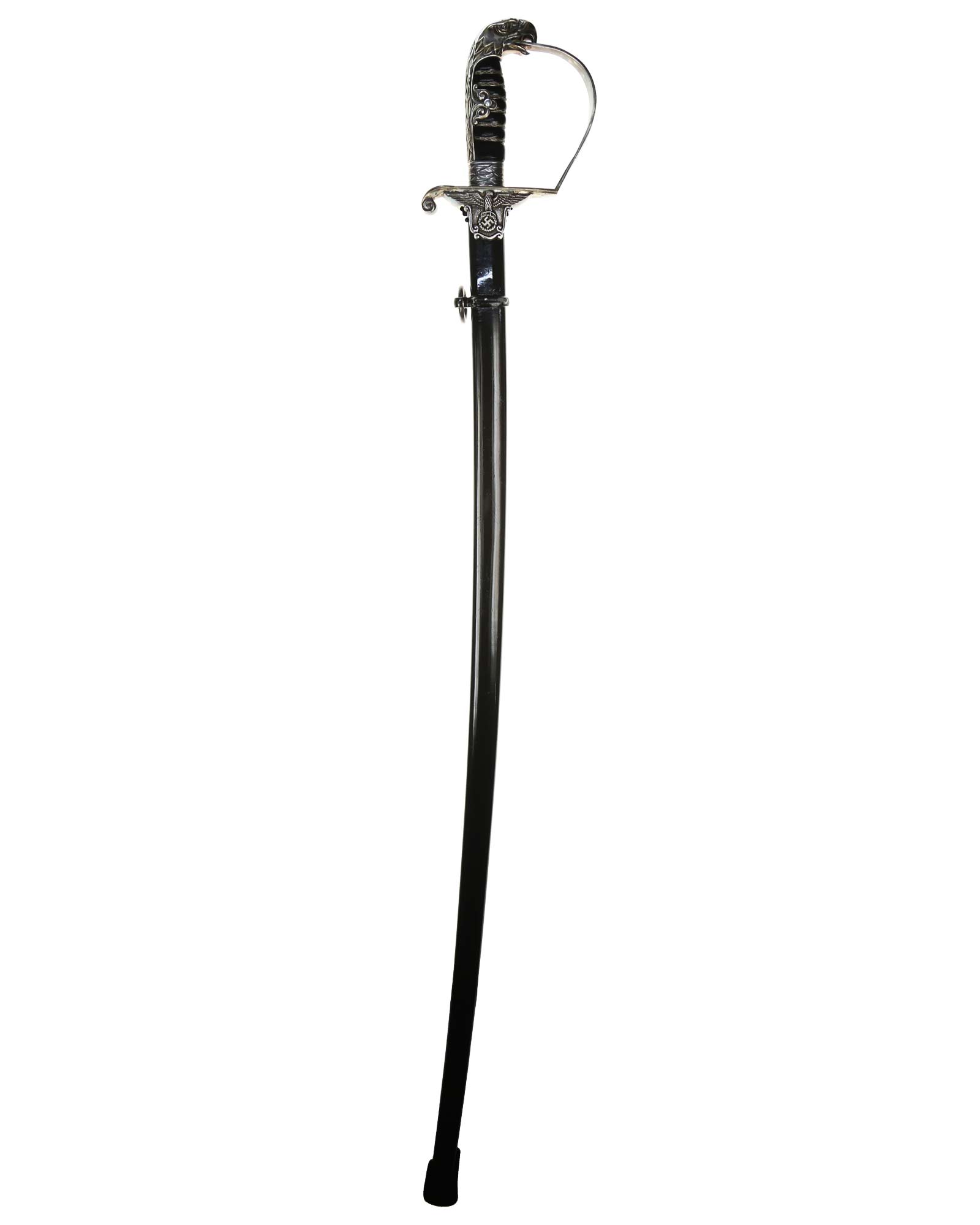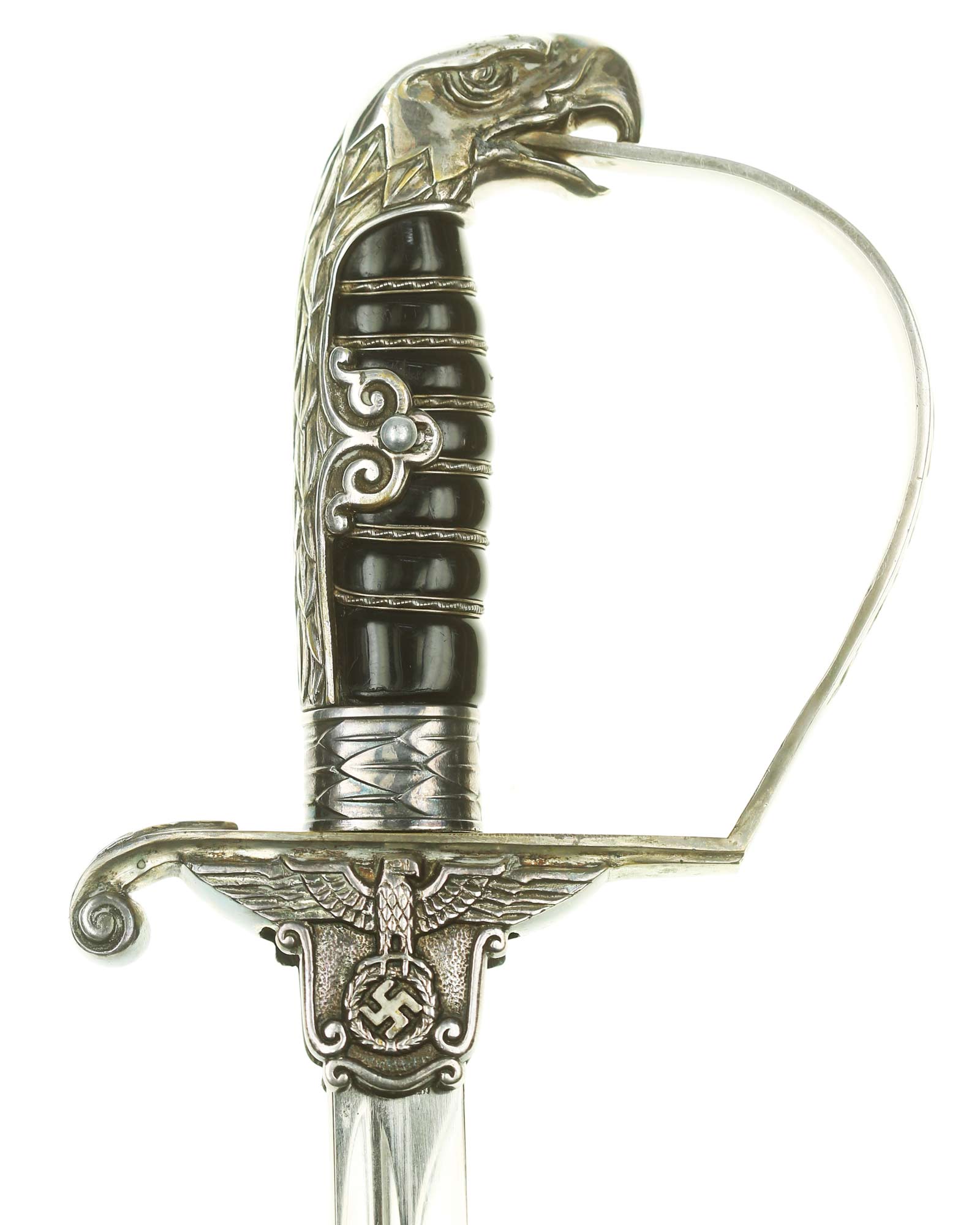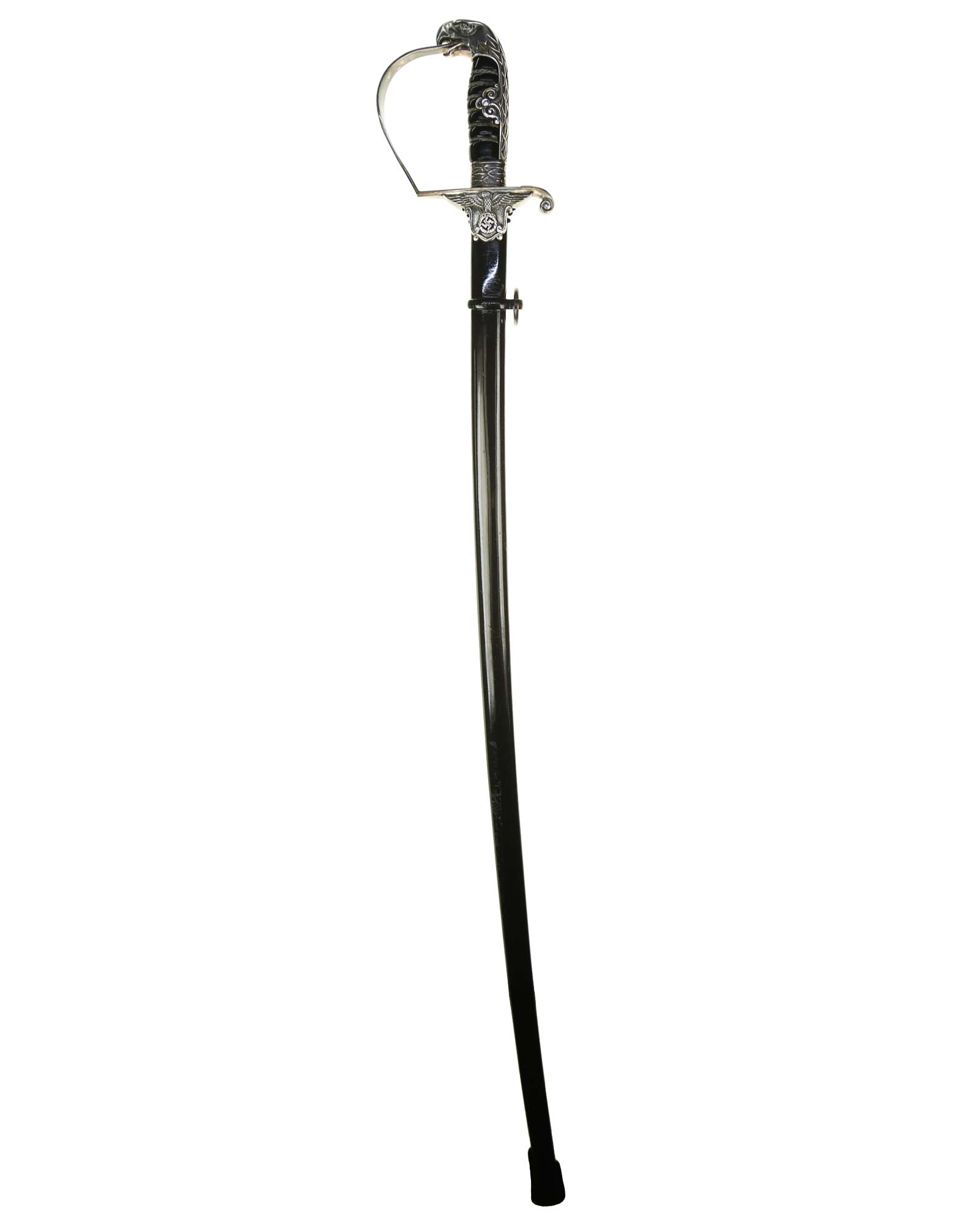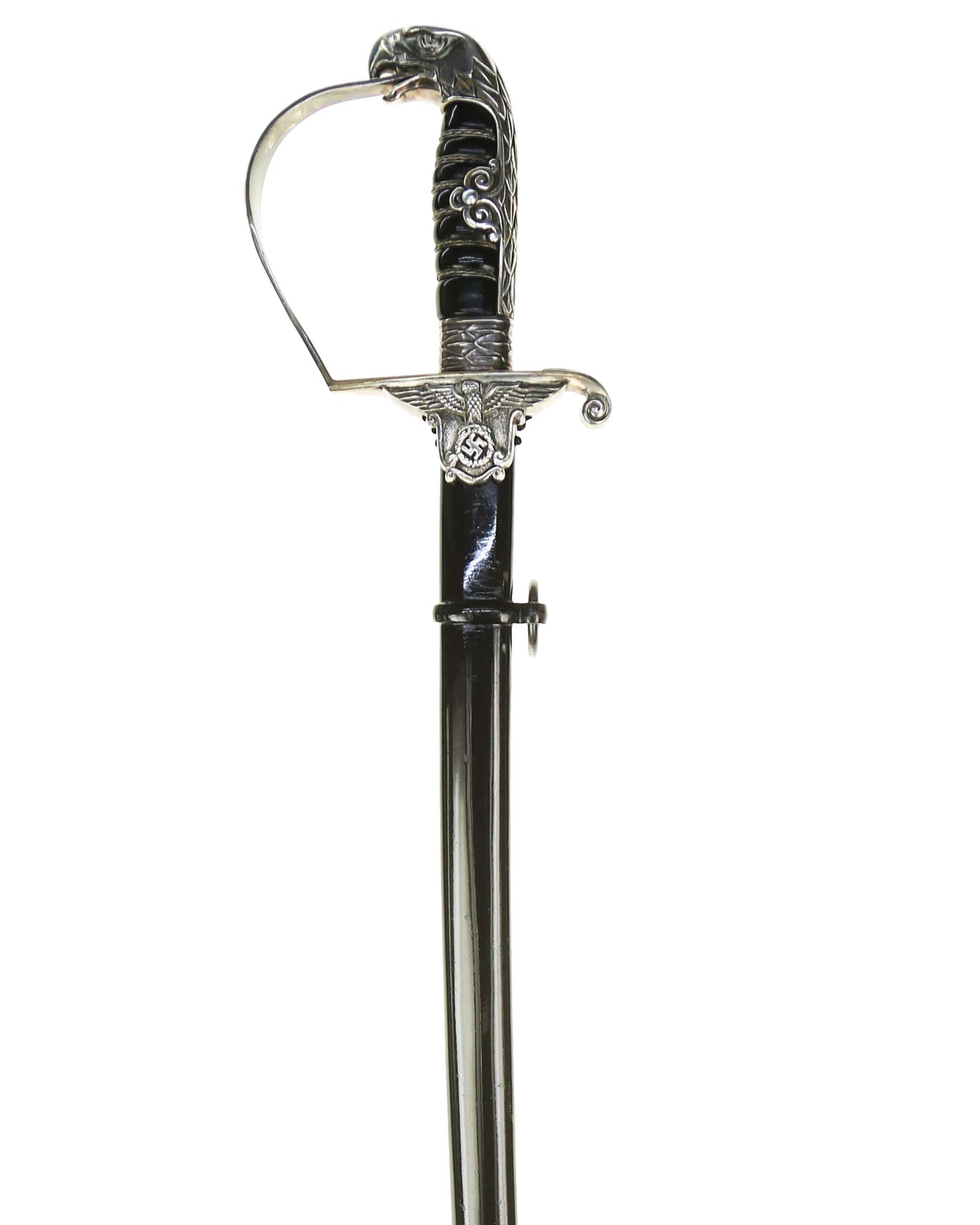 Sabre for judicial officers (model number 1763) manufactured by Carl Eickhorn Solingen. Nickel-plated blade with double-sided fuller. Silver-plated hilt with decoration, eagle head cap and black plastic grip. Black lacquered steel scabbard. Length approx. 107 cm.