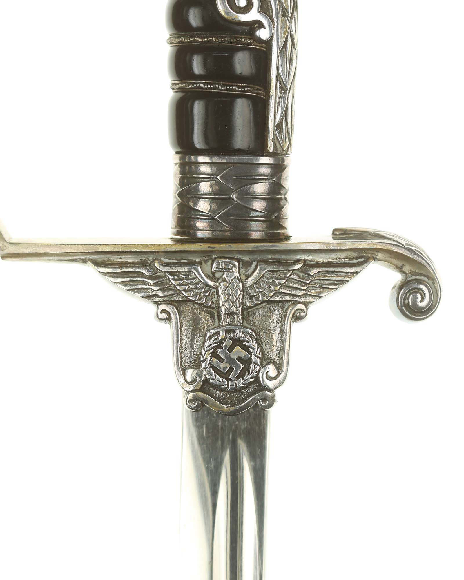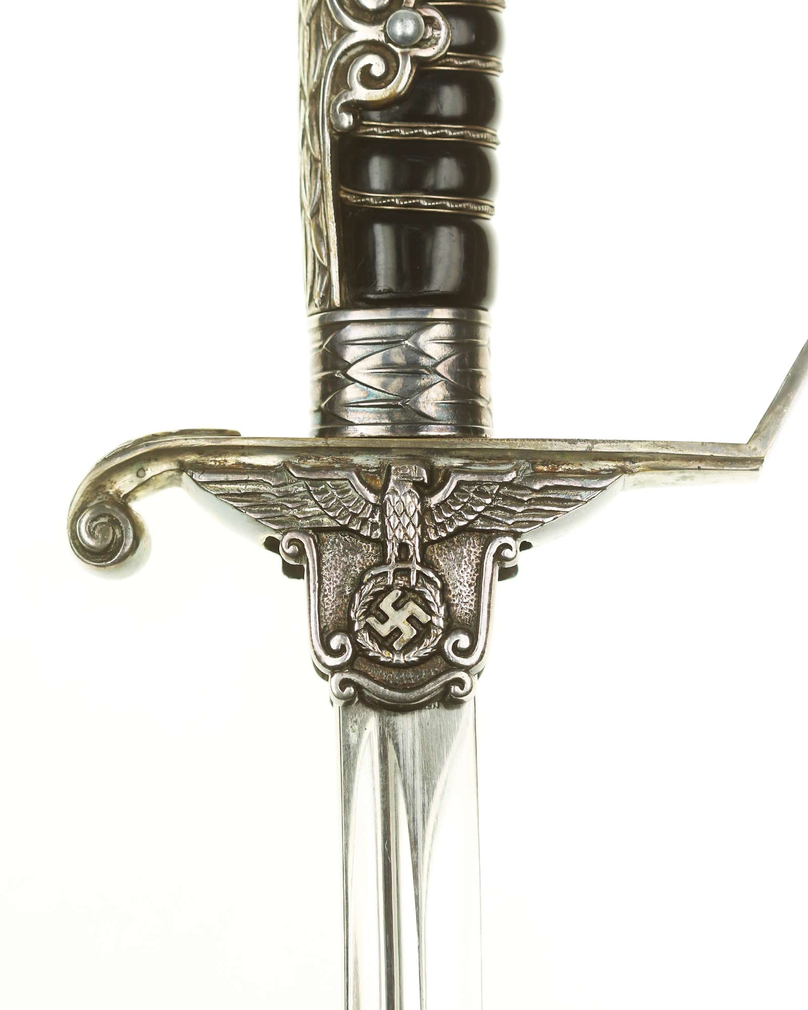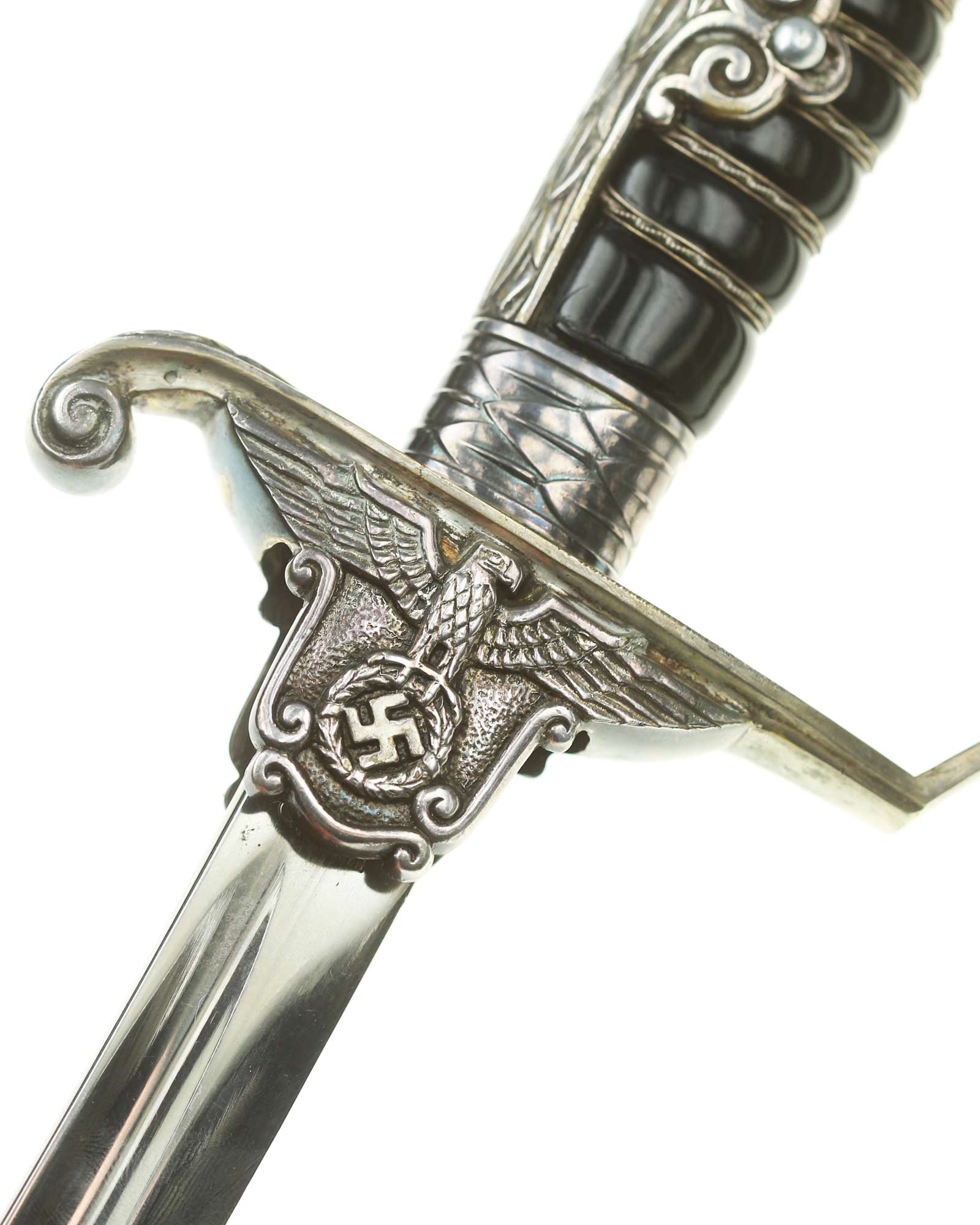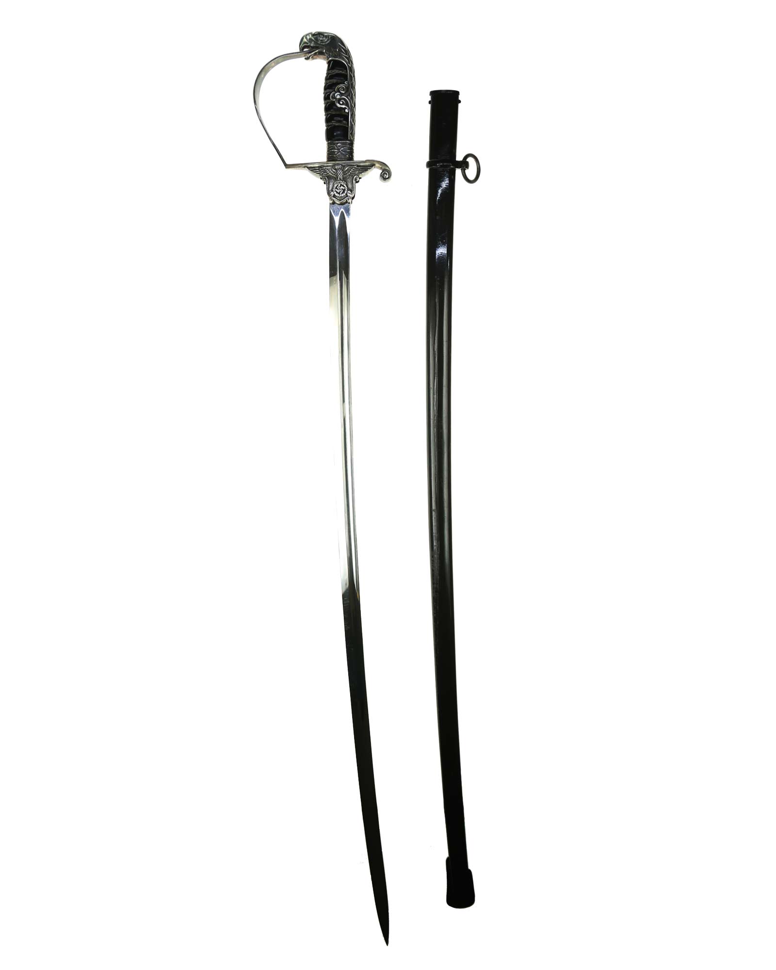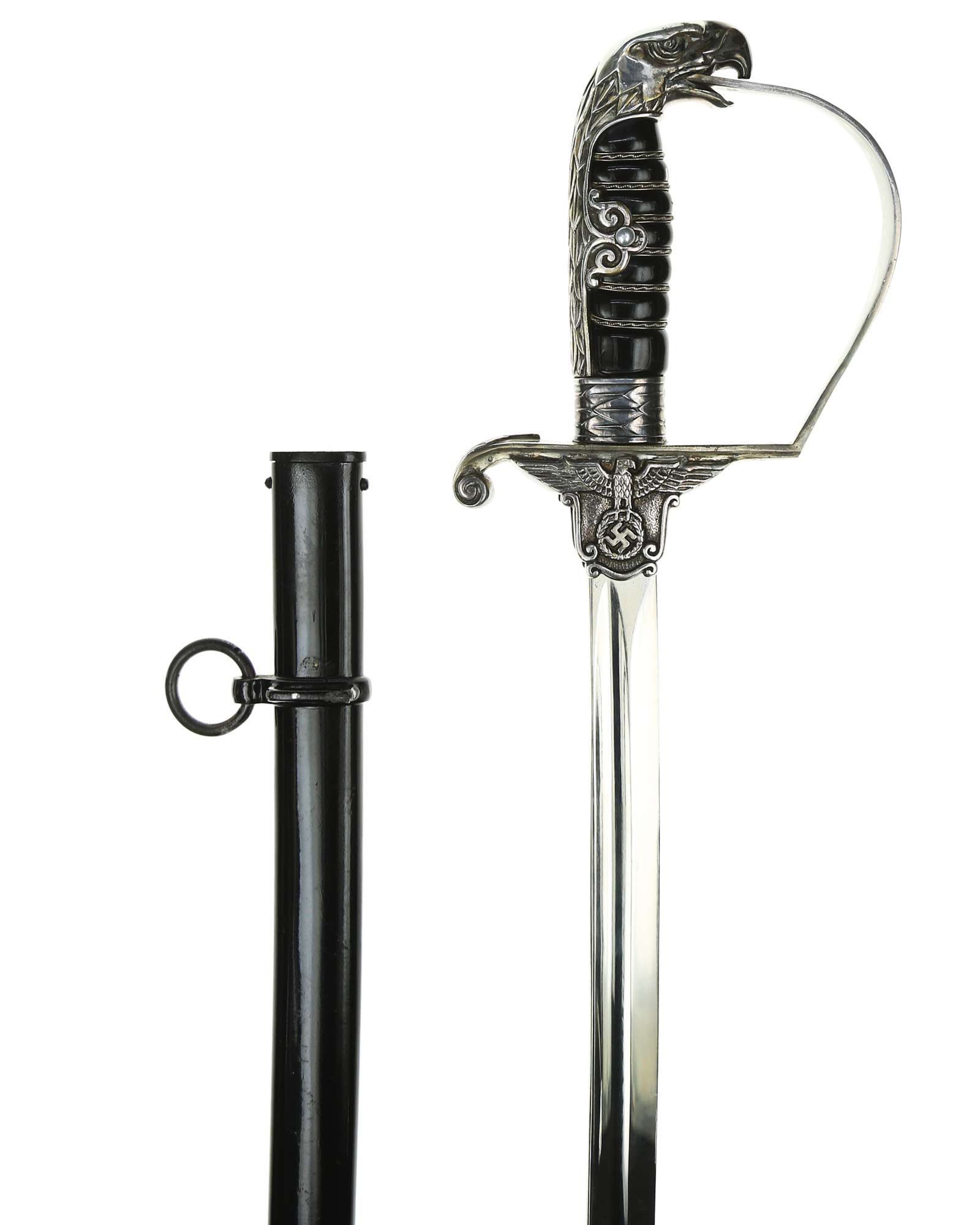 Sabre for judicial officers (model number 1763) manufactured by Carl Eickhorn Solingen. Nickel-plated blade with double-sided fuller. Silver-plated hilt with decoration, eagle head cap and black plastic grip. Black lacquered steel scabbard. Length approx. 107 cm.