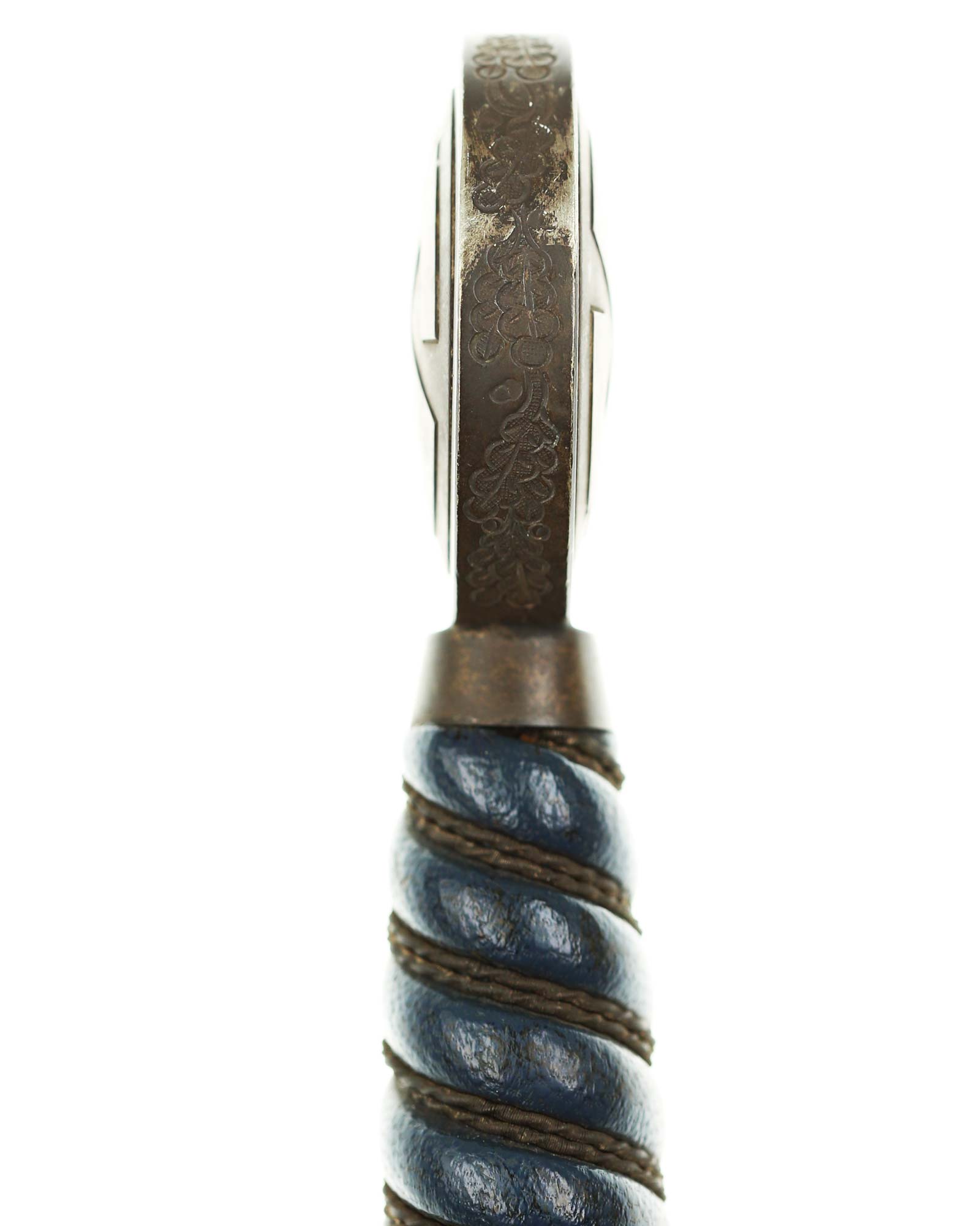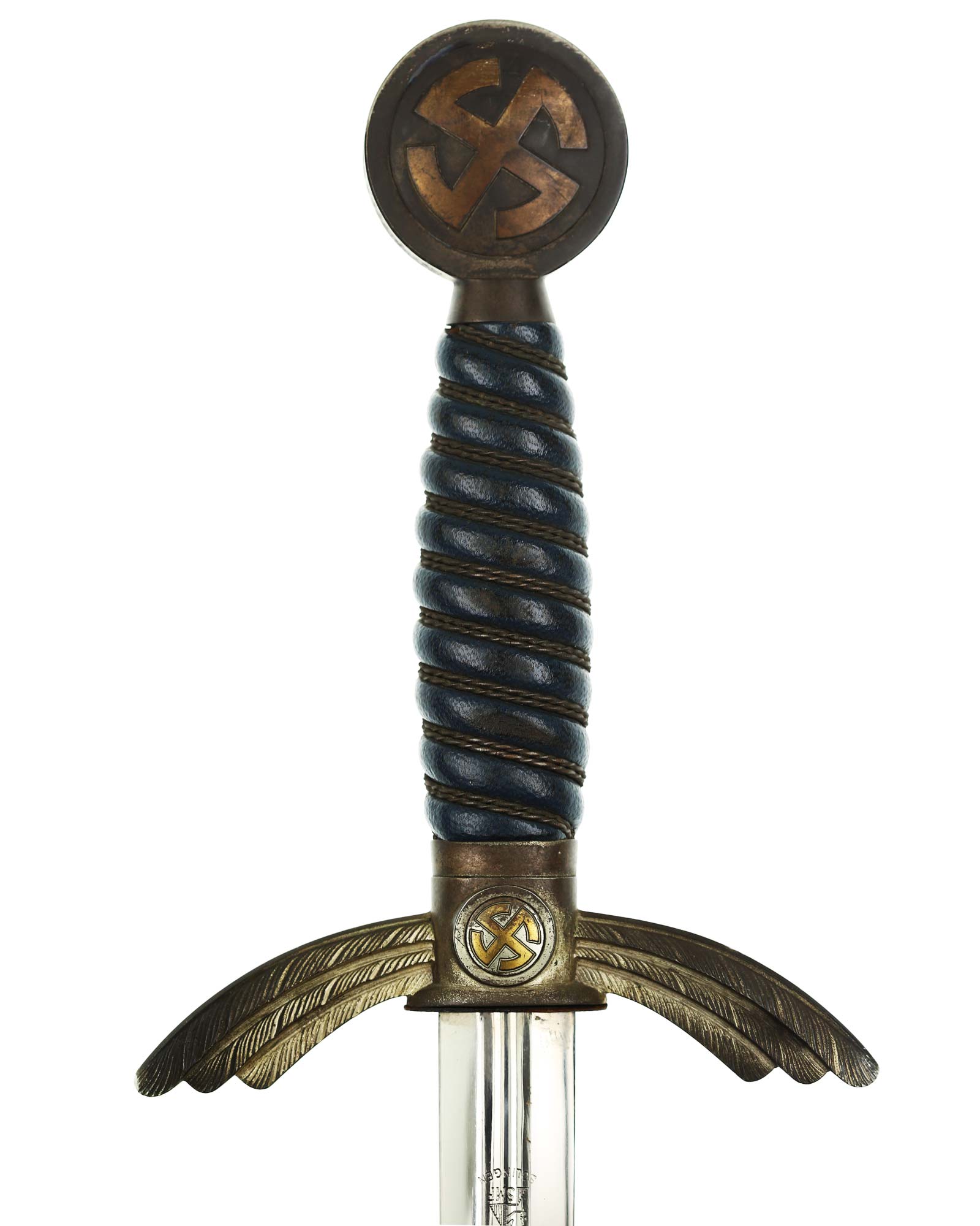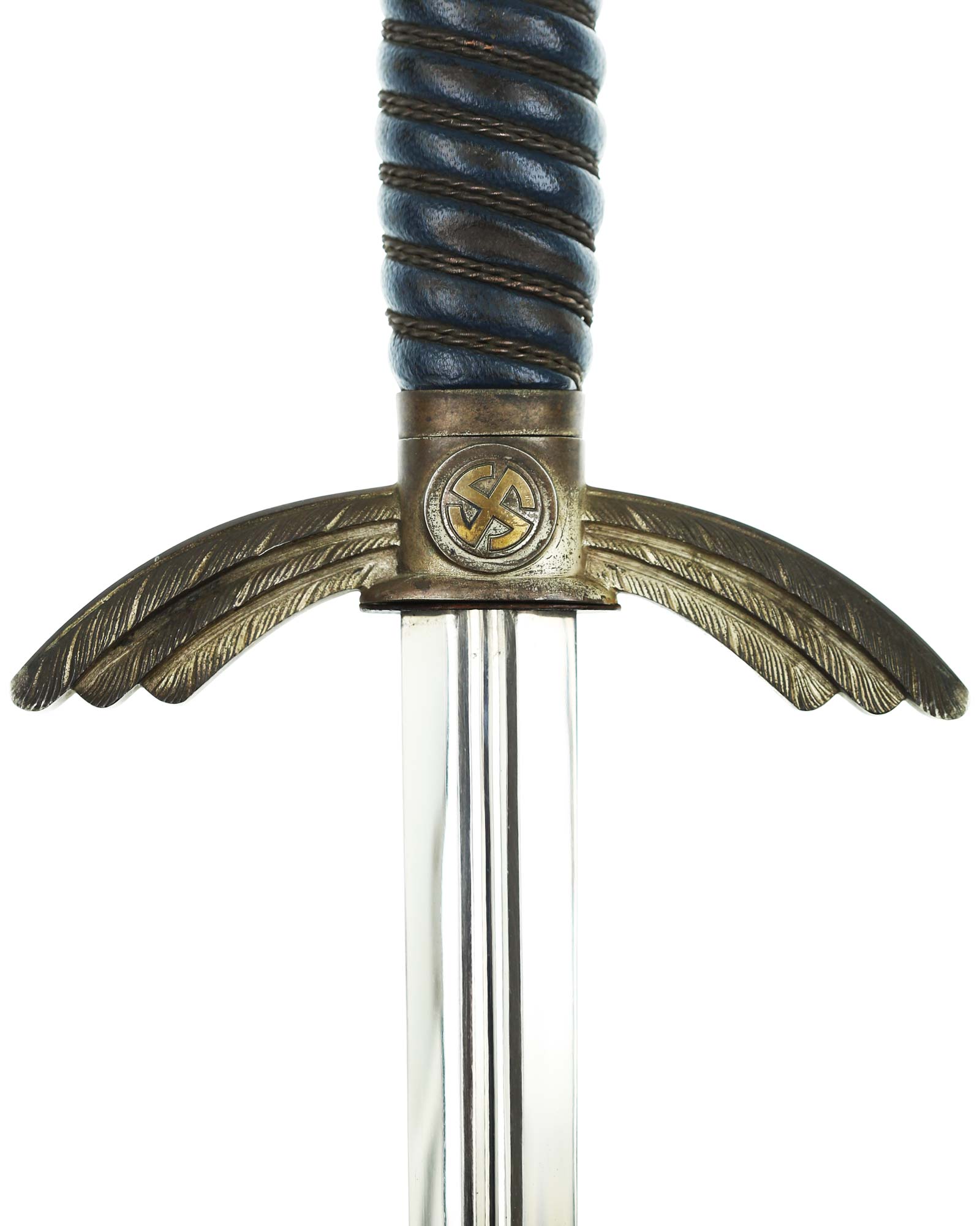 Grip: The grip is a carved wood base, and is covered with a fine blue Moroccan leather. The grip is tightly wrapped with springy copper wire. The pommel is an fine example, having no hits to the rim edges. The rim is stamped with a fine decoration of connected oak leaves and acorns, and it has the medallion insert style sun-wheel swastika. The crossguard has the same medallion inserts. The guard is the three section variety, which slopes downward and bears good, enhanced feathering.