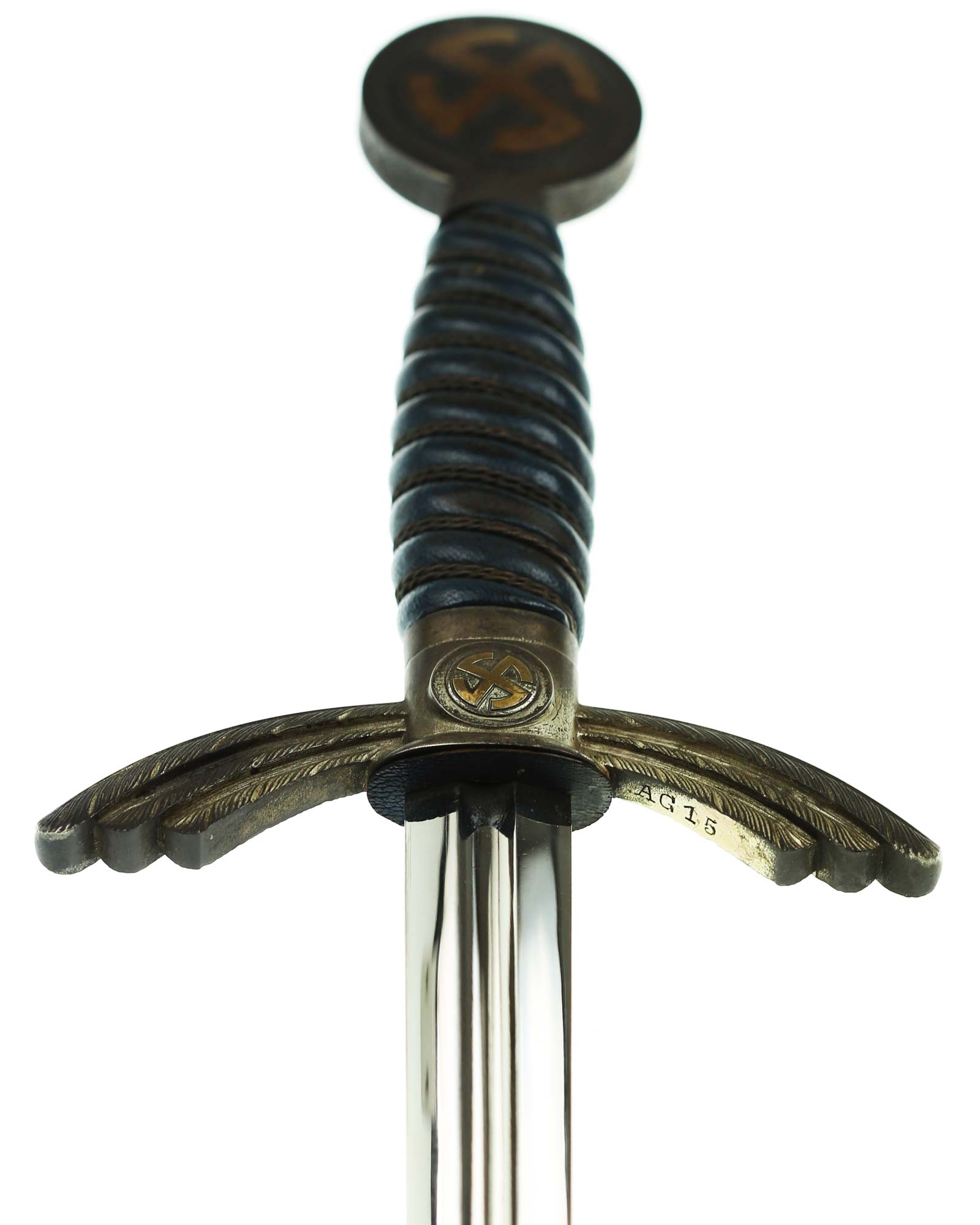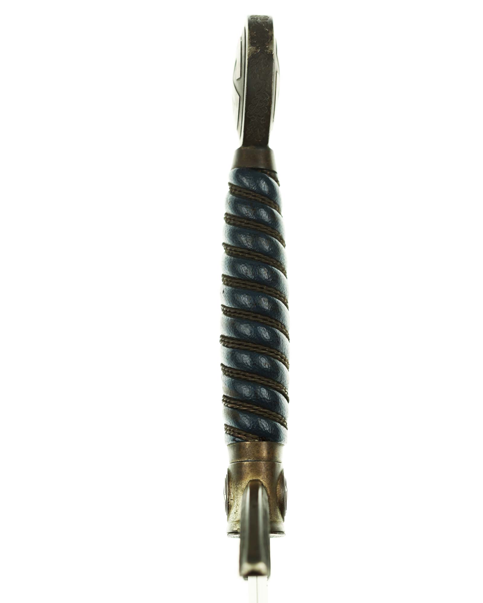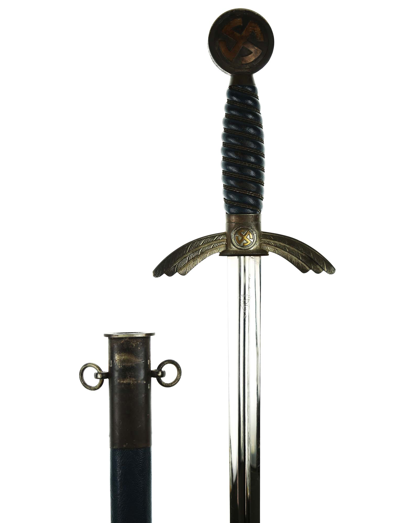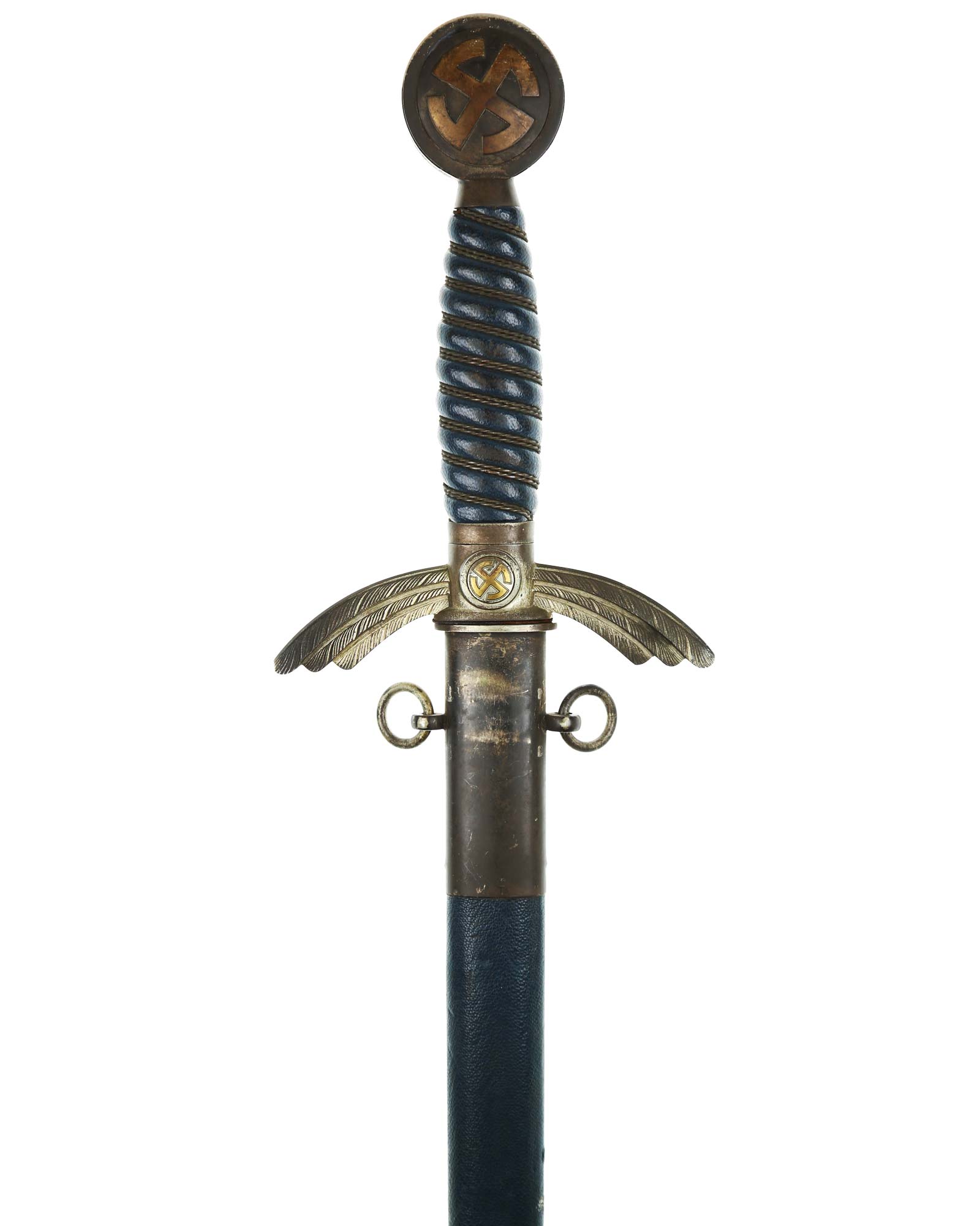Grip: The grip is a carved wood base, and is covered with a fine blue Moroccan leather. The grip is tightly wrapped with springy copper wire. The pommel is an fine example, having no hits to the rim edges. The rim is stamped with a fine decoration of connected oak leaves and acorns, and it has the medallion insert style sun-wheel swastika. The crossguard has the same medallion inserts. The guard is the three section variety, which slopes downward and bears good, enhanced feathering.