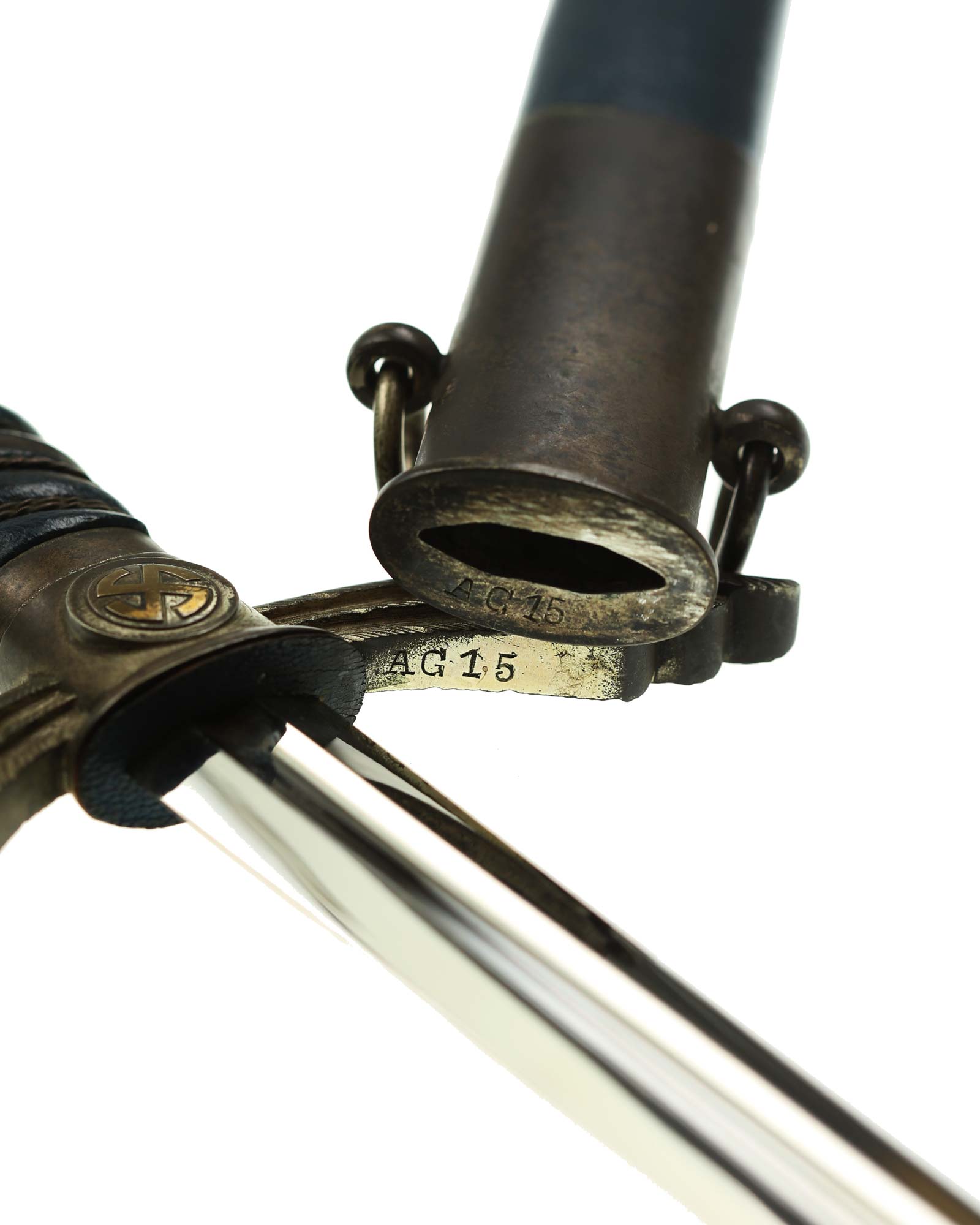 Blade: The blade of this piece is a real beauty, being in stone Mint condition, with highest quality nickel-plated surfaces. It is marked on the reverse ricasso, “SMF Solingen”. Above the trademark is a waffenamt, consisting of a stickbird with a number “5” visible in his belly. The original blue leather blade washer is in place, in good condition and showing only minor wear.