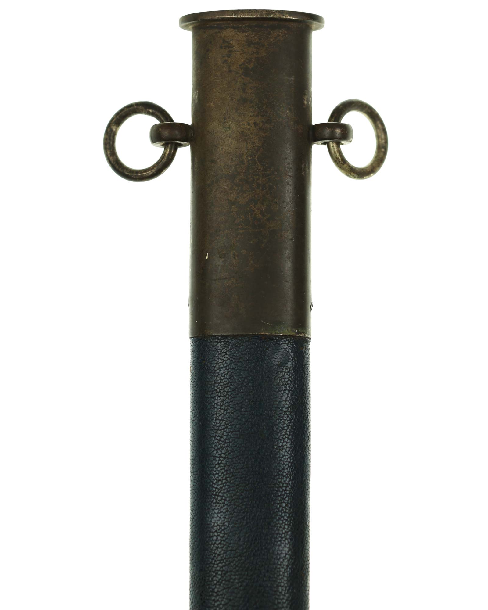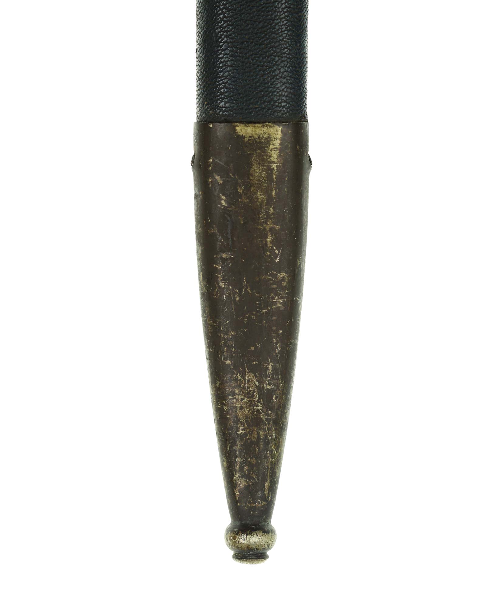 Scabbard: The scabbard shell of this piece is straight throughout, and is also covered in Moroccan leather. The obverse of this scabbard is in fairly good condition, showing no scuffs to the leather, while the reverse, despite some age and signs of wear, is in a decent state. The scabbard mounts are the matching nickel-silver types, in good condition. They are retained by headless side screws.