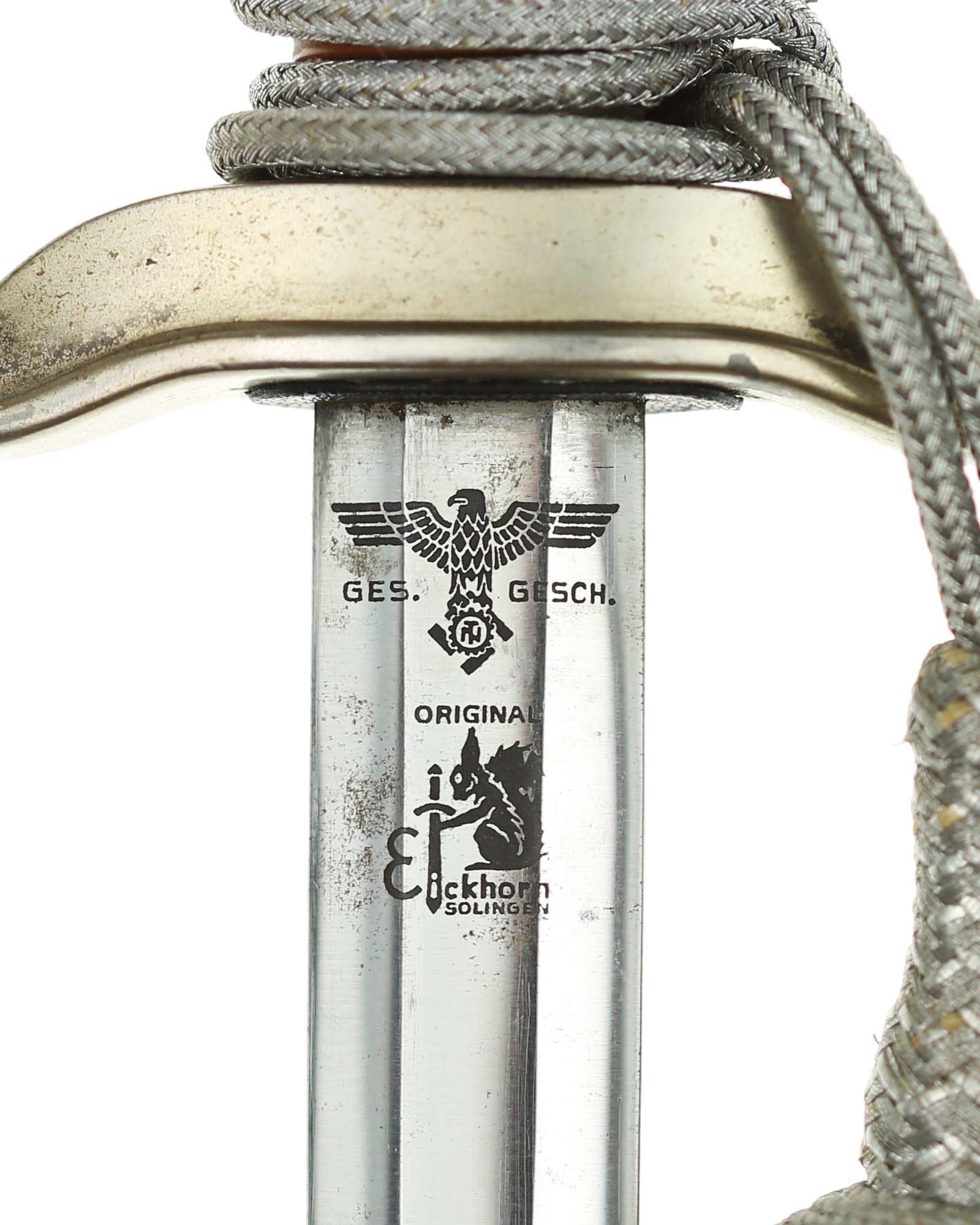 Blade: The blade is a fine example. The obverse ricasso is etched with the number “1454” which matches the stamping on the scabbard throat. The reverse ricasso is etched with a TeNo eagle, being the same as the example on the guard, and having the protected patent term, “Ges. Gesch” on with side of the talons. Beneath the eagle is the Eickhorn 1935-1941 trademark. This trademark consists of a squirrel holding a downward pointing sword, beneath the word “Original”. Beneath the rodent is the name and location of the firm, “Eickhorn Solingen”. The original leather blade buffer is in place.