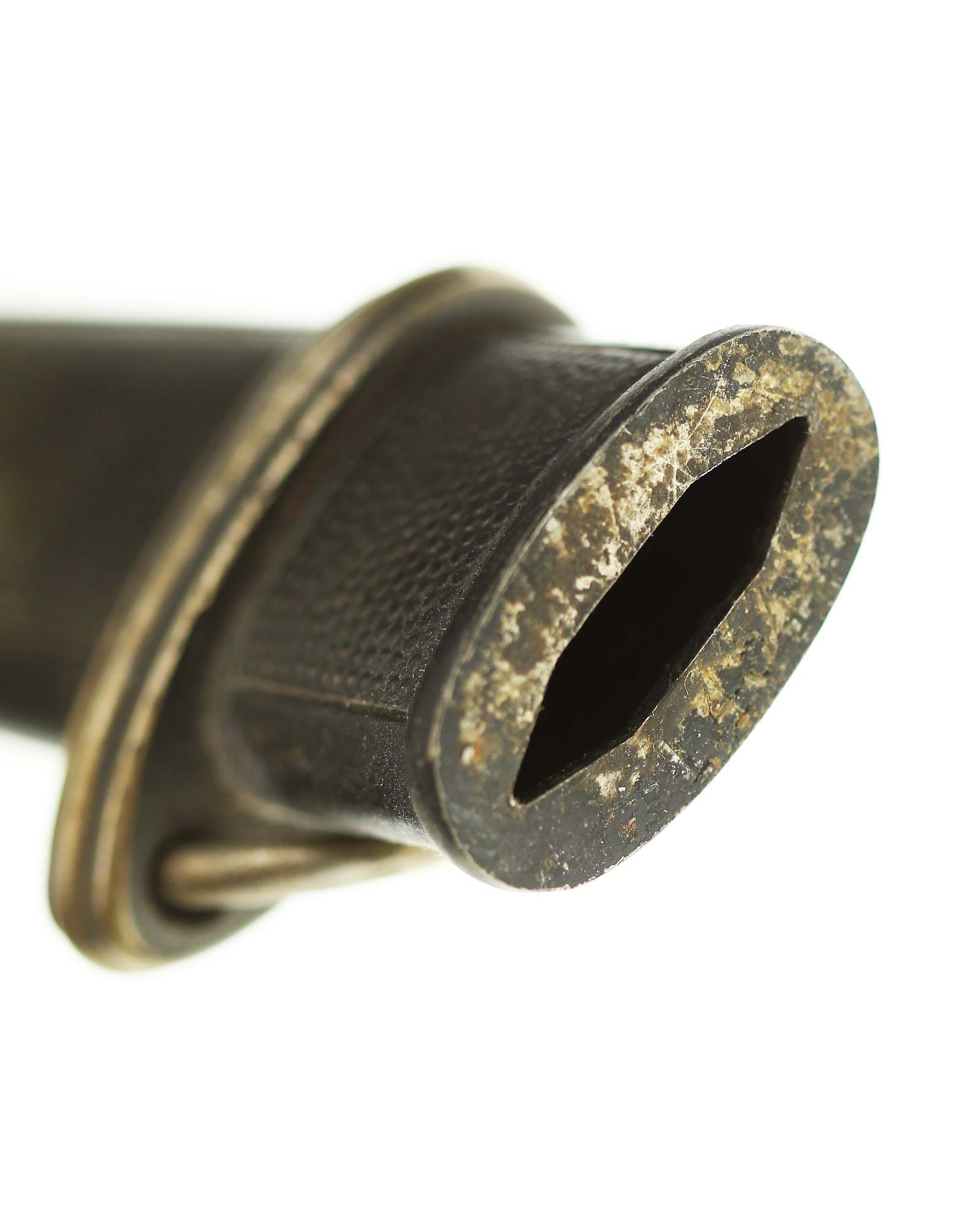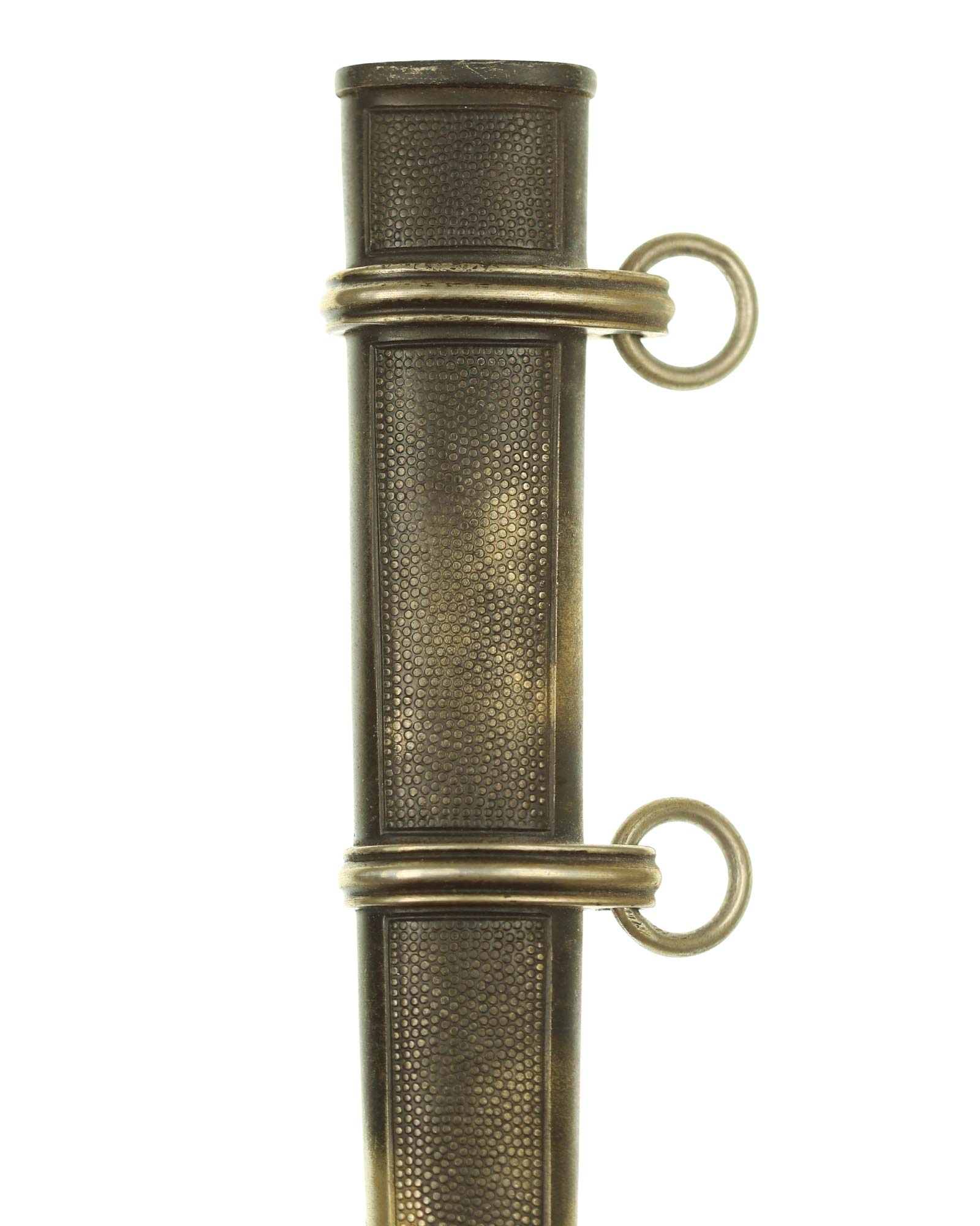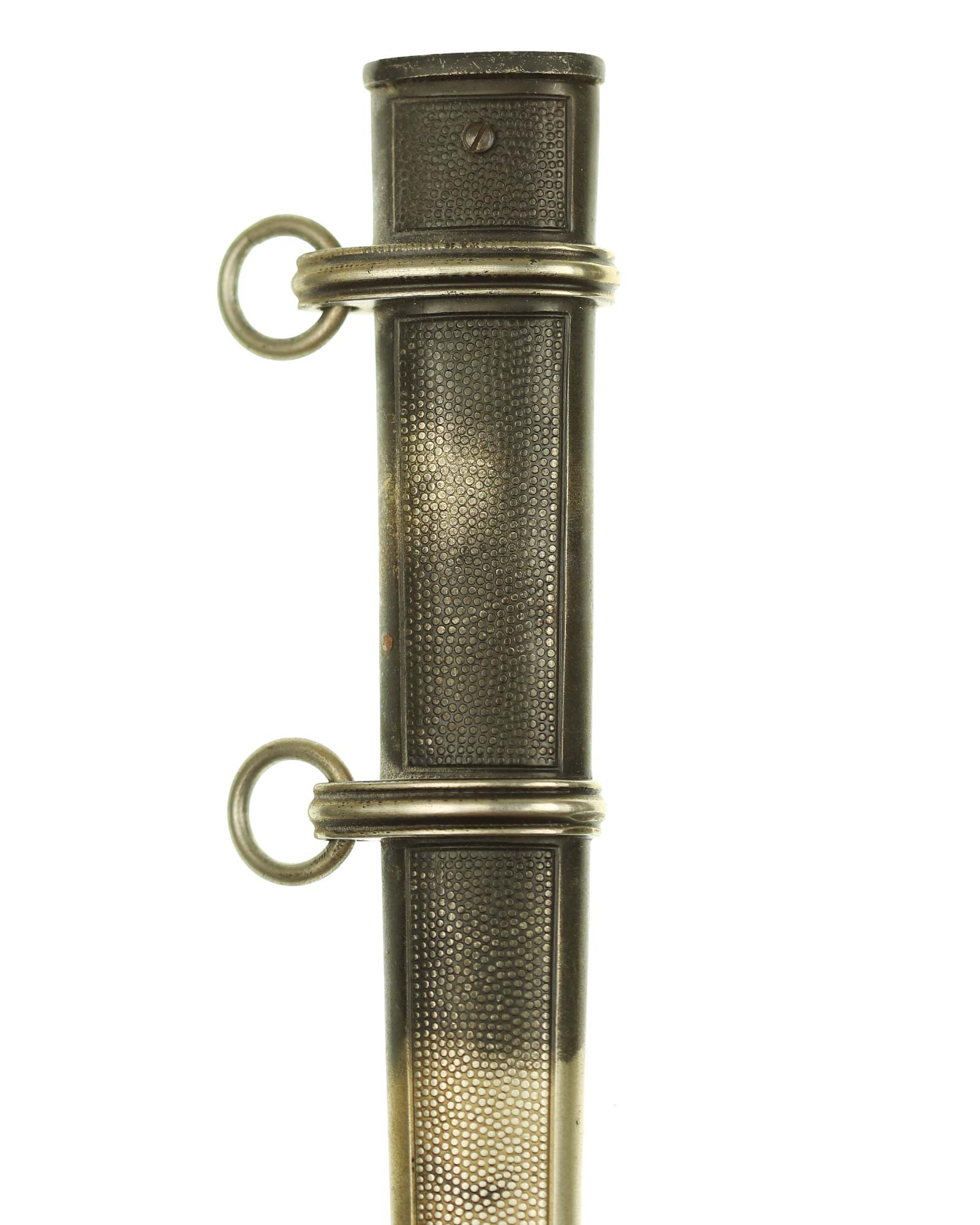 Scabbard: The scabbard has about 95% of the original blackening it the pebbled panels. These panels are still crisp throughout. There is also blackening on the decorative lines on the carrying bands, as well as on the details of the lower chape fitting. The throat is the typical thick Eickhorn style, which is retained by a center-placed screw on the reverse. The throat is etched with the serial number, “1454”.