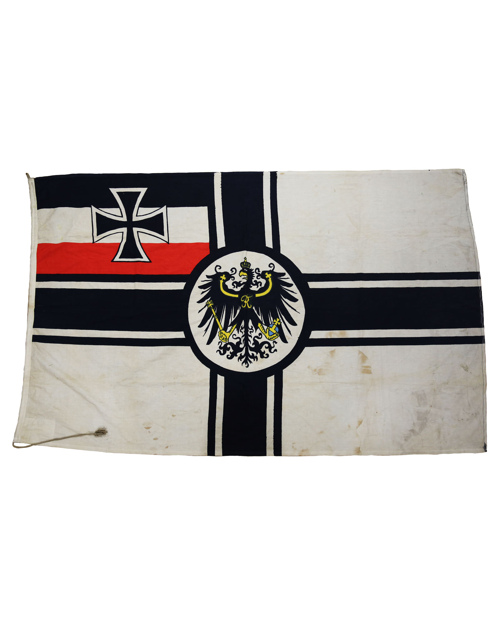 This is a EXC+ war flag with attaching ropes. This is a 1,20 m x 1,90 m printed wool flag. After Germany had lost World War I in 1918, Germany became a republic. The new "Weimar Republic" began to change all national colors and symbols. The National flag was altered, and henceforth displayed the colors Black-Red-Yellow (Gold). On September 27, 1919, a new War Flag was adopted. It resembled the old Imperial War Flag, but of two differences: The Prussian eagle was replaced by the new republican design and the new national colors were displayed in the upper left corner.