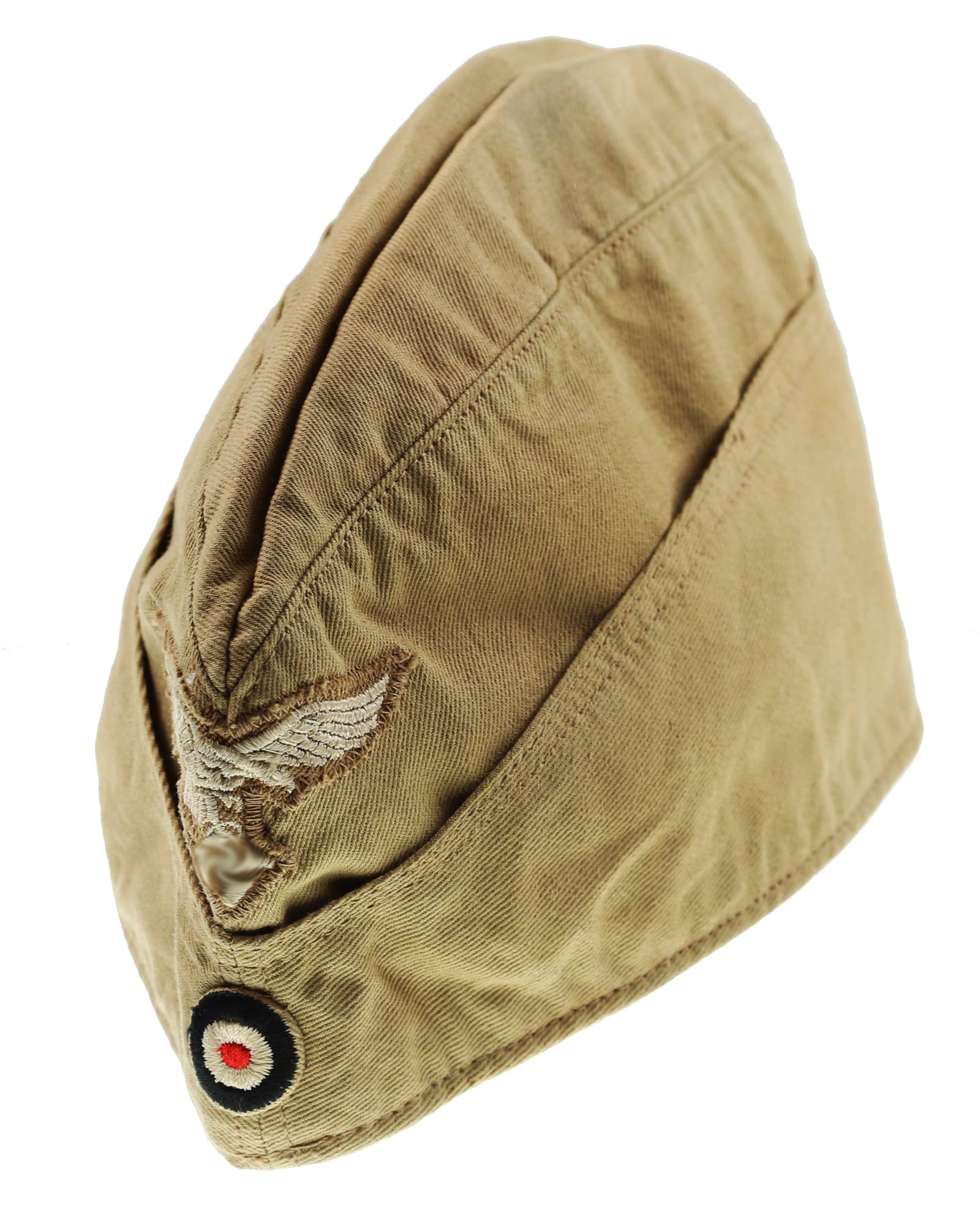 German Luftwaffe Tropical Side Cap, know as "Schiffchen". Maker stamped "BULAG 1942". German Afrika Korps Feldmutze complete with its original machine stitched correct pattern tropical insignia. Size marked 57.