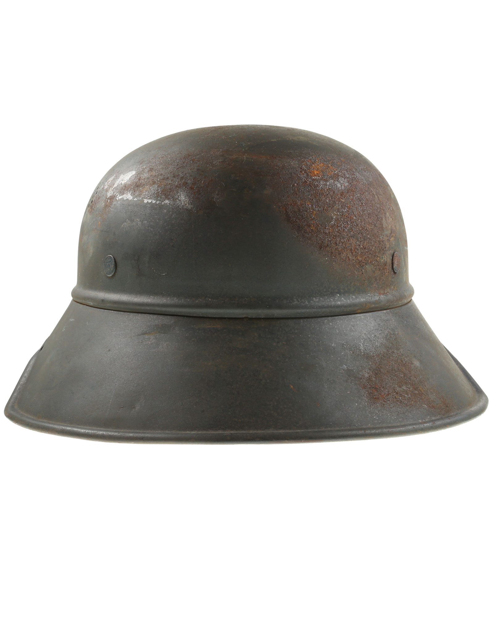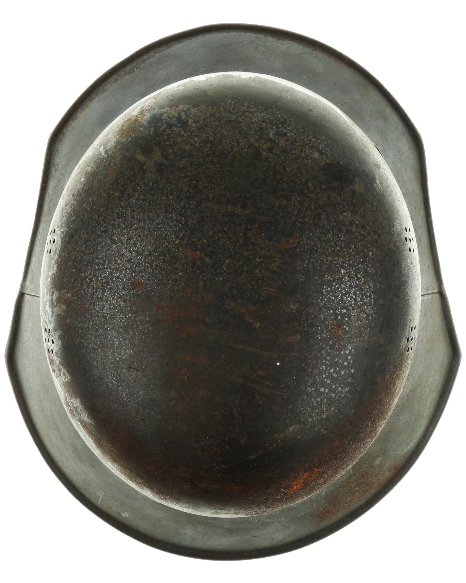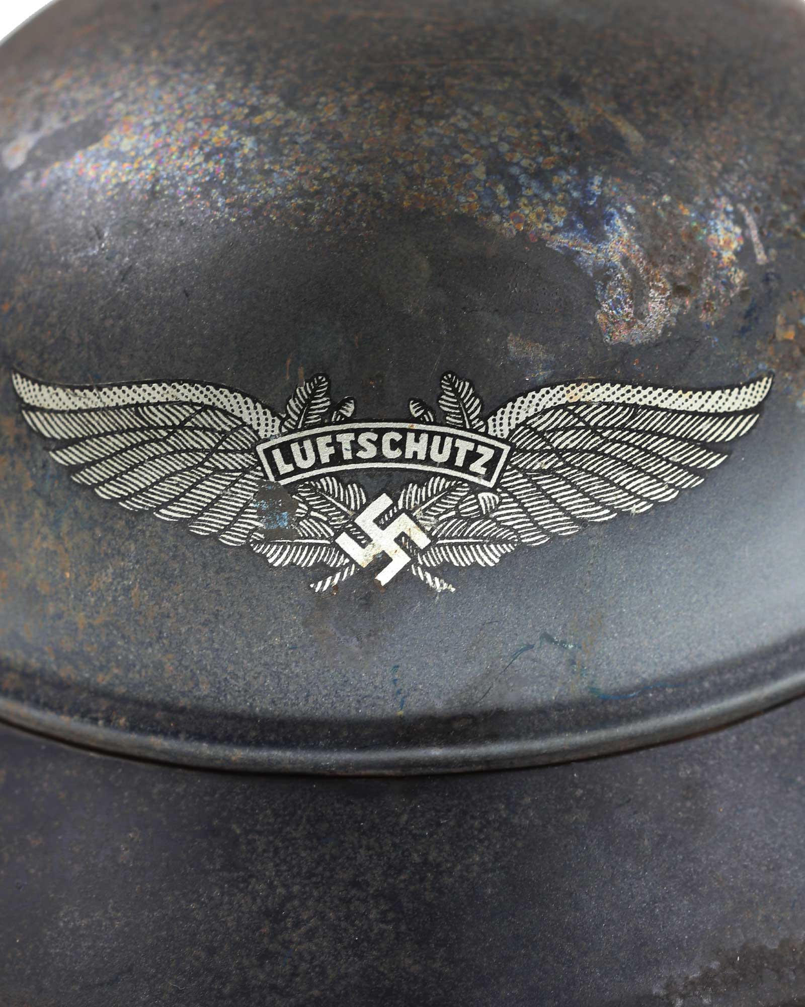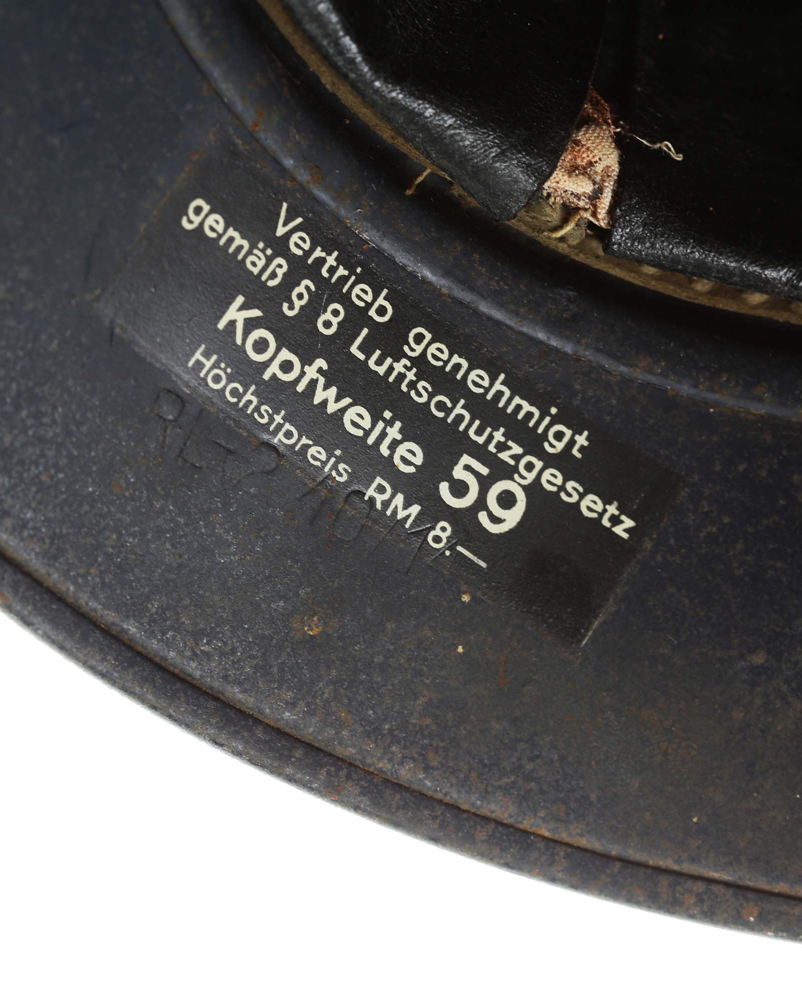 German M38 Luftschutz Helmet - Steel helmet, magnetic, original RLB blue painted exterior. This is a three piece M38 type Luftschutz helmet, the helmet is in exc+ condition, complete with liner and leather chinstrap. The helmet is size '59' marked. The helmet retains most of its blue-grey paint, the Luftschutz decal is placed on front and is present for about 95%. The reverse interior neck guard apron is marked: 'RL2-40/14 - E. Martin Scheithauer KG, Zwönitz Sachsen'. Measures 313 x 272 mm, in EXC+ condition.