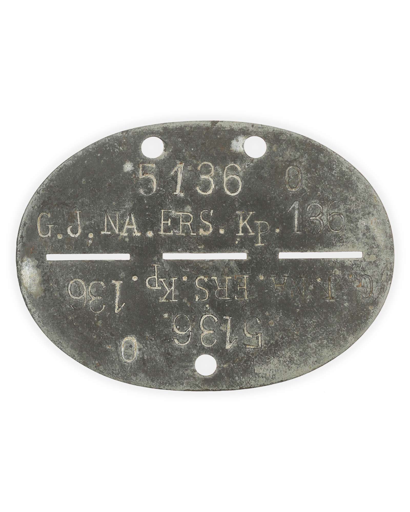 (Heer Erkennungsmarke). Constructed of zink, stamped with “5136 0” and “G.J. NA. ERS.KP. 136”, with three loops for suspension, measuring 71 x 51 mm, in EXC+ condition.