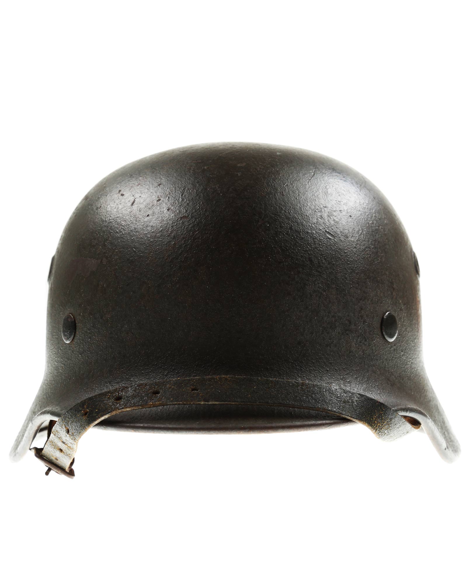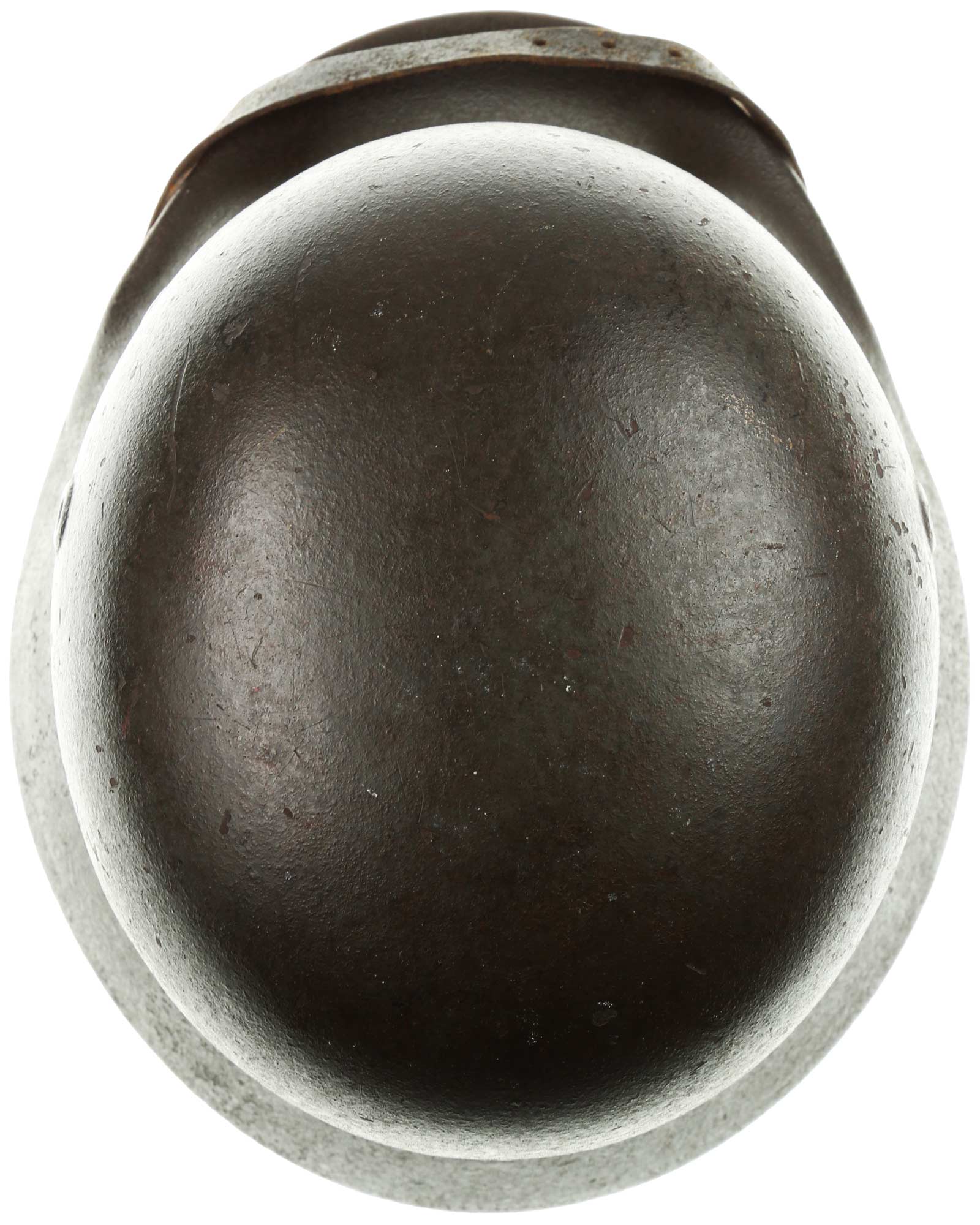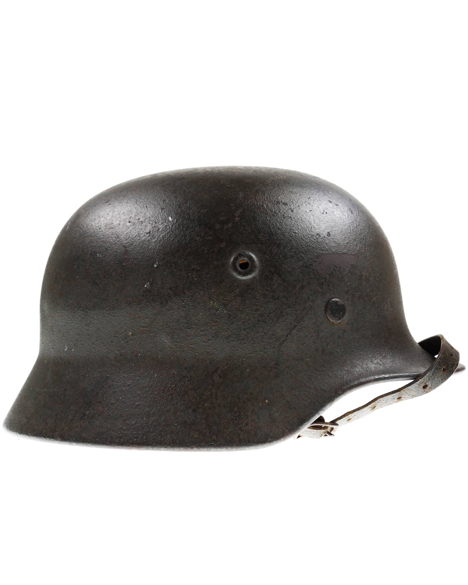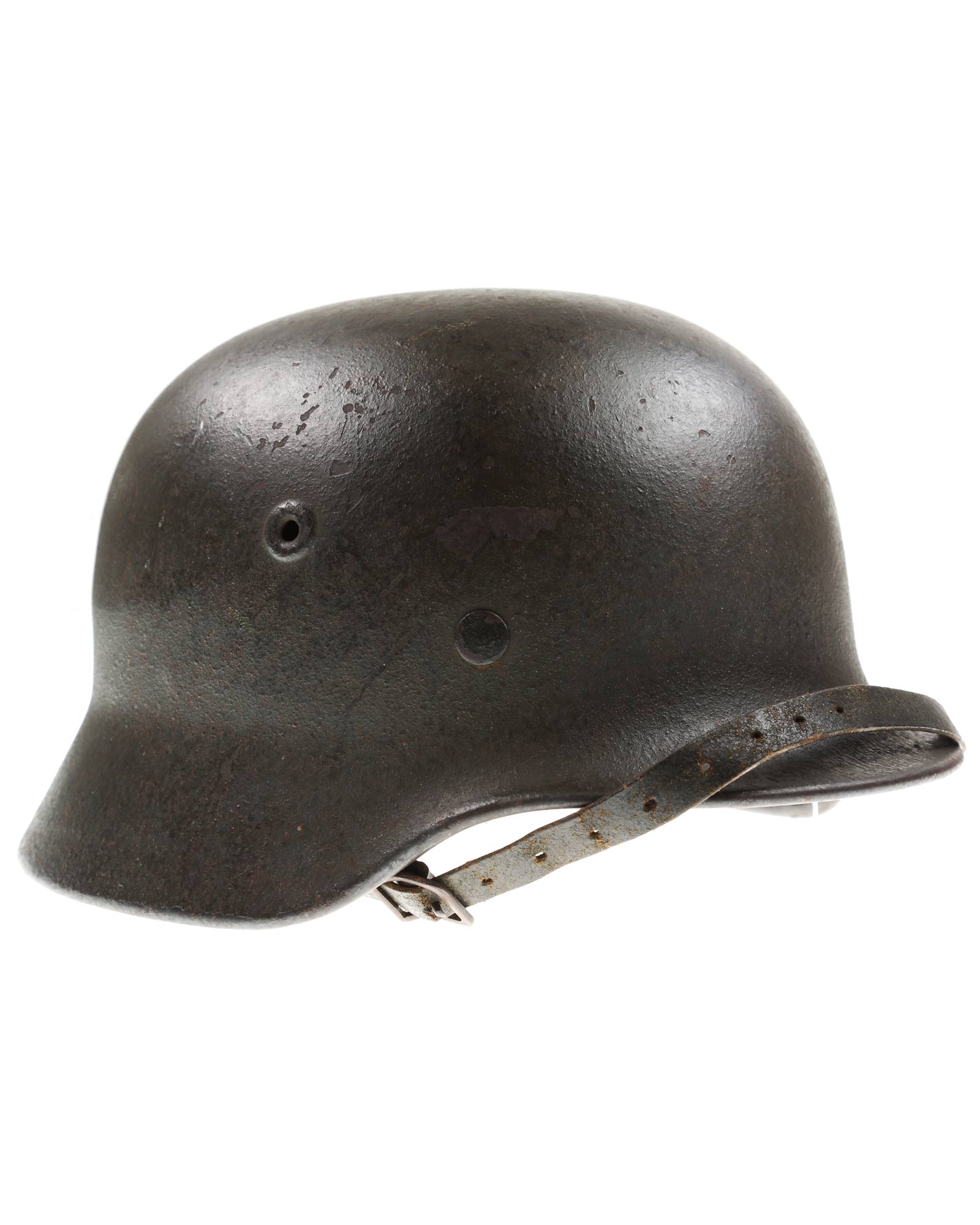 German M40 Kriegsmarine Helmet - Steel helmet, magnetic, original field gray painted exterior, the gold-coloured Navy (Kriegsmarine) insignia on the left side exhibiting a pair of scuff marks. The inside comes complete with its original eight-panel leather liner, stitched together at the rear, each panel with five ventilation holes, a reinforced hole on the end of each panel with leather reinforcing rings on the undersides, for the feeding of the drawstring. The leather chinstrap is affixed to the liner's steel frame. The underside of the skirt is stamped "Q6 DN19". Measures 283 x 230 mm, in EXC+ condition.