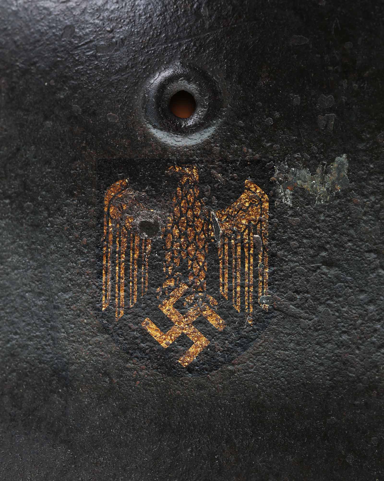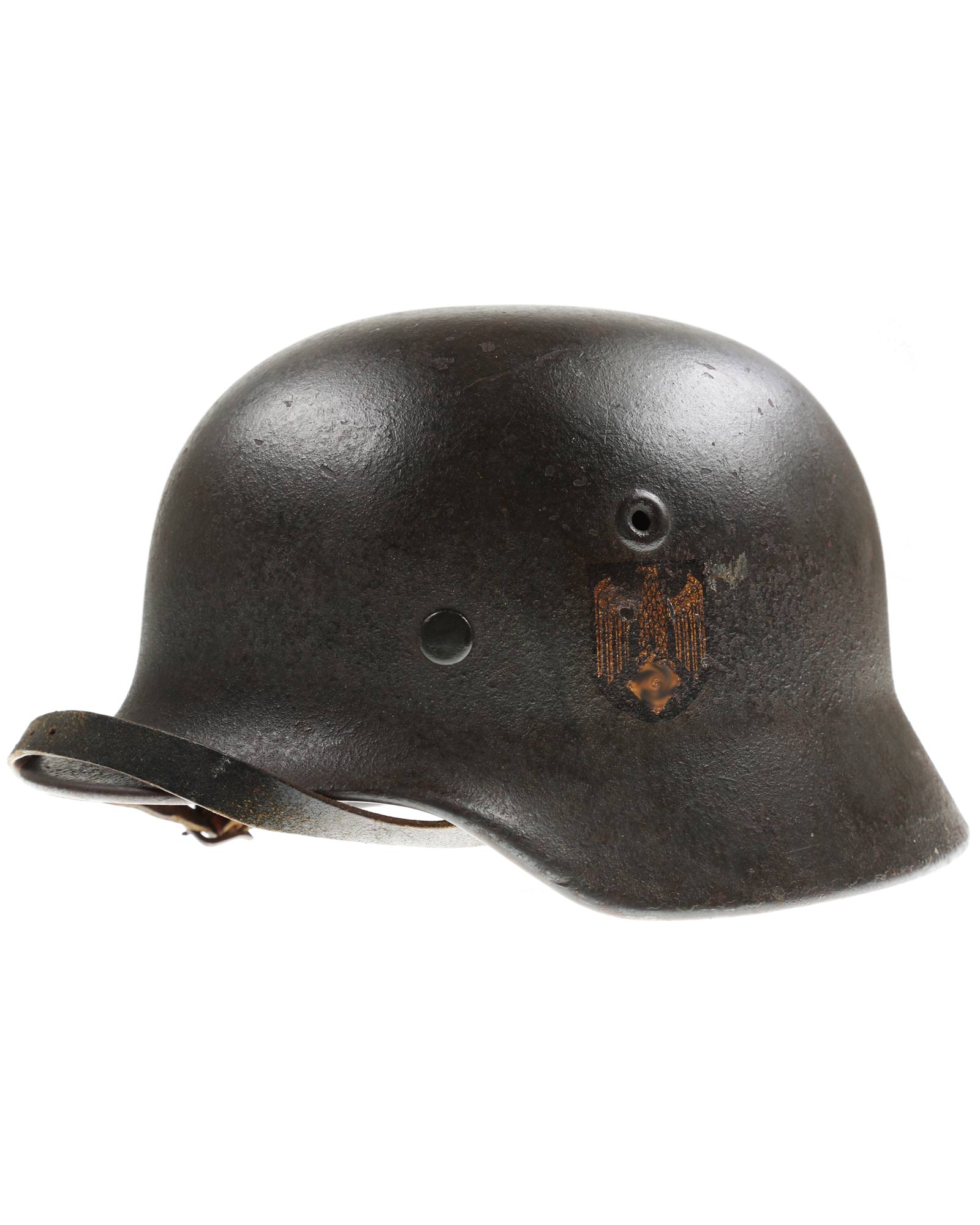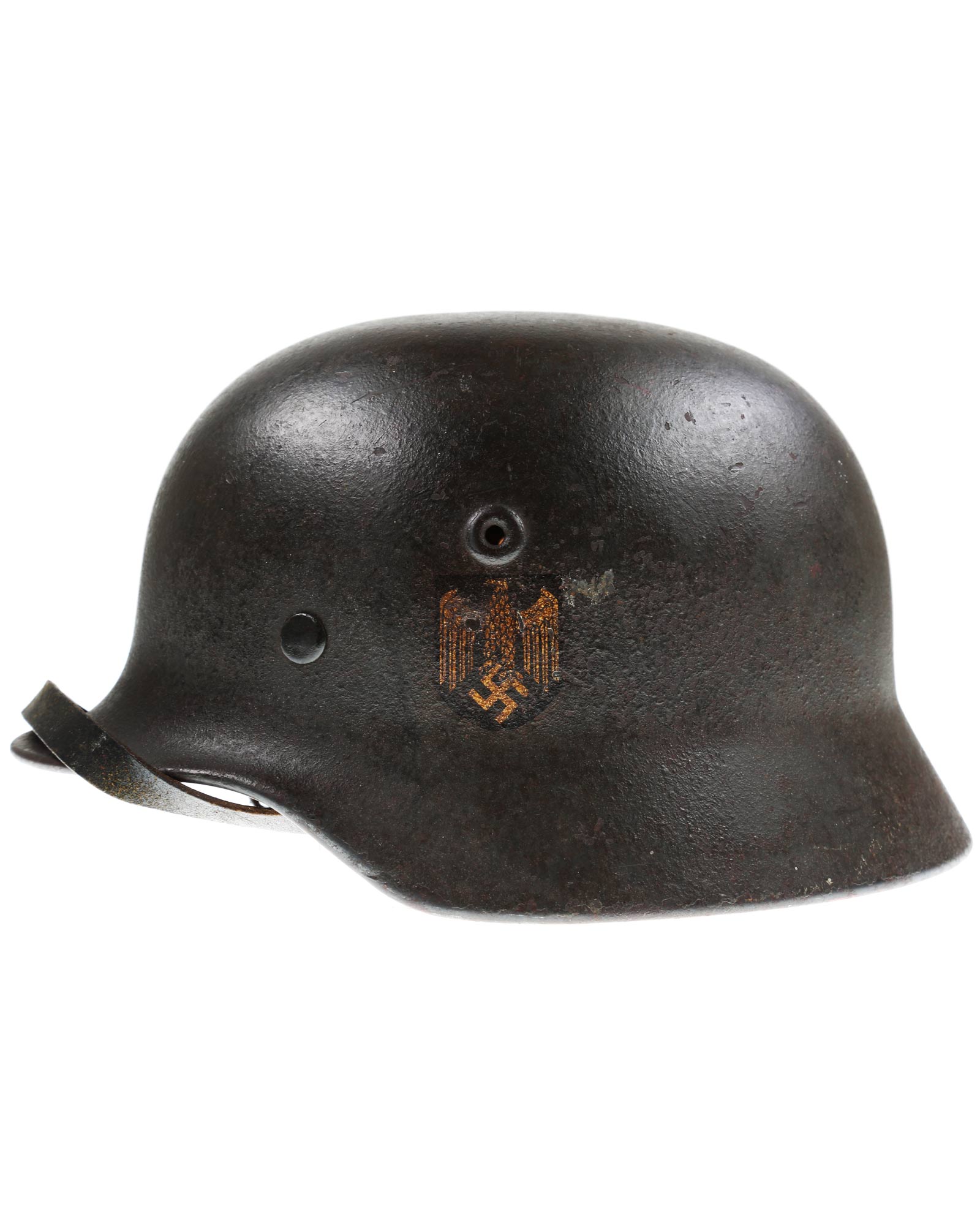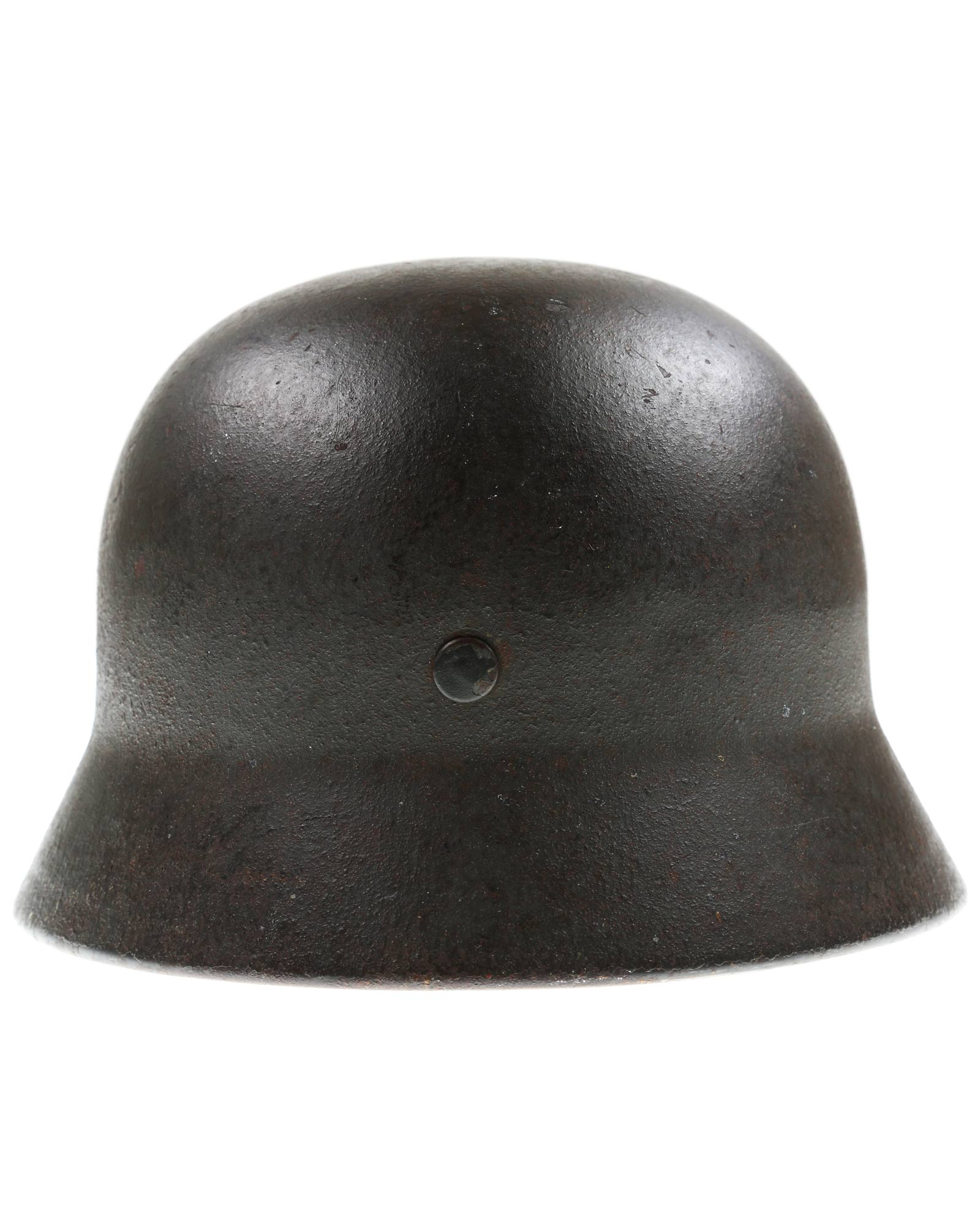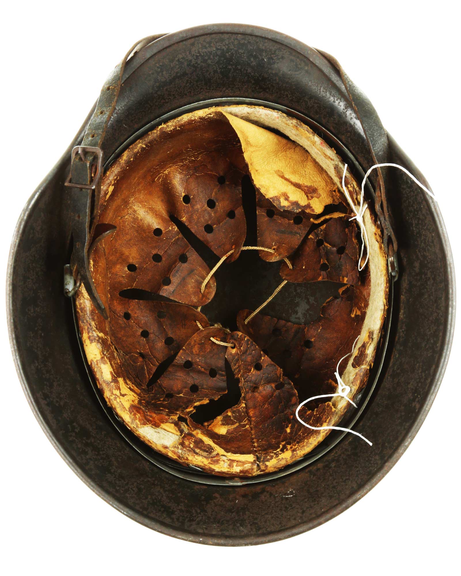 German M40 Kriegsmarine Helmet - Steel helmet, magnetic, original field gray painted exterior, the gold-coloured Navy (Kriegsmarine) insignia on the left side exhibiting a pair of scuff marks. The inside comes complete with its original eight-panel leather liner, stitched together at the rear, each panel with five ventilation holes, a reinforced hole on the end of each panel with leather reinforcing rings on the undersides, for the feeding of the drawstring. The leather chinstrap is affixed to the liner's steel frame. The underside of the skirt is stamped "Q6 DN19". Measures 283 x 230 mm, in EXC+ condition.