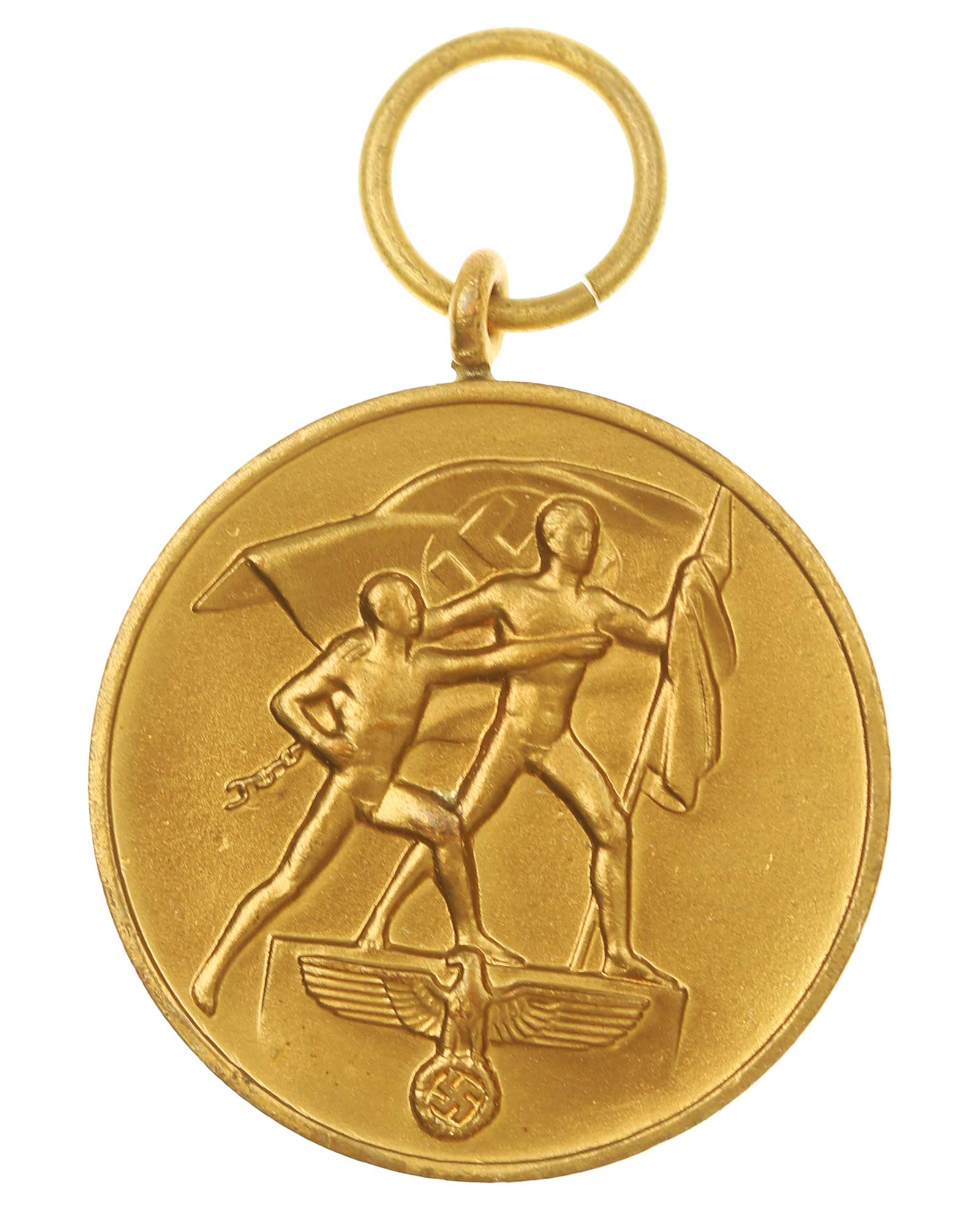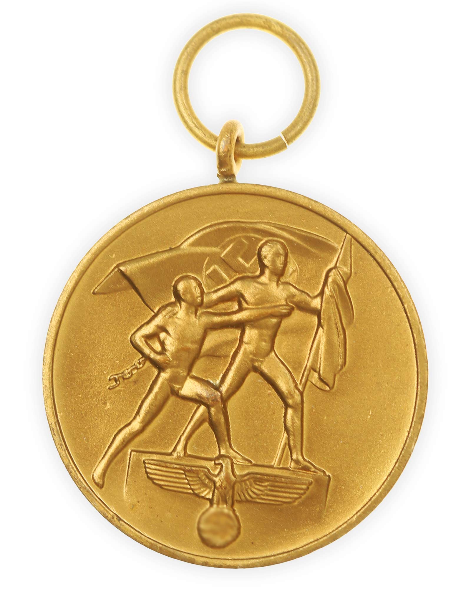Commemorative Medal (Sudetenland Medal) 1. October 1938. A circular medal constructed of bronze, the obverse bears two nude male figures, one of which holds a flag with a swastika that flies behind them, both are standing on a podium with an eagle holding a wreath with a swastika in the centre, the reverse centre bears the inscription “1 OKTOBER 1938” circumscribed with “EIN VOLK EIN REICH EIN FÜHRER” (ONE PEOPLE ONE COUNTRY ONE LEADER), with suspension loop. Total weight 13 g. Dimensions: 32 mm. Condition EXC+.