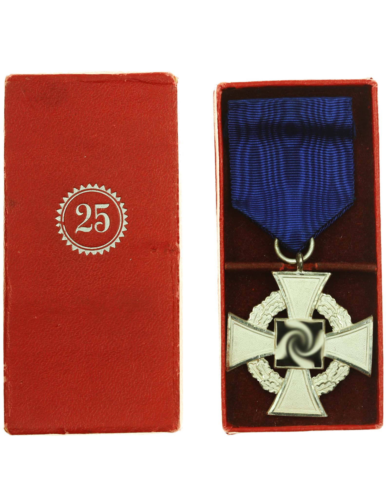 For Twenty-Five Years' Service by Paul Meybauer Ordenfabrik Berlin SW 68. Silvered metal and black enamels. Original ribbon with pinback, light contact. In its red cardboard box of issue, marked "25" on the lid. Total weight 21 g. Dimensions: 40,88 x 40,76 mm.
