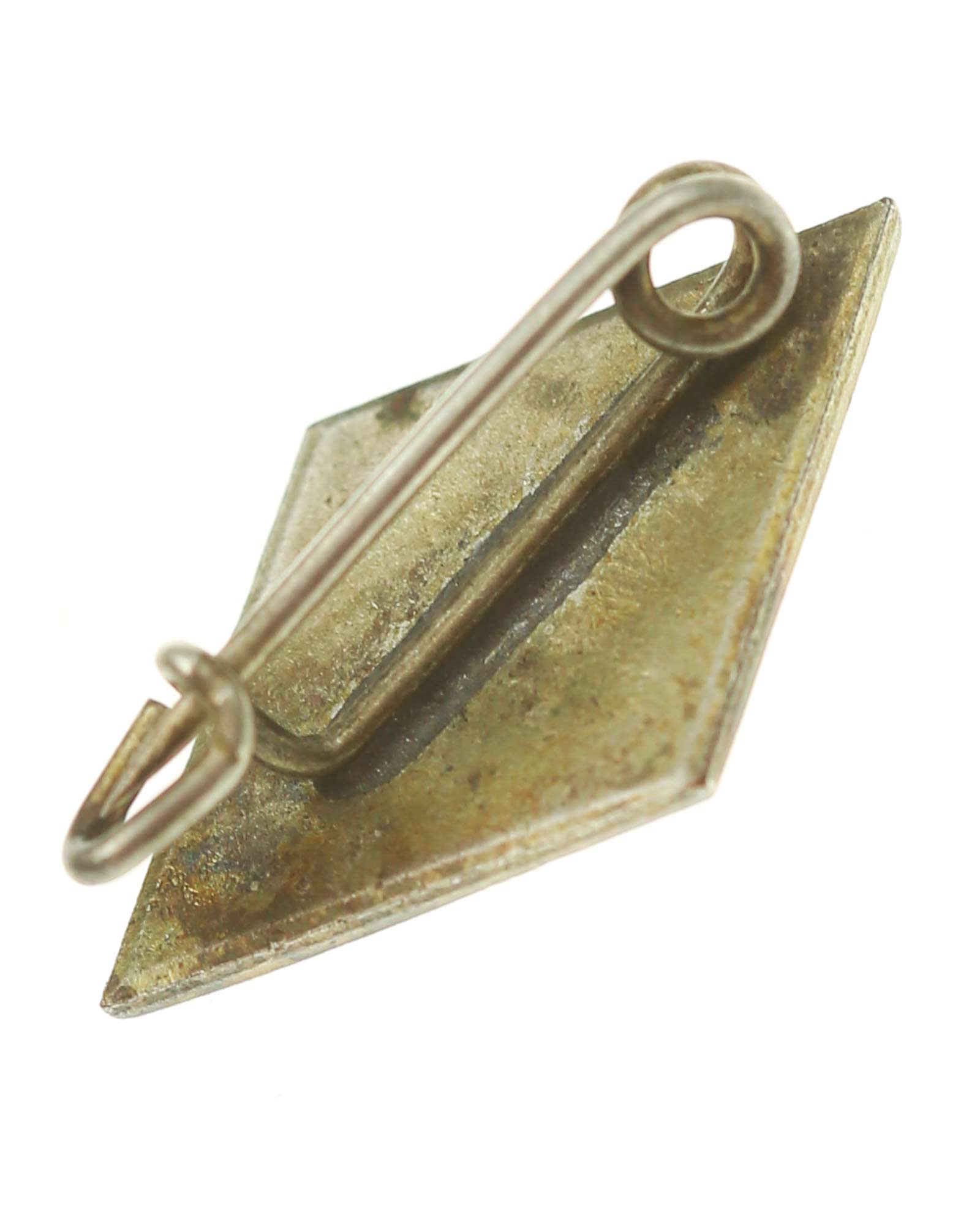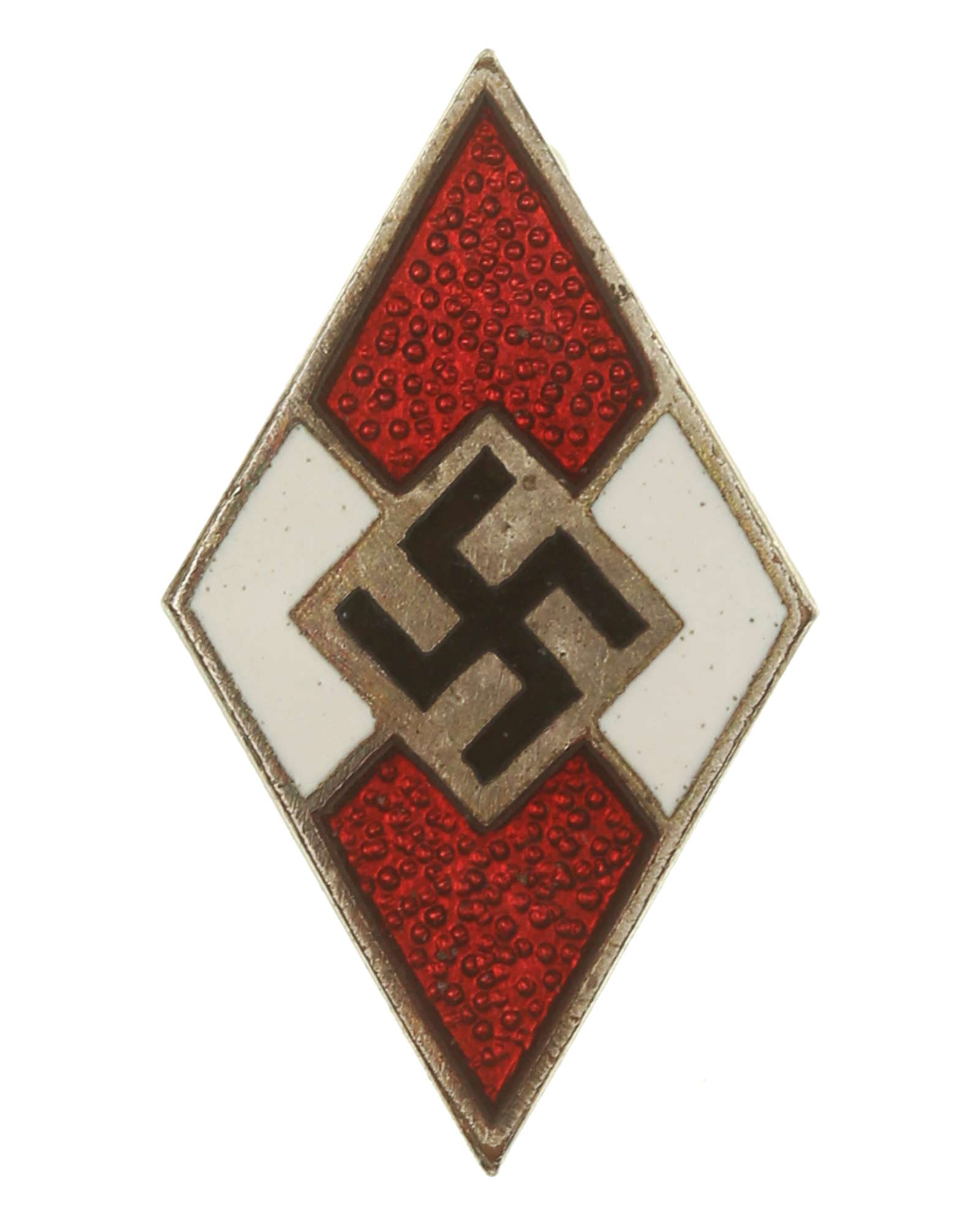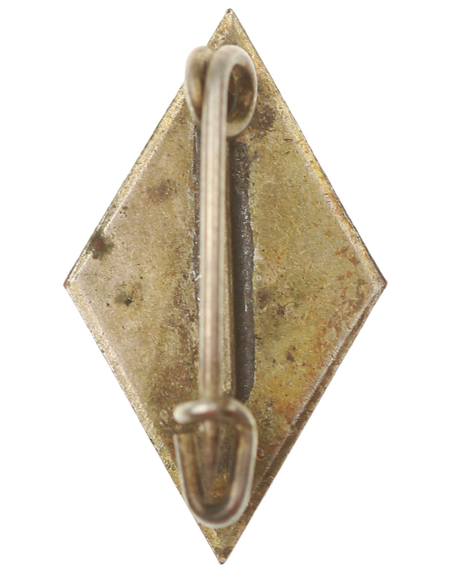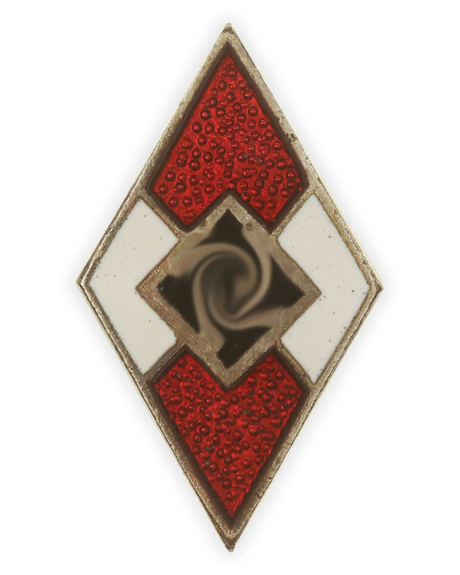 HJ (Hitlerjugend/Hitler Youth) membership badge; in silvered bronze and red, white, and black enamels; vertical pinback; measuring 24,46 x 14,36 mm.