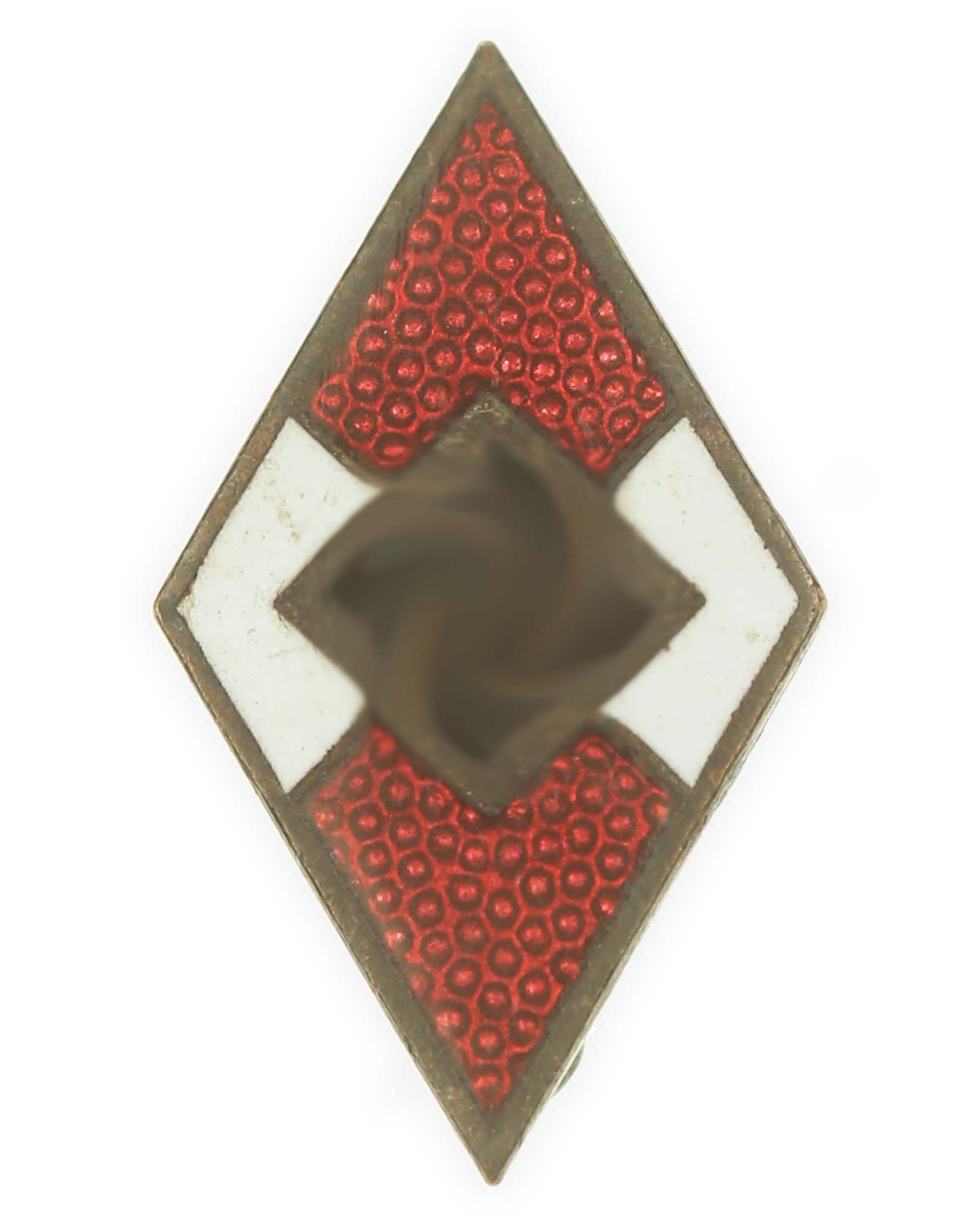 HJ (Hitlerjugend/Hitler Youth) membership badge; in silvered bronze and red, white, and black enamels; vertical pinback; maker marked “RZM M1/62” for “Gustav Hähl Pforzheim” on the reverse; measuring 24,34 x 14,45 mm.