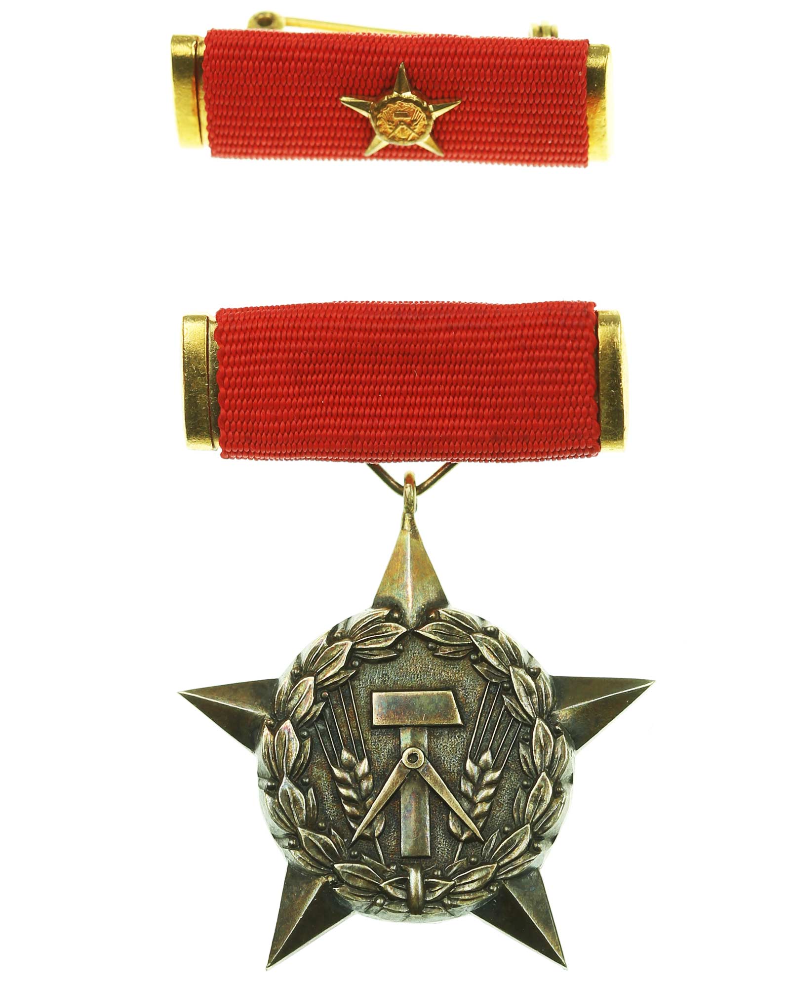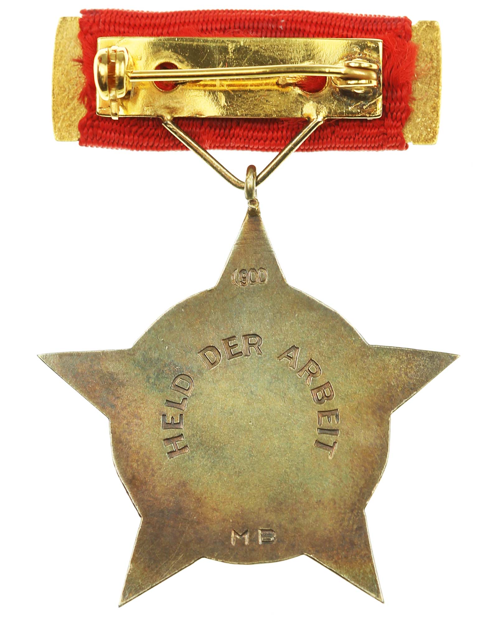 Medal for the honorary title "Hero of Labor", silver-gilt, on the lapel silver hallmark 900 and maker's mark "MB" of the coin in Berlin, on carrying strap, together with later interim clasp in box.
