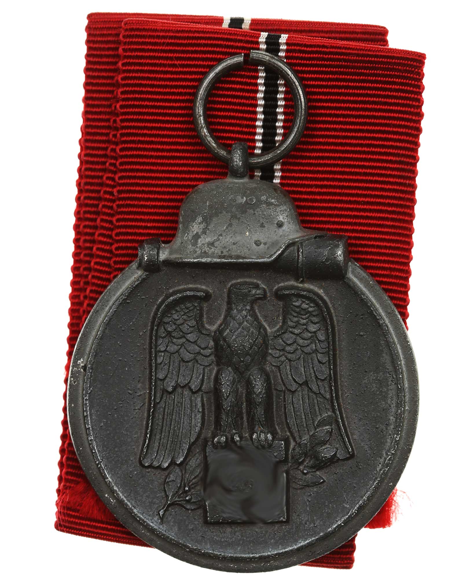 Circular zinc medal; the face concave with the German eagle, a cross gammée (swastika) in its claws imposed on a laurel branch; the reverse convex, inscribed ‘WINTERSCHLACHT IM OSTEN’ (Winter Battle in the East) and dated ‘1941 / 42’ above a crossed laurel branch and sword; age-toned; on original ribbon mounted for wear. The Medal was instituted on 26 May 1942 ‘In Würdigung des heldenhaften Einsatzes gegen den bolschewistischen Feind während des Winters 1941/42’ (In appreciation of the heroic actions against the Bolshevik enemy during the winter of 1941-42). It was awarded to those who between 15 November 1941 and 26 April 1942 took part in 14 days combat, spent 60 days in the combat zone or were killed or wounded. Spanish, Italian, Romanian and other forces allied to Germany also received the Medal on the same conditions. Total weight 22 g. Dimensions: 46,58 x 46,69 mm.