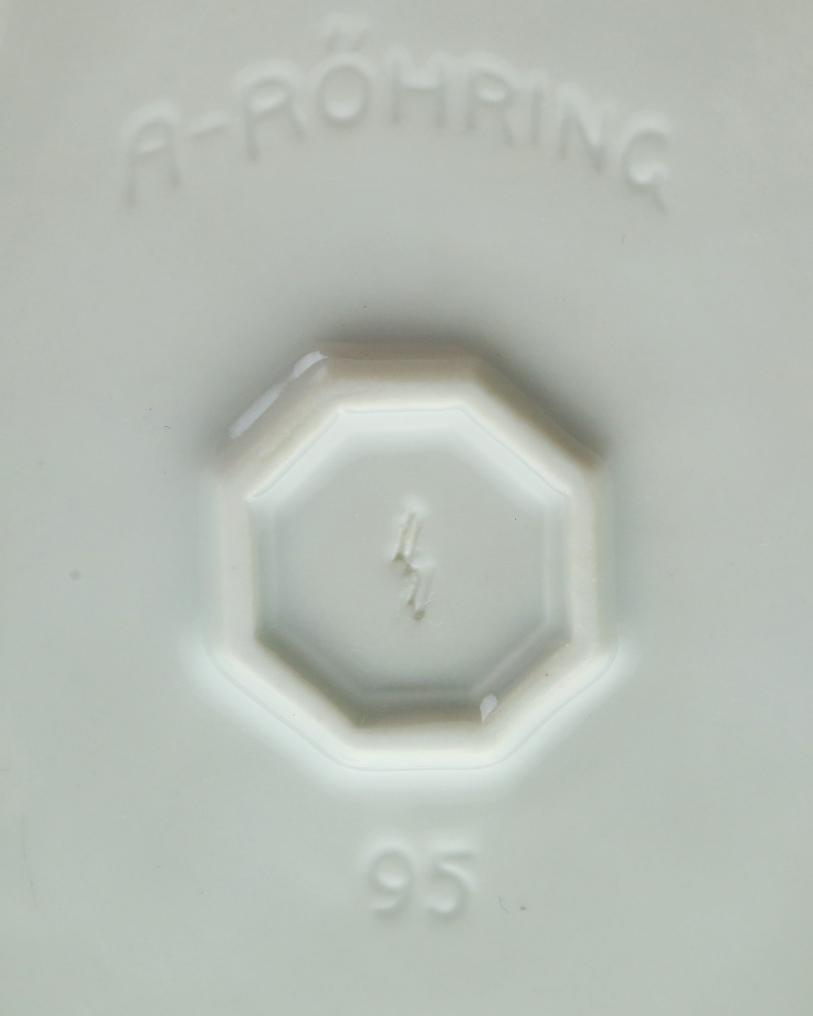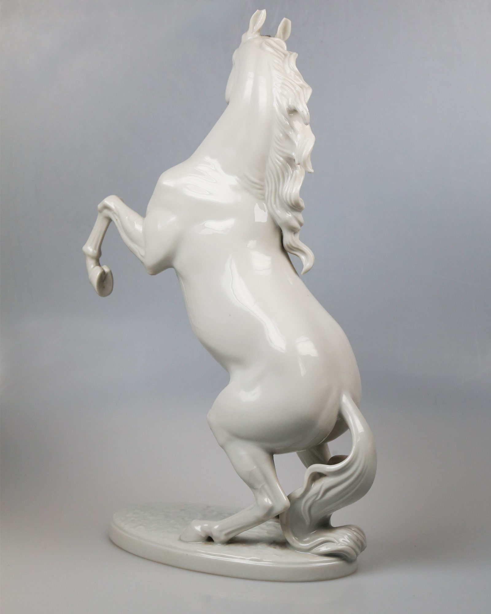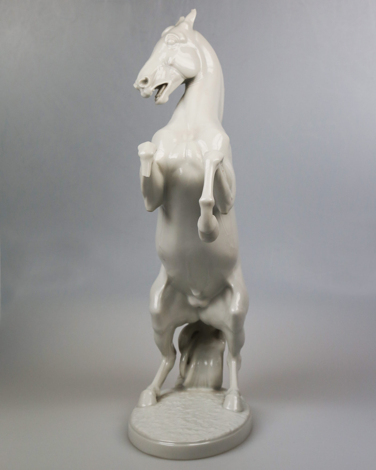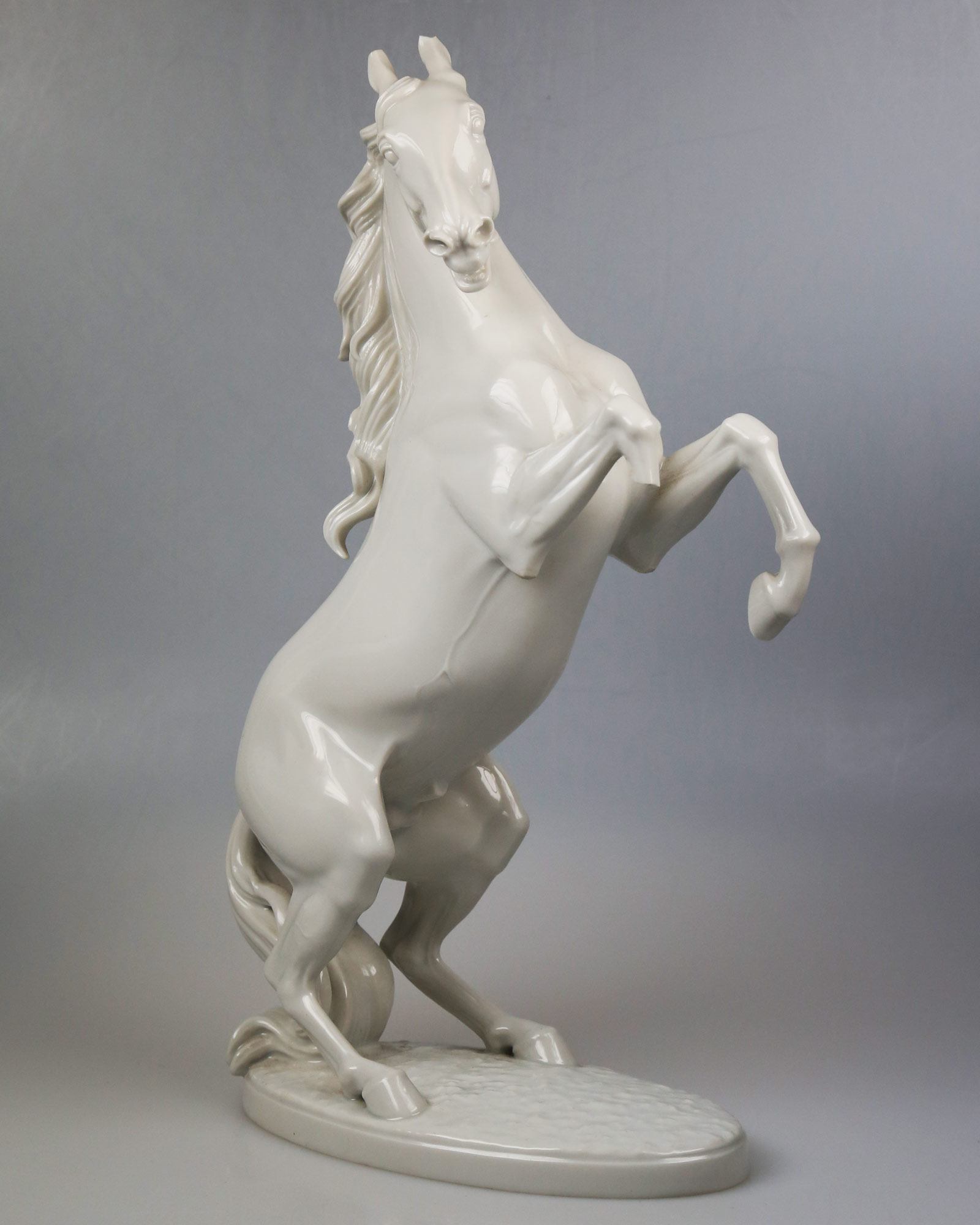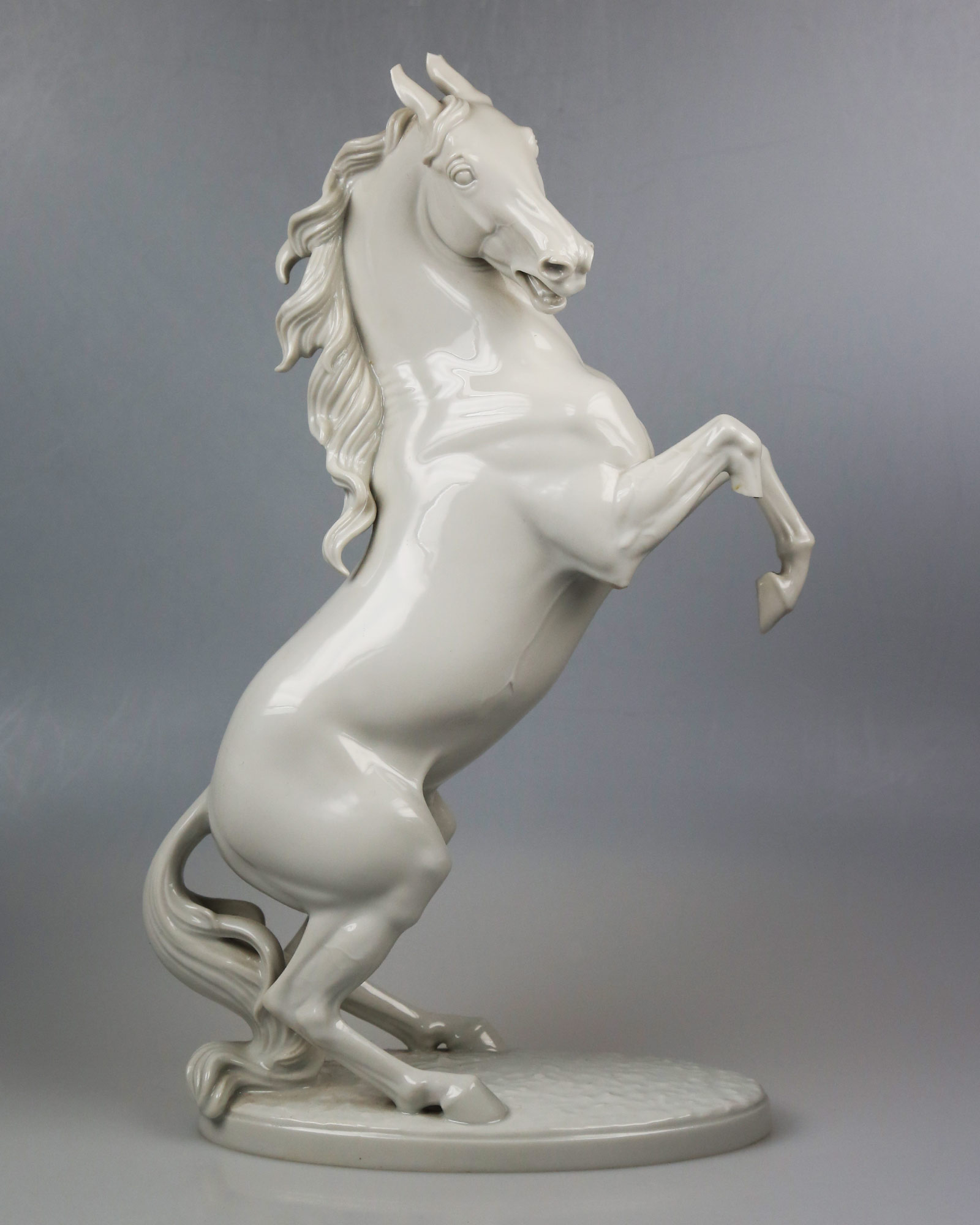 The Allach Porcelain figure known as the Rearing Horse (Steigendes Pferd). Model number 95, designed by Adolf Röhring. The porcelain horse, with excellent conformation, performing a controlled, High School dressage persade; standing on both hind legs, the forelegs raised and tucked evenly, carrying all the weight on the hindquarters, and forming a 45 degree angle to the gound. The glazed, white porcelain horse, is most possibly a Lipizzan or Lusitano stallion. The horse is not carrying a rider, or wearing tack, and is executed in a natural-style, (the mane and tail are not braided). The tail to the horse figure, forms a part-support with the base. The underside to the base shows a relief, Allach Porcelain maker-mark, model number 95, and Adolf Röhring, designer-name. One leg broken, and minor damage to the ears.