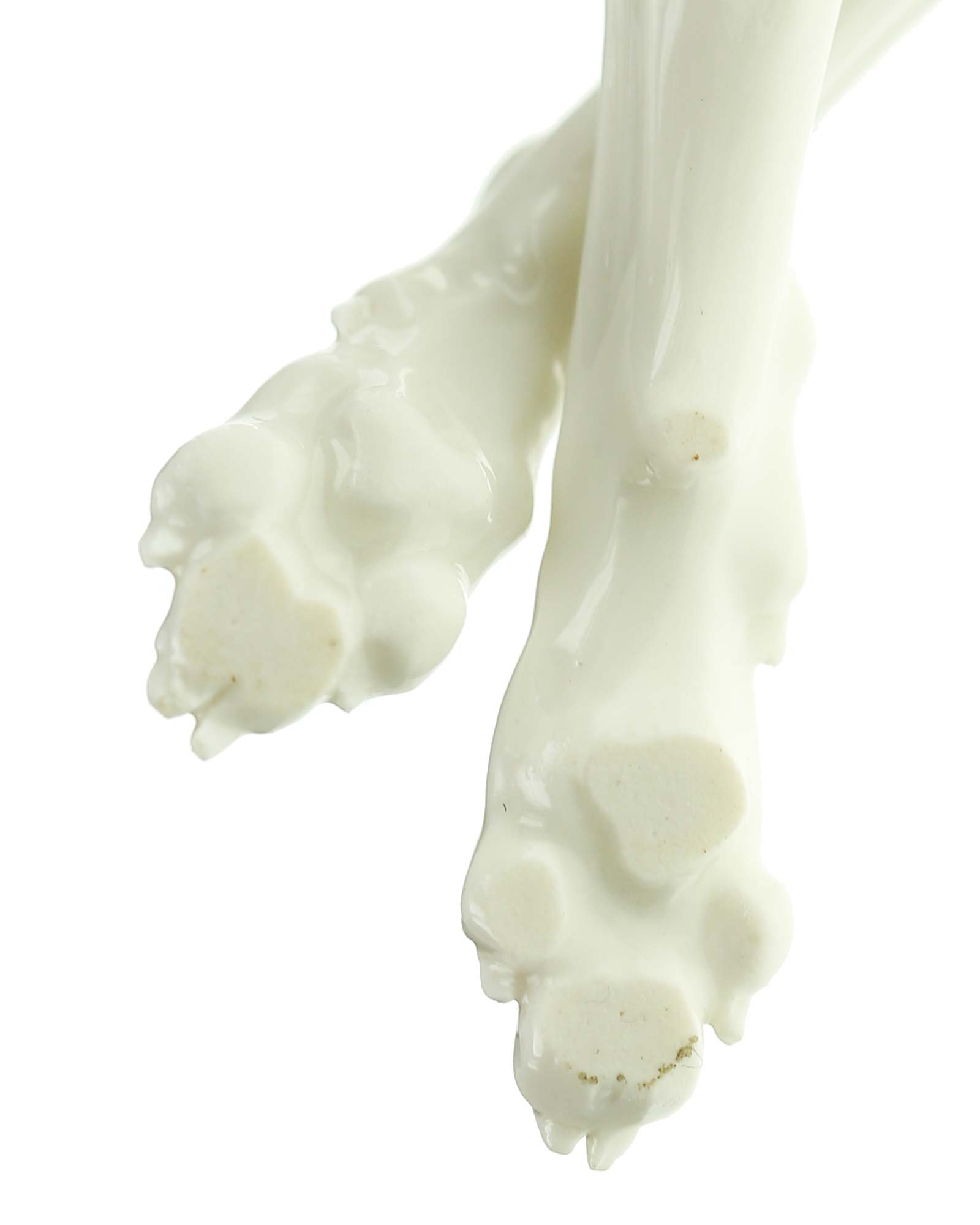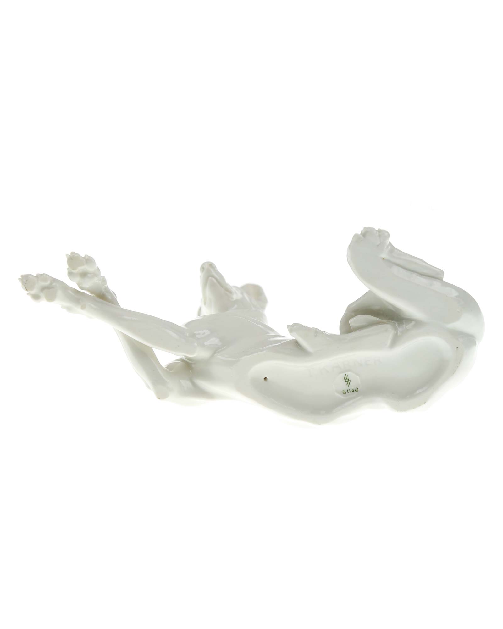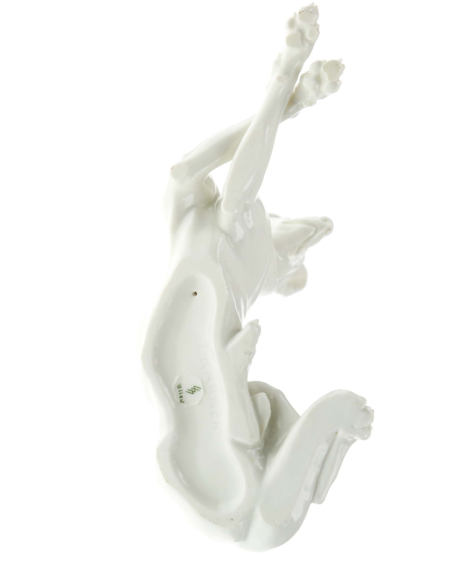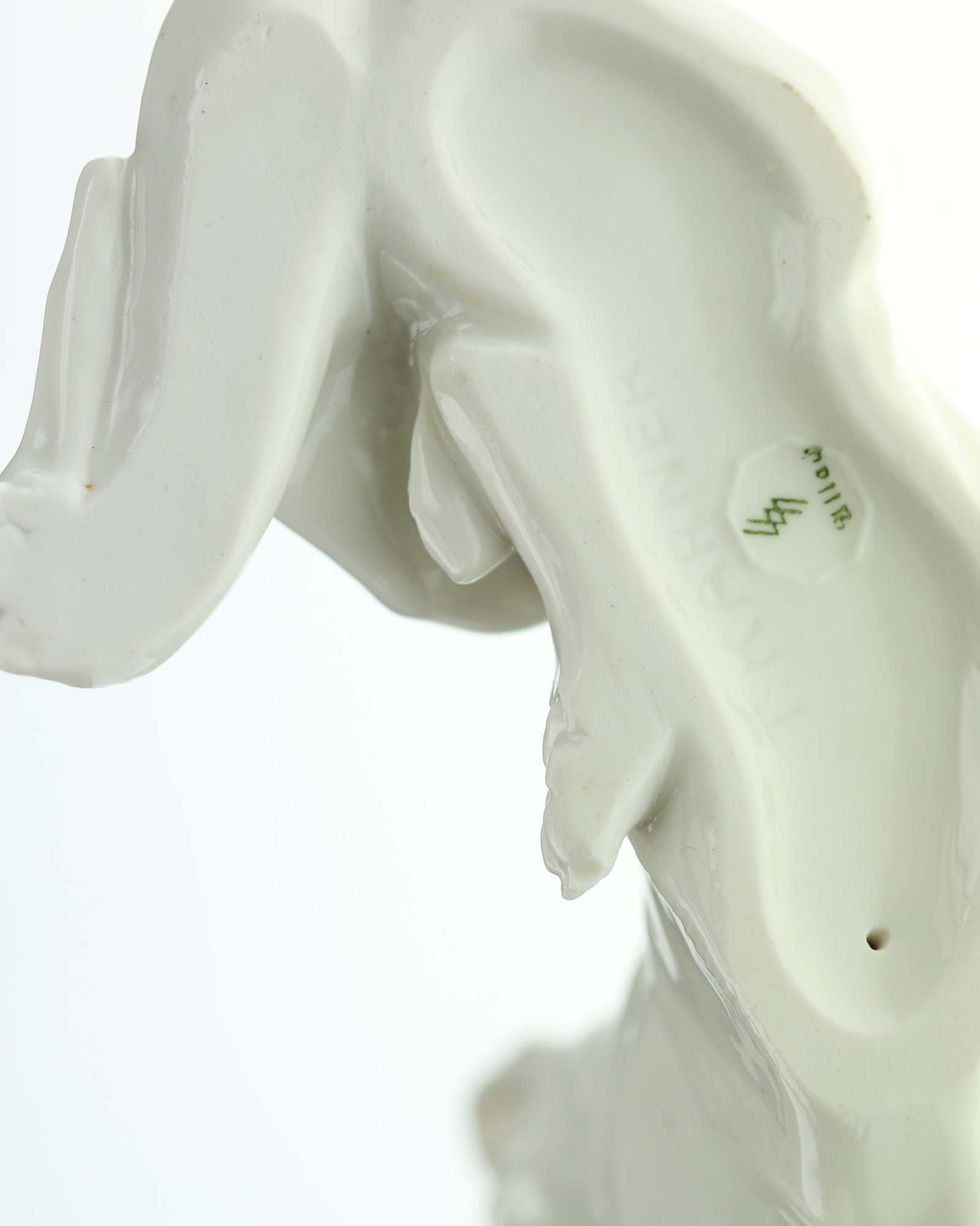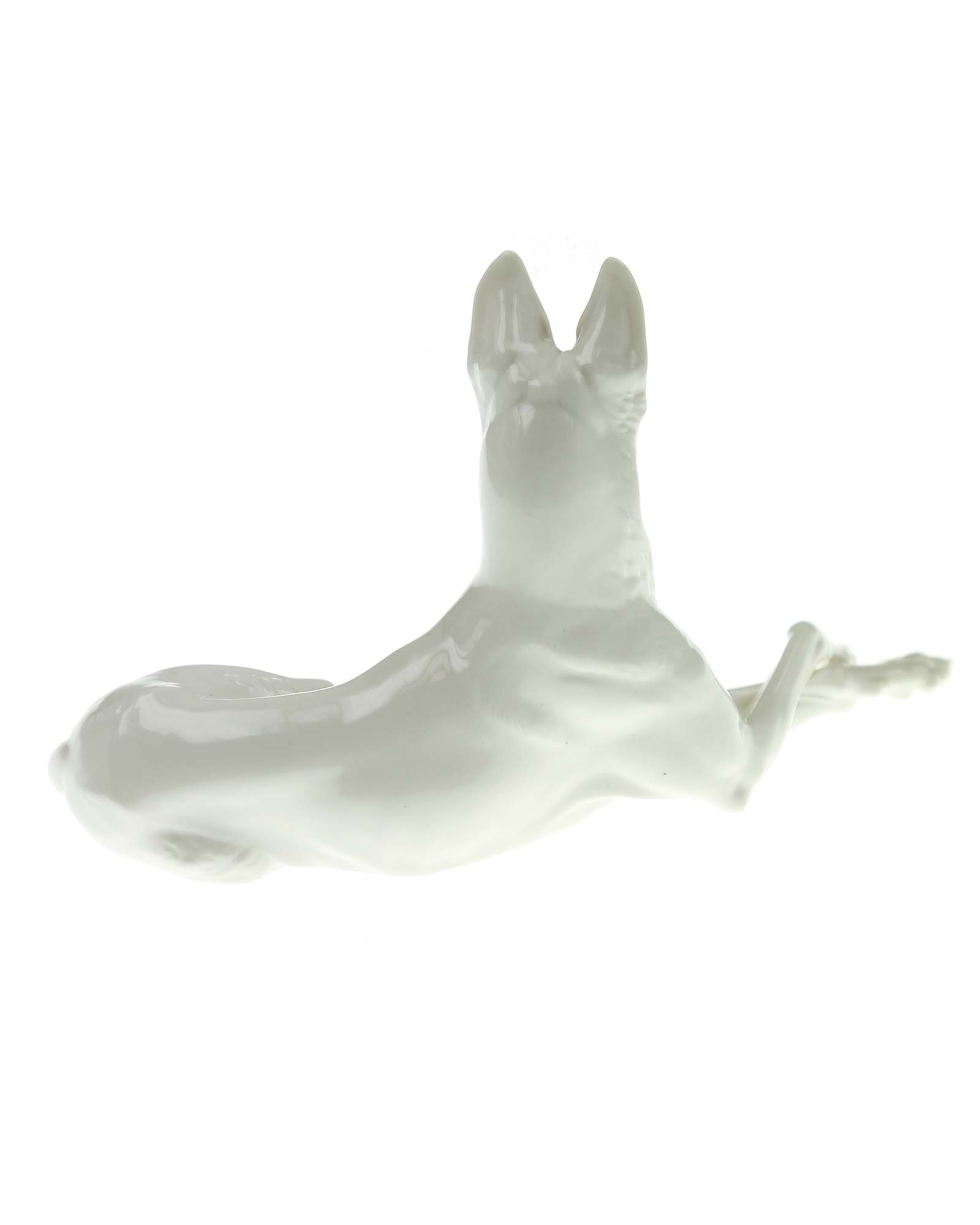 This is the Allach German shepherd model number 76 by Theodor Kärner. Shepherd dog in a rare small version. Modeled with acute attention to detail and perfect conformation, this fine antique porcelain dog shows the Allach entwined rune trademark and the ‘T. KARNER’ signature impressed in the underside of the base. Condition of this exquisitly fine antique German porcelain figurine statue is mint. Dimensions 180 x 110 mm. Total weight 170 g.