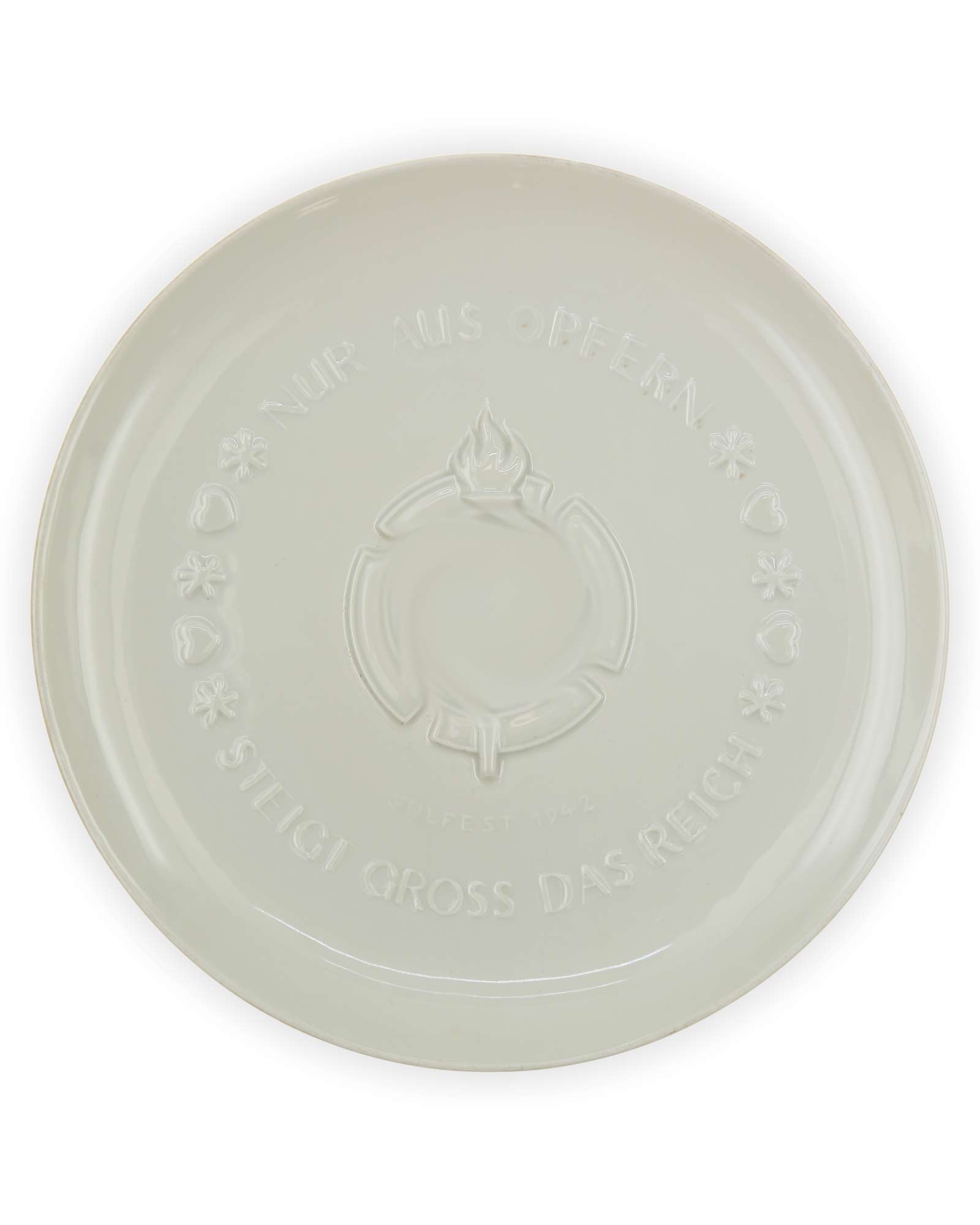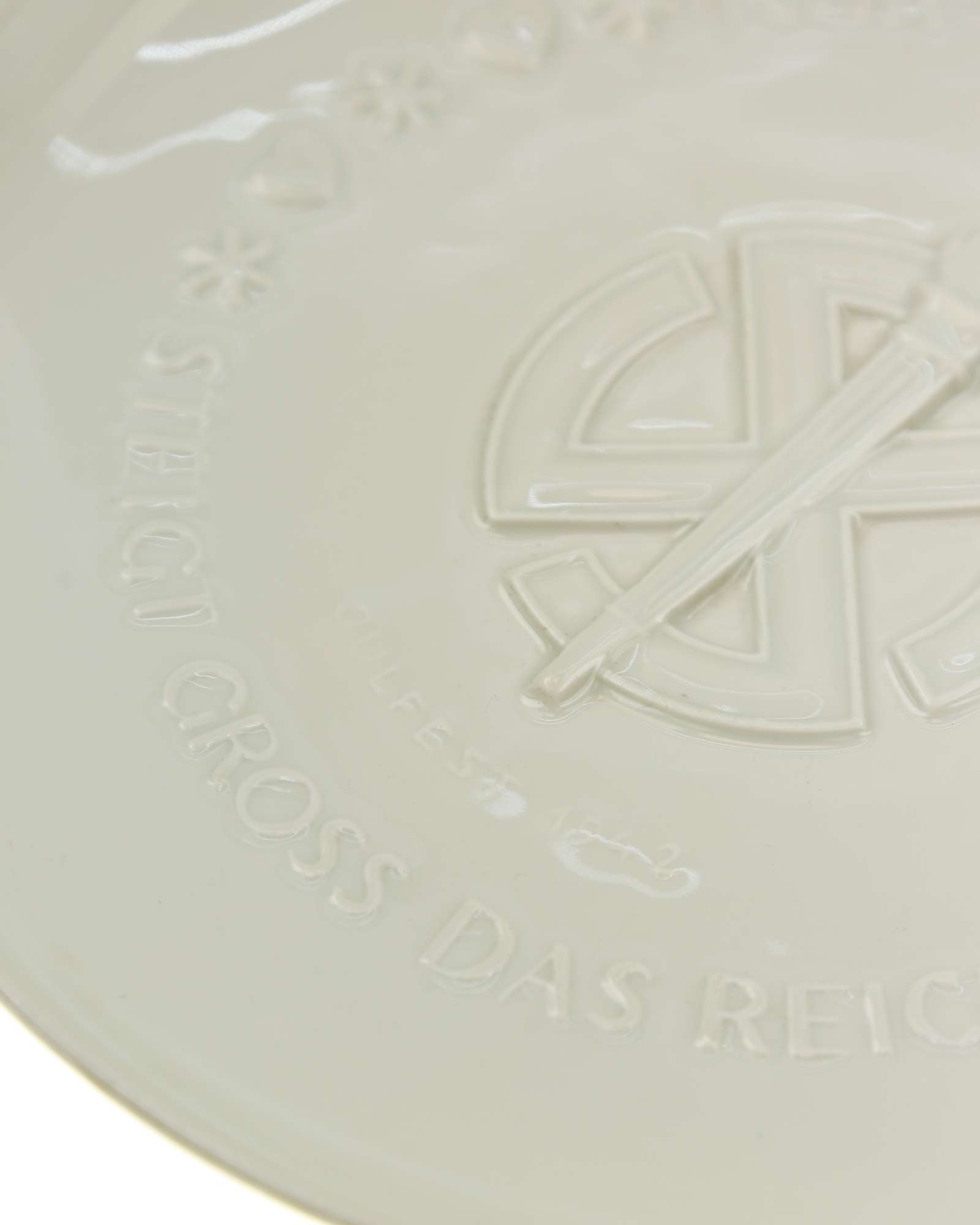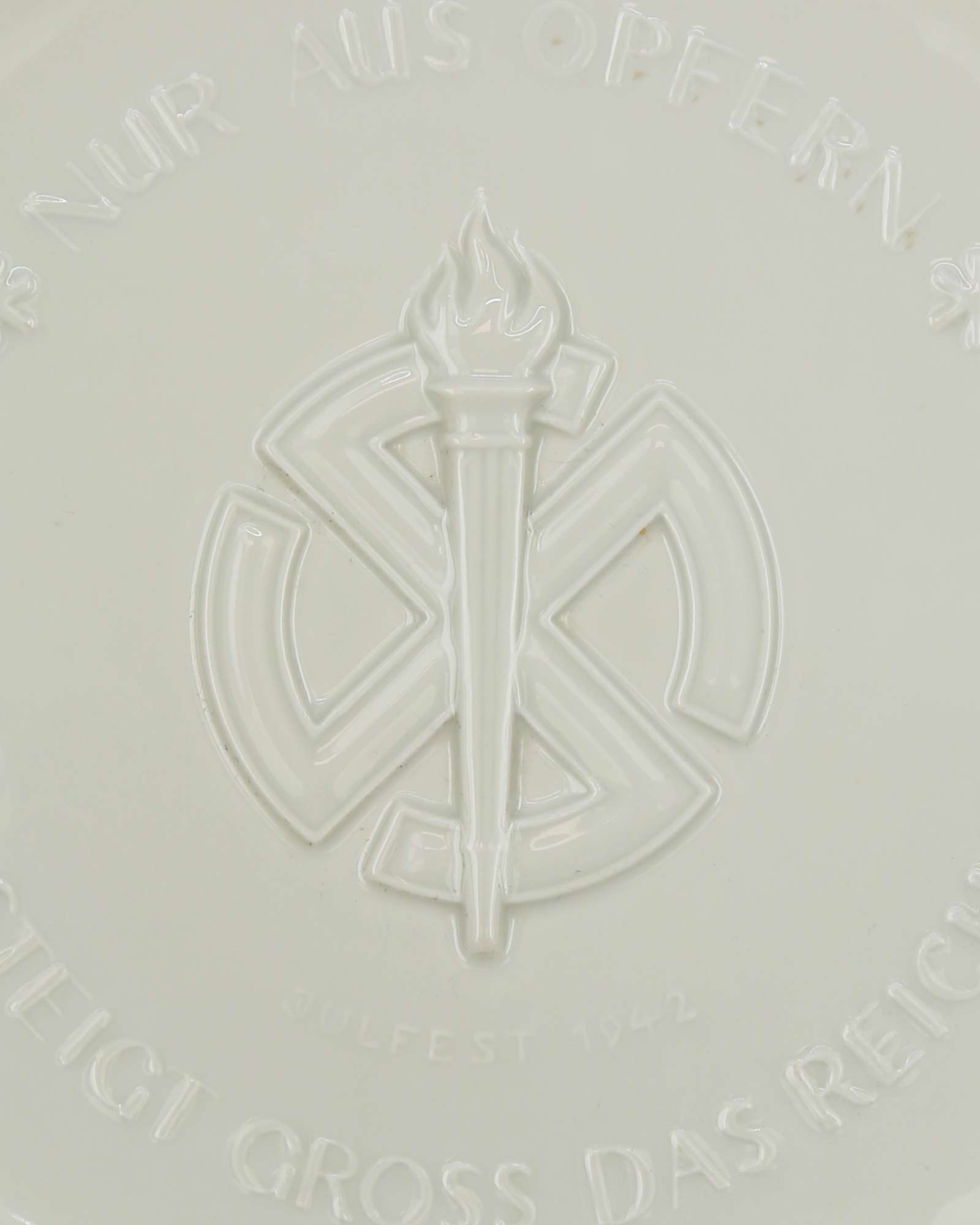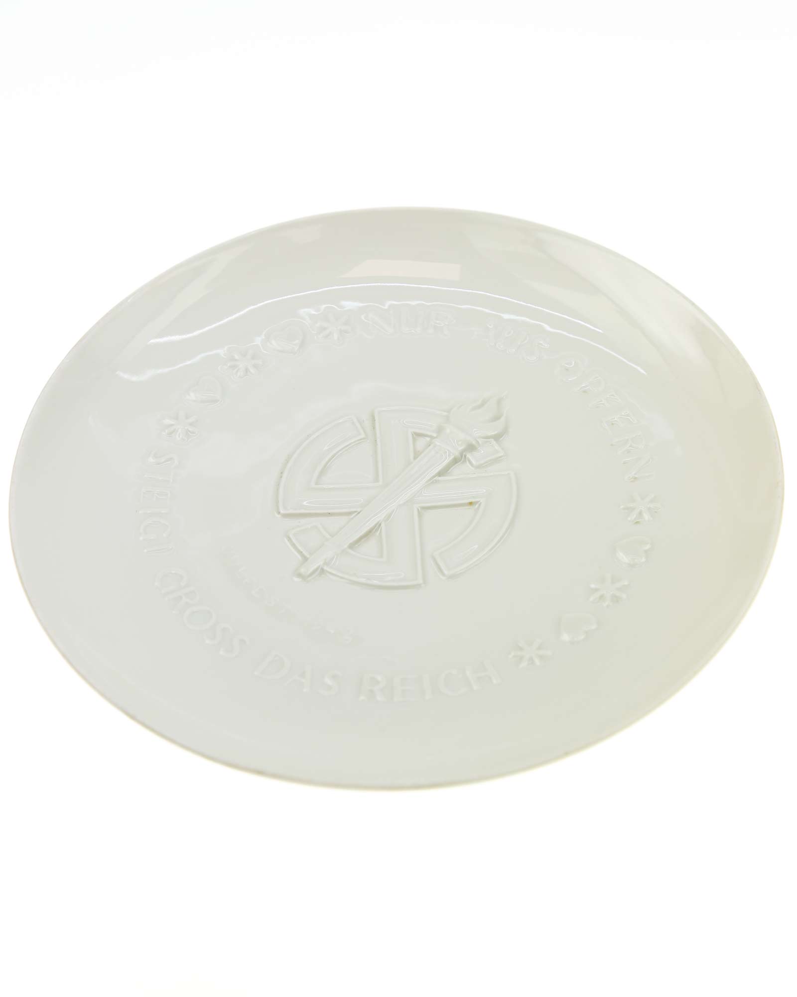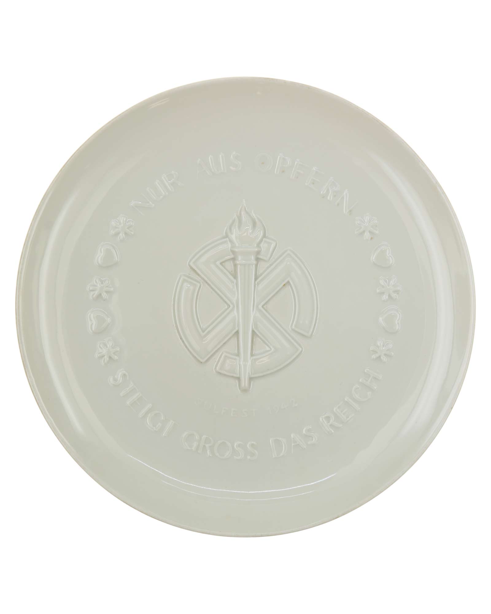 SS Allach porcelain plate: Julfest 1942. SS Allach Porcelain Reichsführer-SS Himmler ornamental 1942 Julfest gift plate. Decorated with the Sonnerad, stylised torch, hagal runes, hearts and the script “Nur aus Opfern steigt groß das Reich” Translated to English; “Only from great sacrifice will the Reich rise.” These plates were not for commercial sale, only for Himmler to award. This white glazed porcelain plate is in Mint condition.