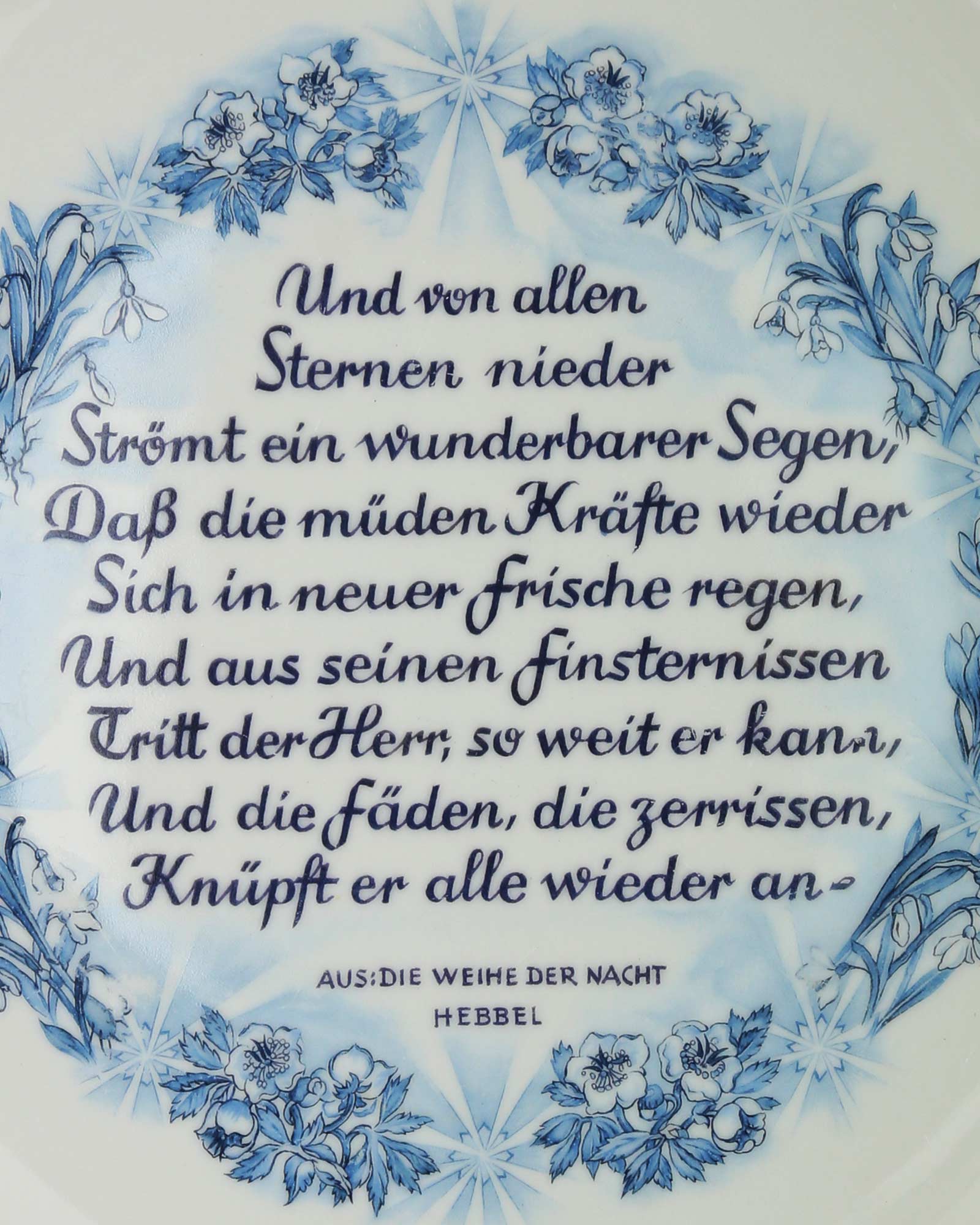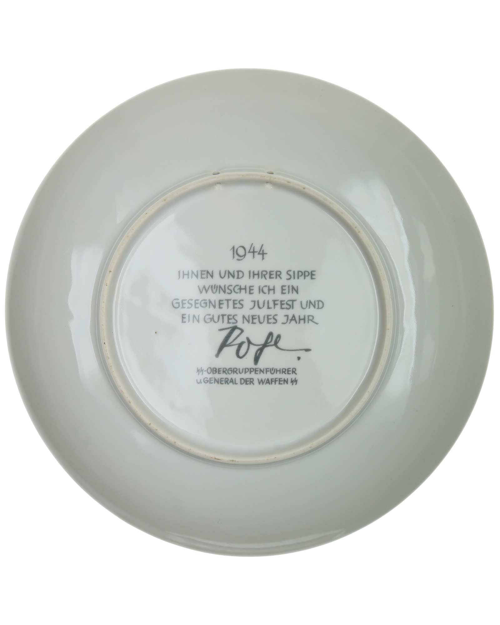 SS Allach porcelain plate: Julfest 1944. SS Allach Porcelain Obergruppenführer u. General der Waffen SS. This glazed porcelain plate is in Mint condition. Obverse decorated with inscription: Und von allen Sternen niederströmt ein wunderbarer Segen, daß die müden Kräfte wiedersich in neuer Frische regen, und aus seinen Finsternissentritt der Herr, soweit er kann, und die Fäden, die zerrissen, knüpft er alle wieder an. Aus: Die Weihe der Nacht von Christian Friedrich Hebbel. Reverse: 1944: IHNEN UND IHRER SIPPE WÜNSCHE ICH EIN GESEGNETES JULFEST UND EIN GUTES NEUES JAHR. SS-Obergruppenführer u. General der Waffen SS.