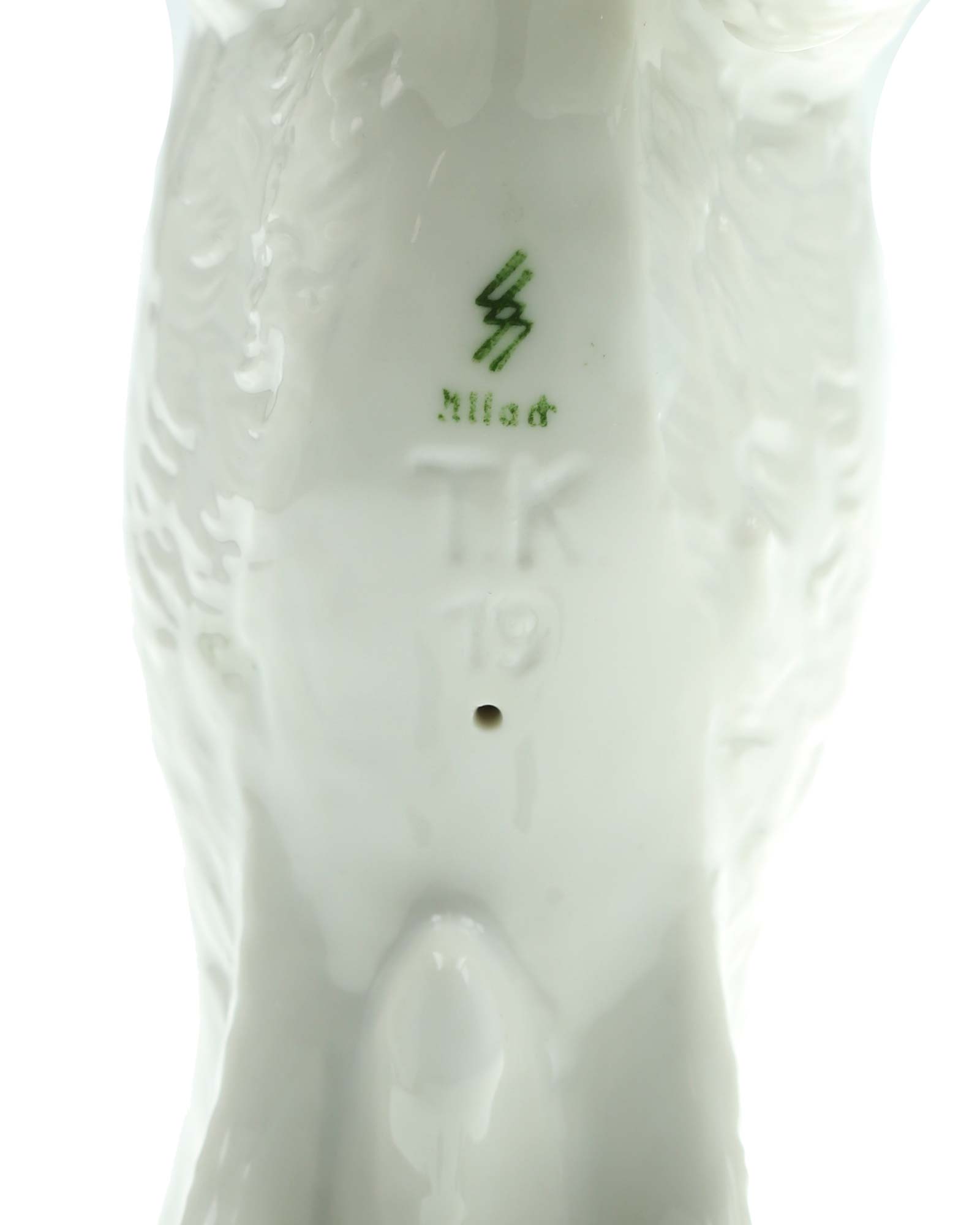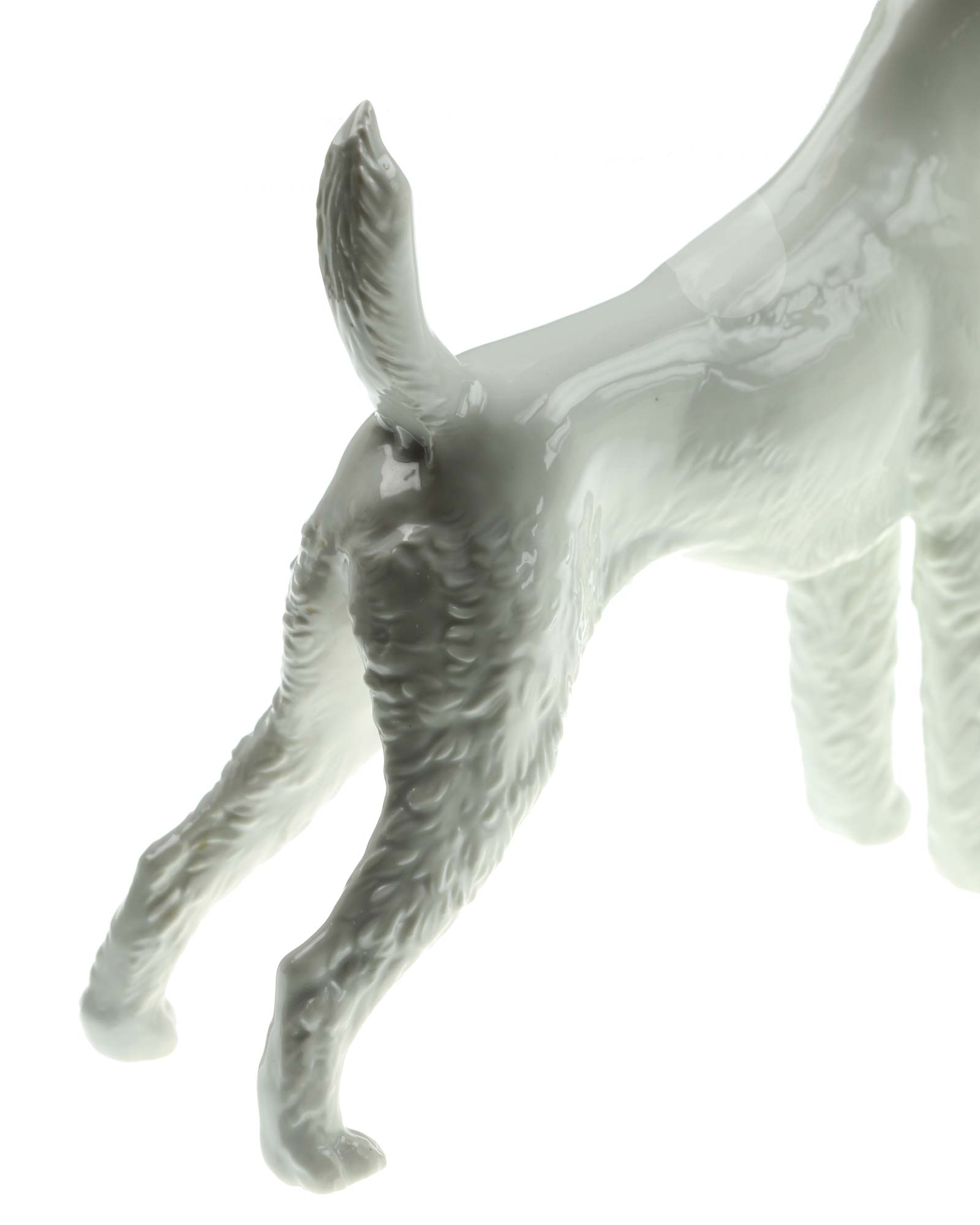 This is the Allach standing Fox Terrier (Stehender Foxterrier) number 19 by Theodor Kärner. Modeled with acute attention to detail and perfect conformation, this fine antique porcelain goat shows the Allach trademark "SS", the ‘Prof. Kärner’ signature and model "19". Condition of this exquisitly fine antique German porcelain figurine statue is mint.