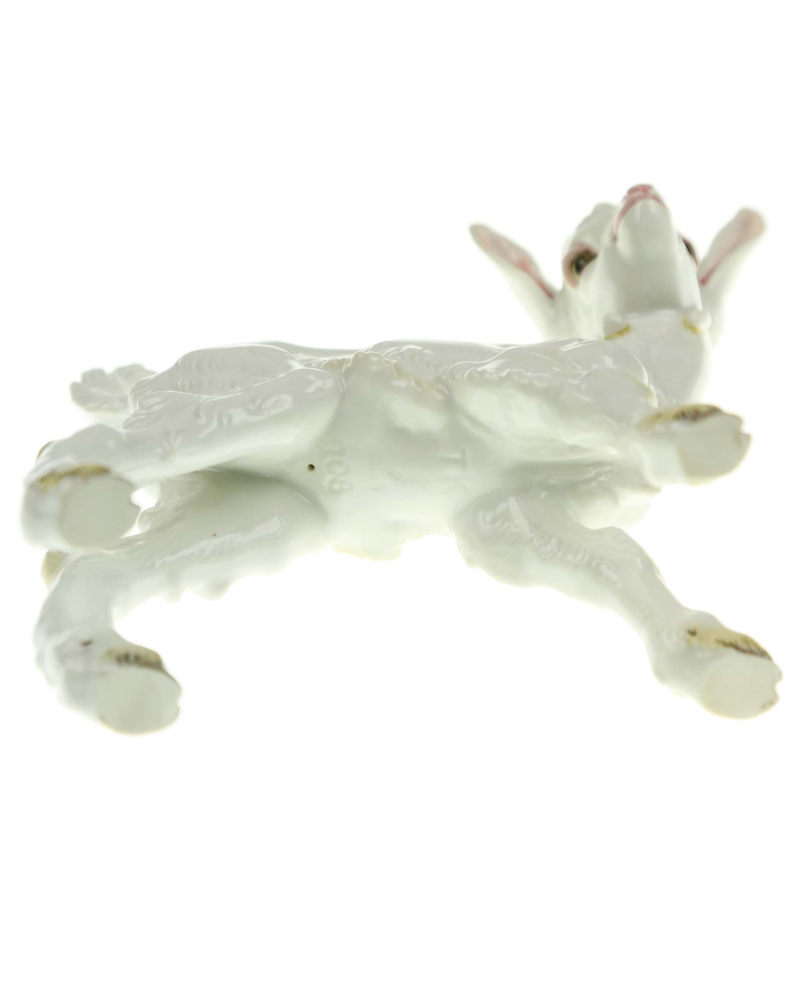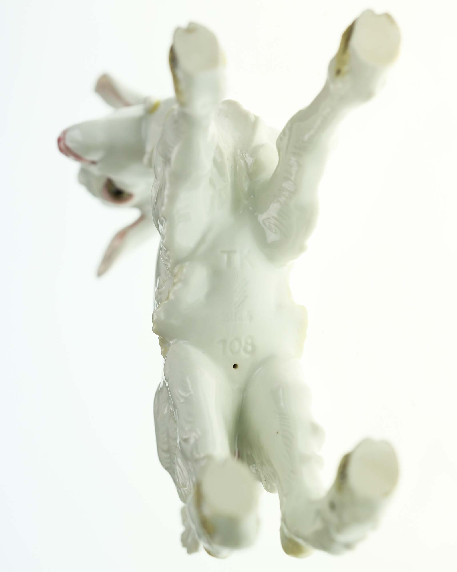 This is the Allach standing Goat (Stehendes Zicklein) number 108 by Prof. T. Kärner. The claws and eyes are colored. Modeled with acute attention to detail and perfect conformation, this fine antique porcelain goat shows the Allach trademark "SS", the ‘T.K’ signature and model number "108". Condition of this exquisitly fine antique German porcelain figurine statue is MINT.