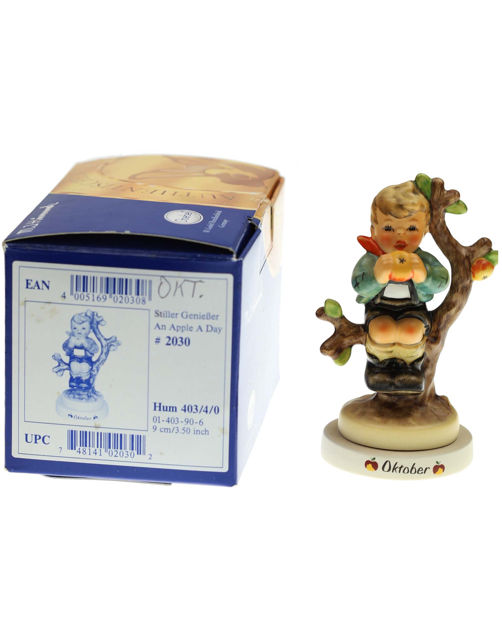 M. I. Hummel (W. Goebel Porcelain Factory) Figure: Hum 403/4/0 (01-403-90-6) Stiller Genießer (An Apple A Day) #2030. EAN 4005169020308. The figure is in original packaging.