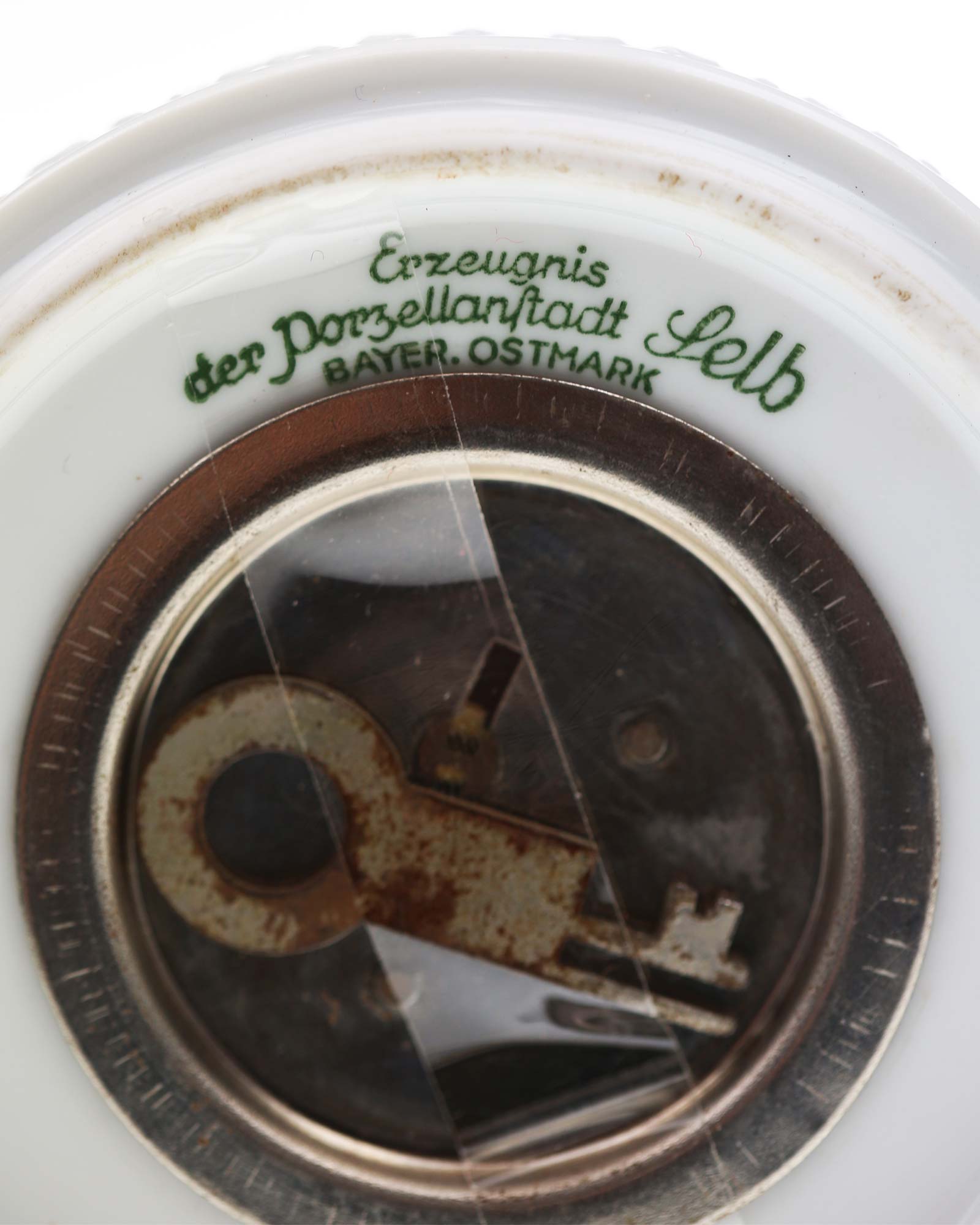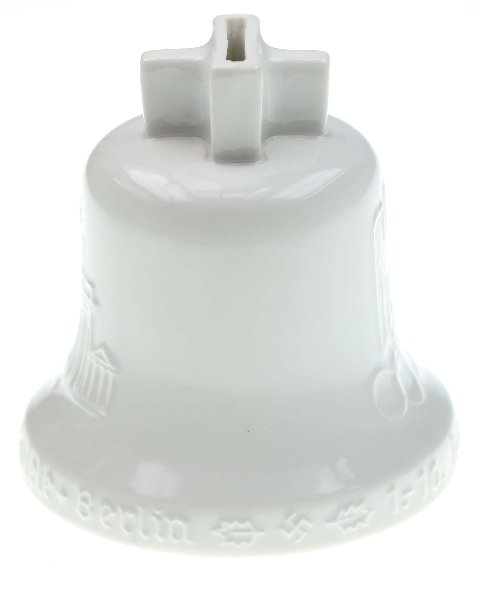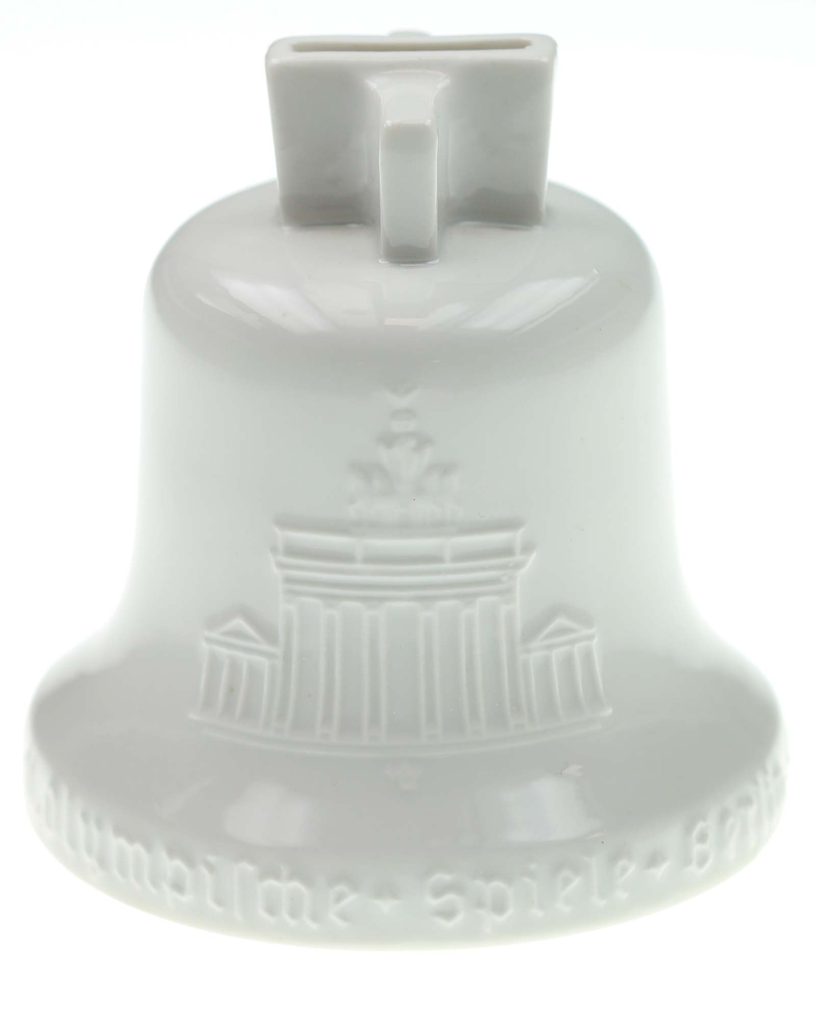 Fine white glazed porcelain bell used as a money box. "Selb, Bayerische Ostmark" maker marked and "Heinrich & Co." marked. This fantastic item is a correct replica of the Olympic Bell at the Olympic Stadium in Berlin where the 11th Olympic Summer Games took place in 1936. Along the bottom it says: 11. Olympische Spiele Berlin (11th Olympic Games Berlin) and the date 1 -16 August 1936, also the Brandenburg Gate and an eagle holding the Olympic Rings. The total height is about 4 inches, the lower diameter is 4 inches. The bell is a money-box with the original lock and rare key. It was made by the Porcelain company in Selb, known for high quality porcelain and china in Germany then and now.