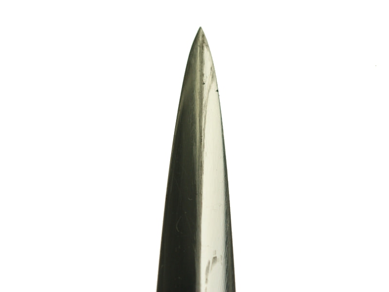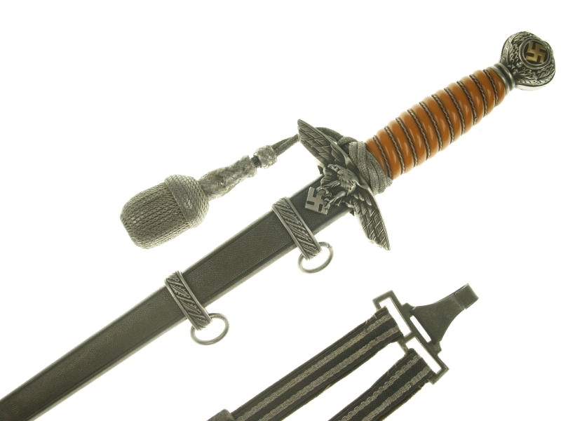 Парадный Кортик немецкий офицера ВВС, Германия (нем. Luftwaffe / Люфтваффе). Кортик офицерский и унтер-офицерский военно-воздушных сил обр. 1937 г. Рукоять круглая, деревянная, покрытая сверху пластмассой оранжевого цвета. По спиральным желобкам рукоять обмотана проволокой. Внизу имеется цилиндрическая гайка, украшенная орнаментом из дубовых листьев. Головка рукояти шарообразная, отлита вместе с верхней гайкой. Украшена с двух сторон рельефным изображением свастики и орнаментом из дубовых листьев. Головка навинчивается на хвостовик клинка и имеет сверху плоскую круглую пуговку. Крестовина литая, с лицевой стороны в виде летящего орла, несущего в когтях свастику. С обратной стороны крестовина имеет точечный фон. С верхней стороны концы крестовины украшены рельефным или гравированным орнаментом из дубовых листьев. Все металлические части эфеса отлиты из алюминия. Клинок плоский, шестигранный, обоюдоострый, полированный. Ножны металлические, цельные, поверхность покрыта мелкими точками. Конец ножен округлый, с тремя рельефными поясками, украшен орнаментом из дубовых листьев. Прибор ножен состоит из тонкого устья и двух массивных накладных гаек, украшенных дубовыми листьями, на которых крепятся подвижные кольца для ремней портупеи.