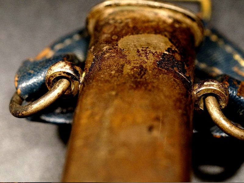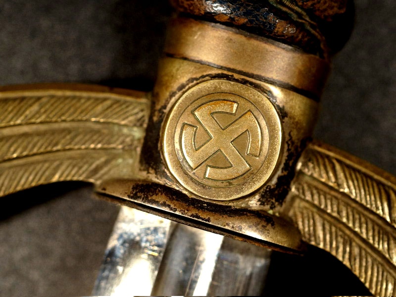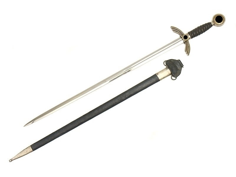 Парадный меч офицера немецких ВВС Люфтваффе обр.1934 г., Германия. Клинок стальной, прямой, двулезвийный, шестигранный с долом вместо средней грани в верхней части, никелированный. На пяте клинка клеймо Paul Weyersberg & Co. Solingen и клеймо военной приемки. Рукоять деревянная, обтянута темно-синей кожей и перевита по поперечным желобкам посеребренной проволокой. Весь металлический прибор рукояти и ножен изготовлен из мельхиора. На головке меча с обеих сторон расположены свастики в желтом оксидировании. Ножны металлические, обтянуты темно-синей кожей на оригинальном подвесе. Хорошая сохранность. Оригинал.
