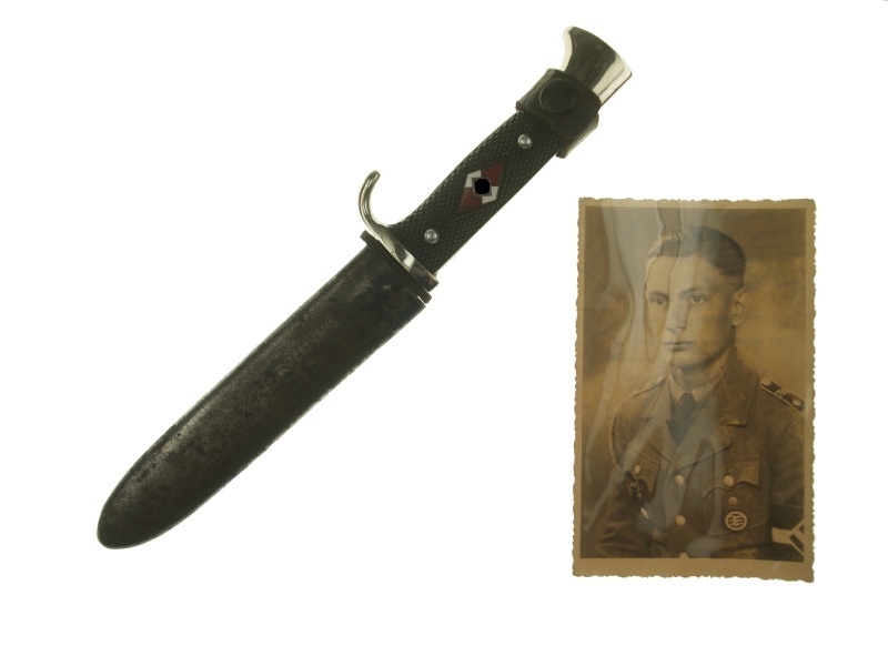 Нож члена молодежной организации "Гитлерюгенд" образца 1940-1942 года. Клинок никелированный, на его оборотной стороне имеется клеймо изготовителя в реестре RZM М7/85 с датой выпуска - 1942 год. Ножны металлические, выкрашенные в черный цвет, с кожаным ремешком для подвешивания к поясу с фиксирующим клапаном. Девиз Кровь и Честь! (нем. Blut und Ehre!). Рукоять с пластиковыми щечками в которые вмонтирована эмалевая эмблема Гитлер Югенд.