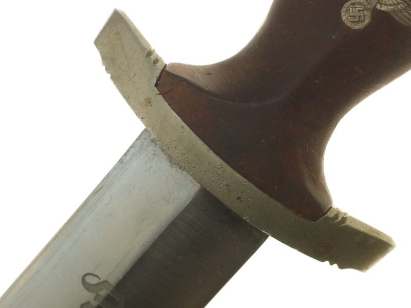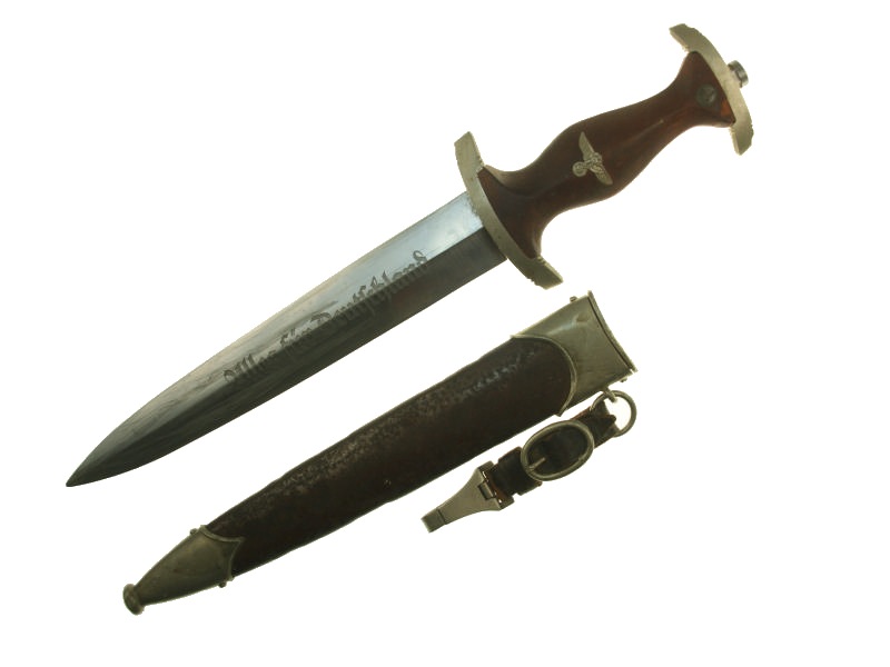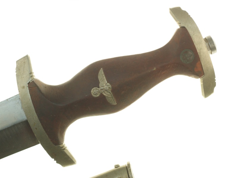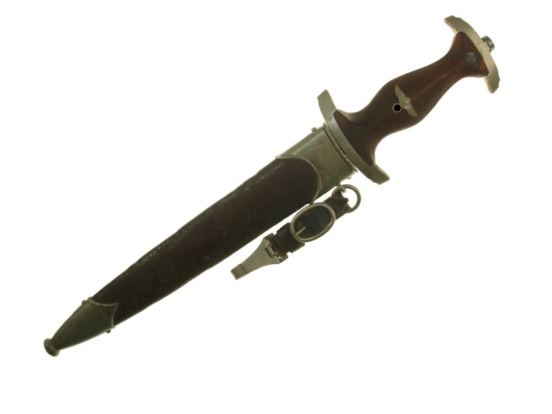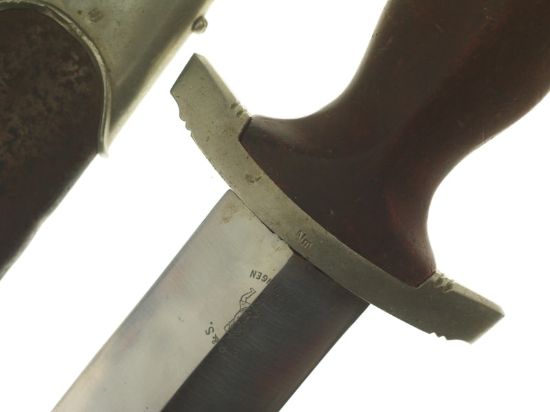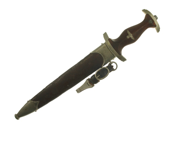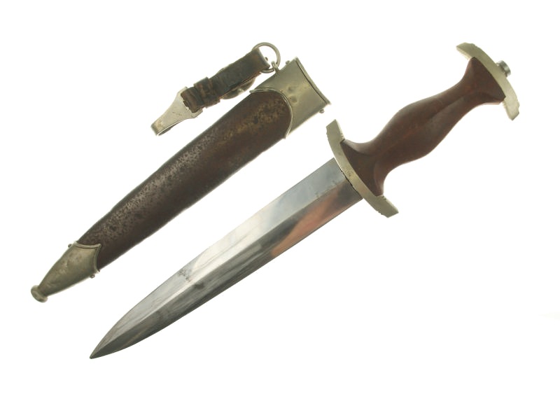 Кортик штурмовика СА. С комплектным подвесом. Ранний образец. Элементы рукояти мельхиоровые, что свидетельствует о раннем выпуске кинжала. Клинок стальной, классический кинжального типа, прямой, двулезвийный, с выраженным центральным ребром. На лицевой стороне нанесен травлением девиз SA, Alles fur Deutschland (Все для Германии), на оборотной стороне у основания стоит клеймо производителя Ernst Pack & Sohne, Solingen. На гарде с внутренней стороны гарда маркированна клеймом региона мизводства Nm-Nordmark. Прибор рукояти и ножен выполнен в тяжелом металле. Рукоять изготовлена из проваренного и прокрашенного в бордовый цвет дерева. Ножны в оригинальном заводском оксидировании и нетронутом заводском желтом лаке. Редкая сохранность.