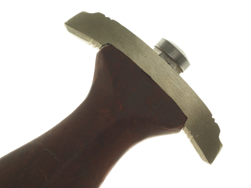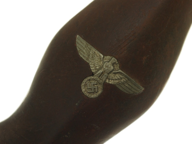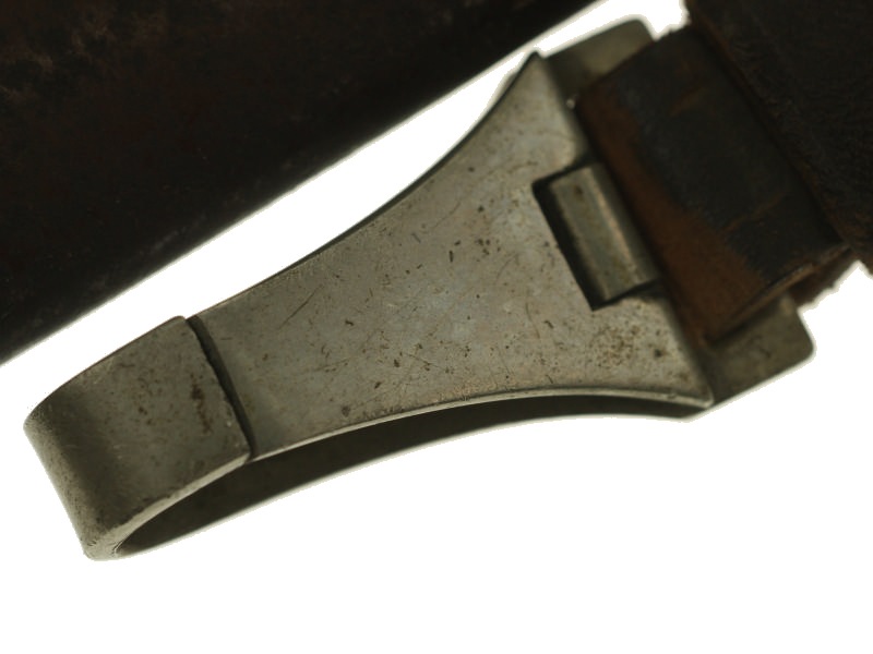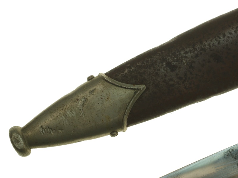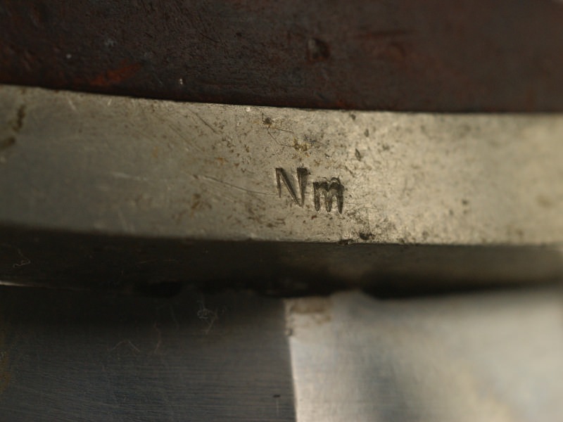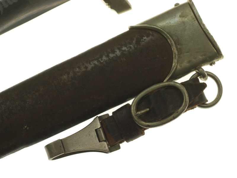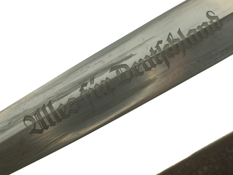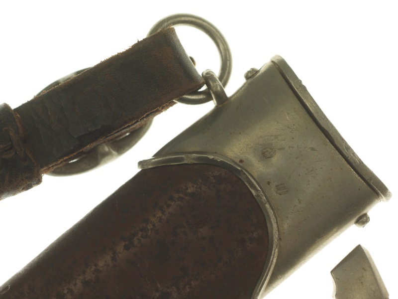 Кортик штурмовика СА. С комплектным подвесом. Ранний образец. Элементы рукояти мельхиоровые, что свидетельствует о раннем выпуске кинжала. Клинок стальной, классический кинжального типа, прямой, двулезвийный, с выраженным центральным ребром. На лицевой стороне нанесен травлением девиз SA, Alles fur Deutschland (Все для Германии), на оборотной стороне у основания стоит клеймо производителя Ernst Pack & Sohne, Solingen. На гарде с внутренней стороны гарда маркированна клеймом региона мизводства Nm-Nordmark. Прибор рукояти и ножен выполнен в тяжелом металле. Рукоять изготовлена из проваренного и прокрашенного в бордовый цвет дерева. Ножны в оригинальном заводском оксидировании и нетронутом заводском желтом лаке. Редкая сохранность.