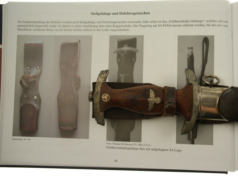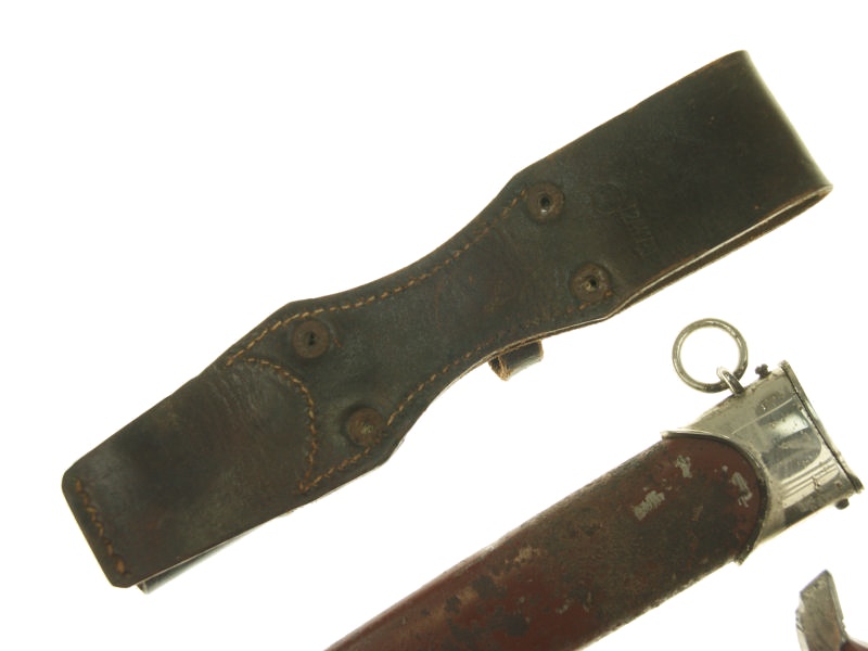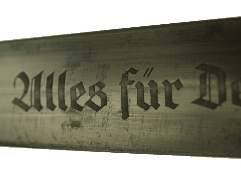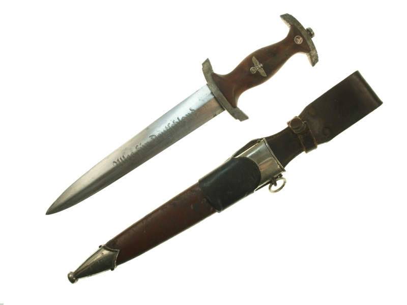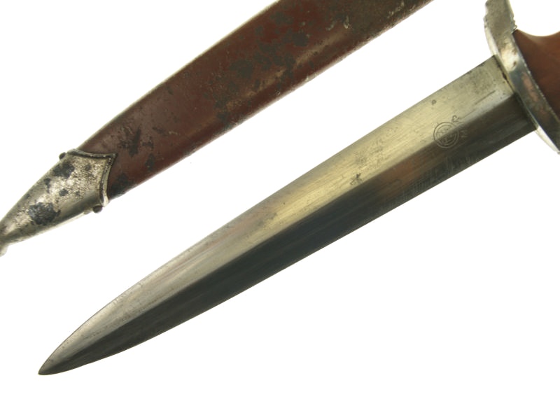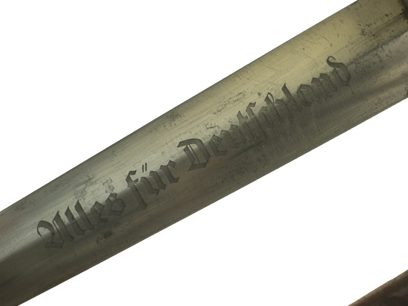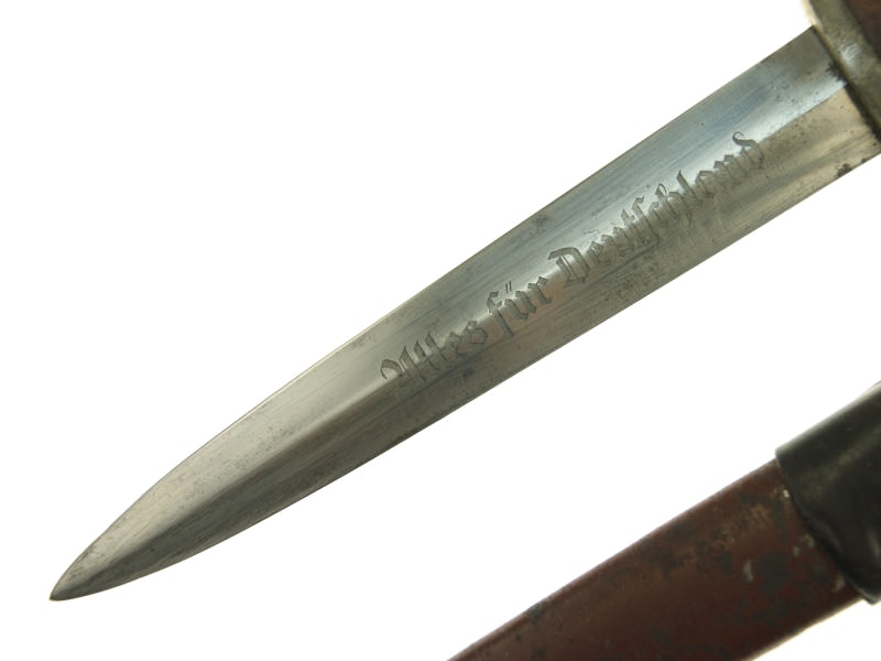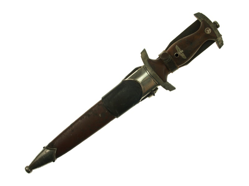 Кинжал штурмовых отрядов СА образца 1939-1942 года. Клинок классический кинжального типа, прямой, двулезвийный, с выраженным центральным ребром. На лицевой стороне нанесен травлением девиз СА «Alles fur Deutschland» (Все для Германии), на оборотной стороне у основания стоит клеймо RZM M7/13 (Arthur Schuttelhofer & Co., Solingen-Wald). Оригинальный очень редкий подвес маркирован клеймом L2/441/30. Рукоять изготовлена из проваренного и прокрашенного в темно-бордовый цвет дерева. Хорошая сохранность.