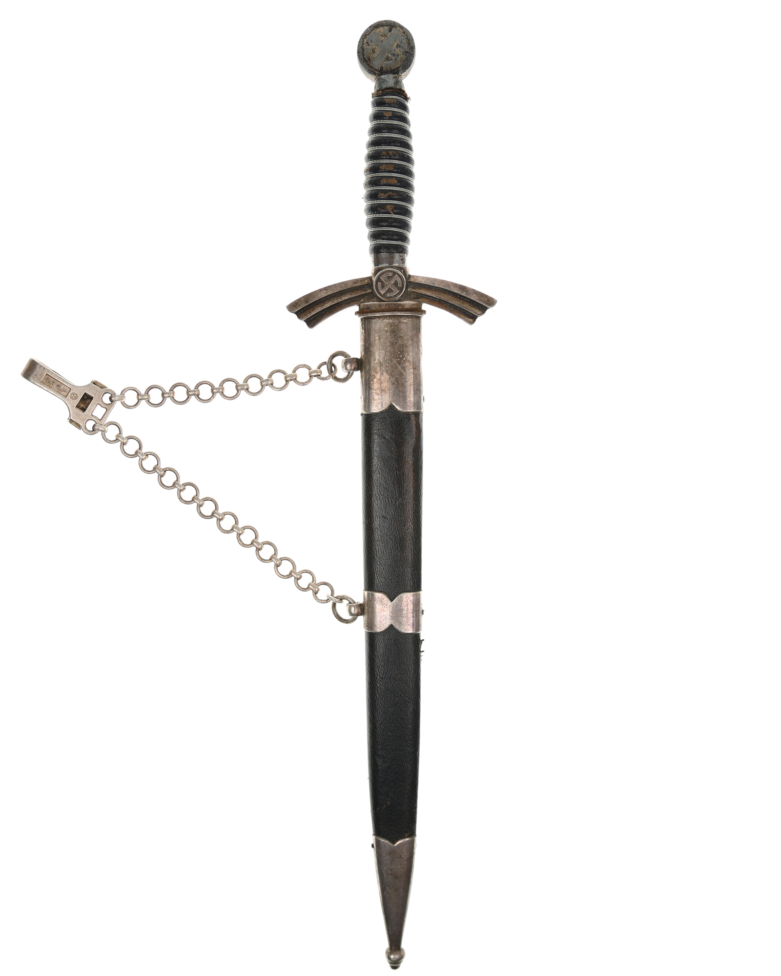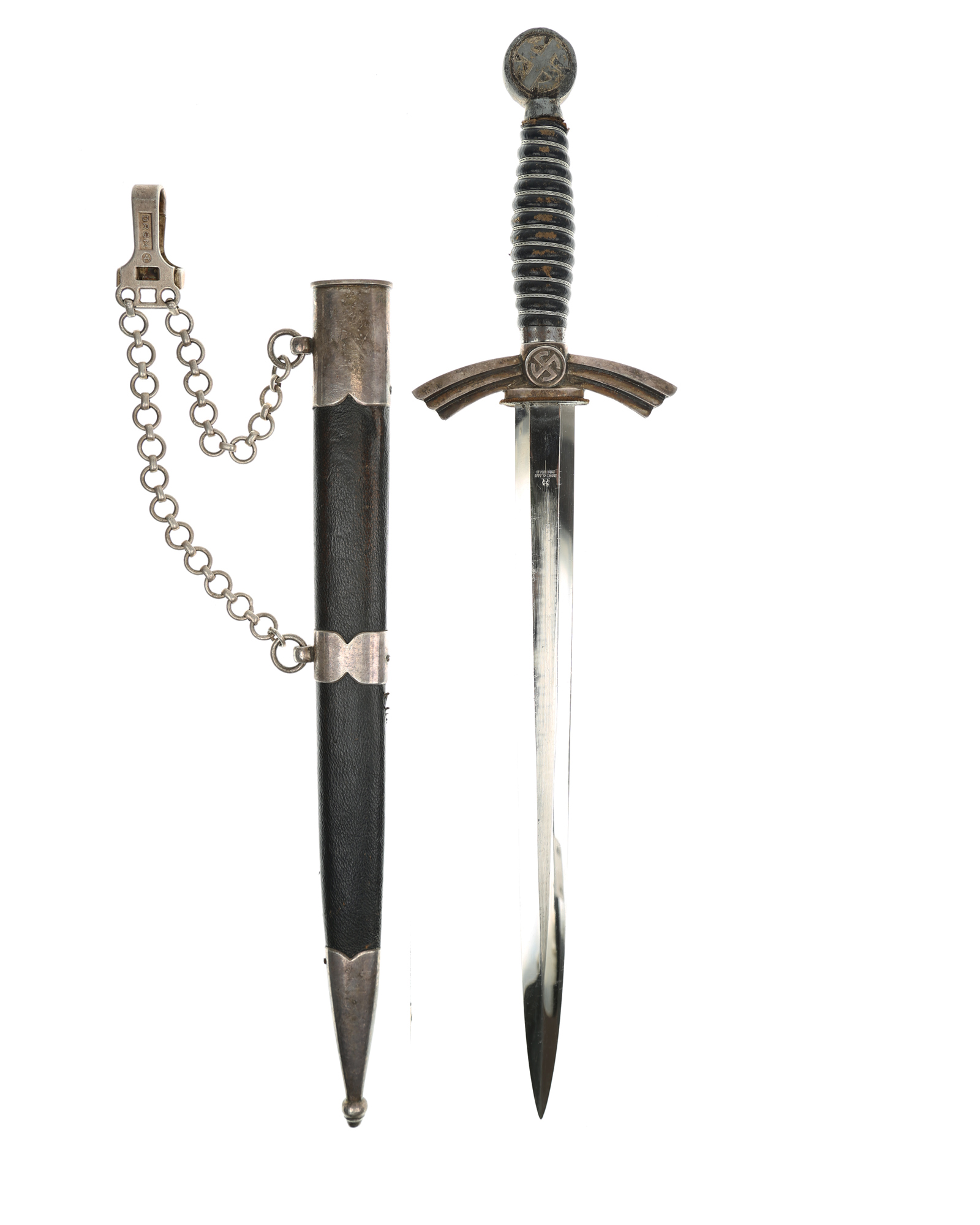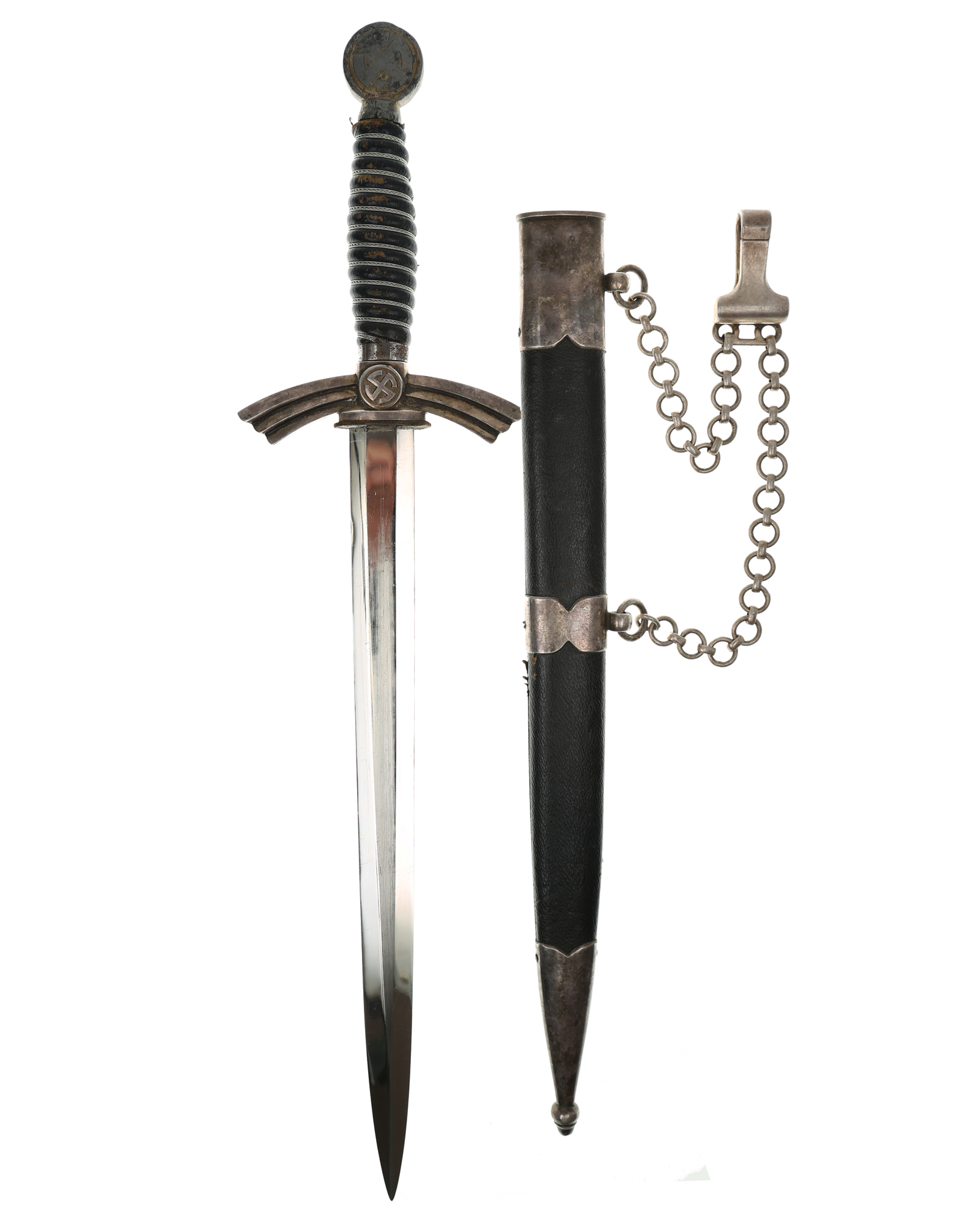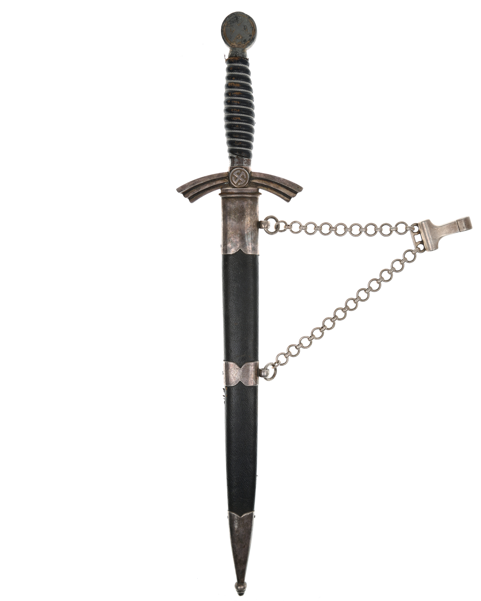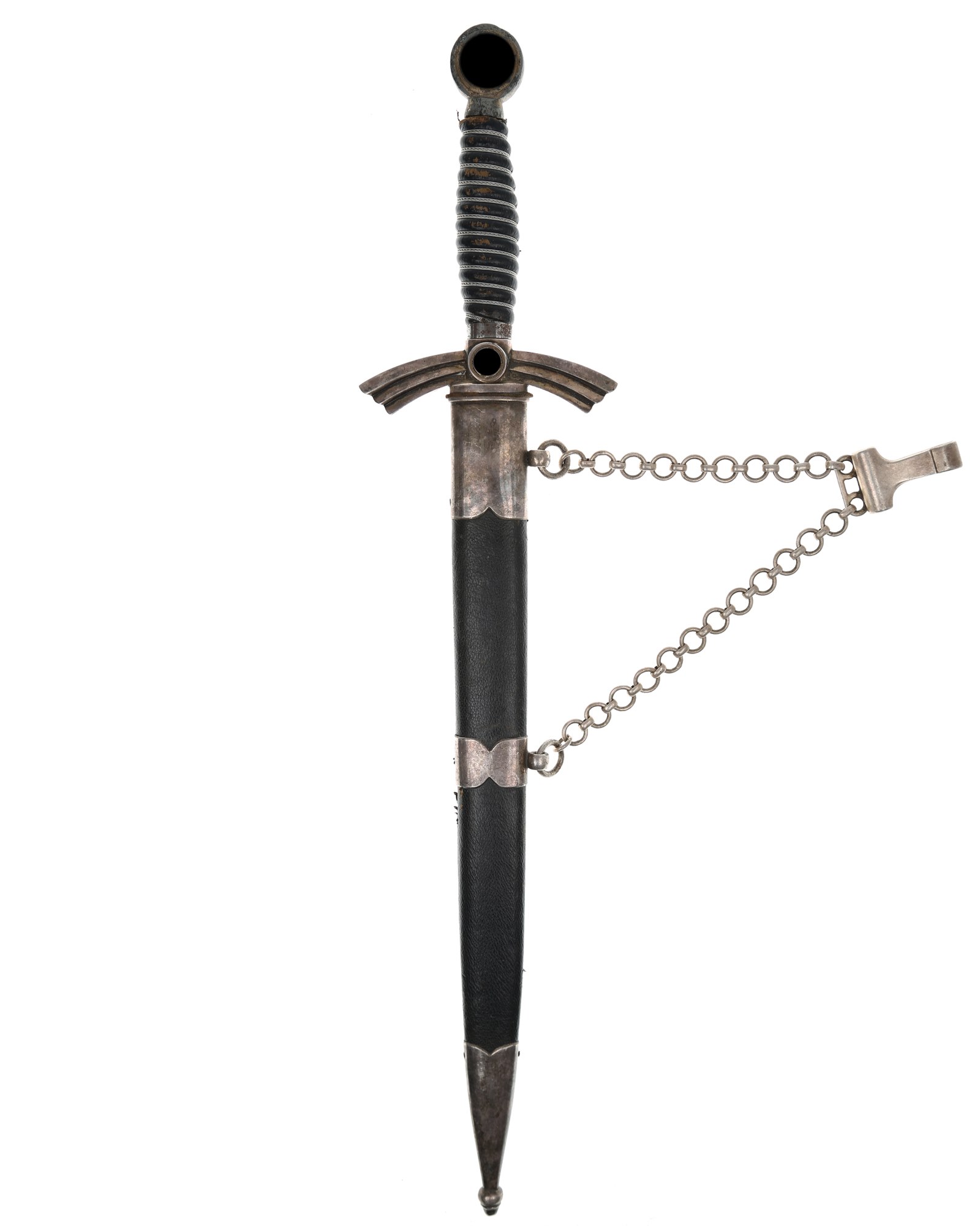 Кортик офицера Люфтваффе образца 1935 года в хорошем состоянии. Клинок с клеймом фирмы "Robert Klaas, Solingen", сохранилась оригинальная полировка. Крестовина представляет собой стилизованное изображение крыльев, слегка загнутых в сторону основания клинка. Рукоять деревянная, покрыта синей кожей с незначительными потертостями и перевита по поперечным желобкам проволокой из белого металла. В крестовине и навершии установлены круглые медальоны с рельефным изображением свастики. Весь металлический прибор рукояти и ножен изготовлен из мельхиора. Ножны металлические, обтянуты темно-синей кожей. Цепной подвес. Кожа рукояти имеют множественные следы бытования.