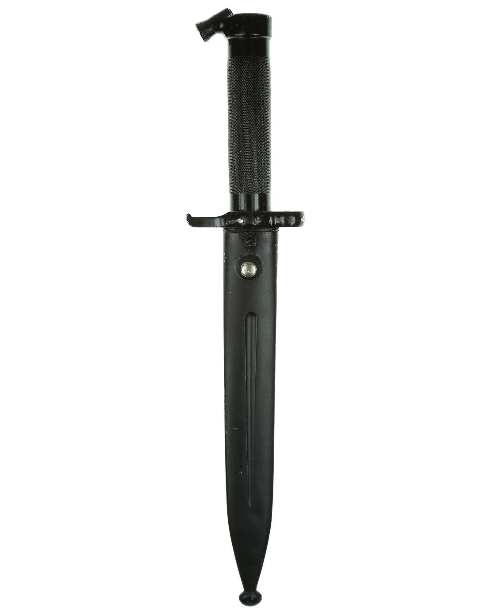 Рукоять стальная полая, овального сечения, с рифленой поверхностью. В верхней части рукояти находится пружинная защелка, фиксировавшая штык. Конец крестовины немного закруглен вниз. С обратной стороны крестовины находится кольцо для ствола. Клинок стальной, прямой, двулезвийный, с одним узким долом по средней линии, сужающийся к концу. Ножны металлические, со вставным подпружиненным устьем, круглым шпеньком и шариком на конце. По средней линии ножен с обеих сторон имеется углубление (дол).