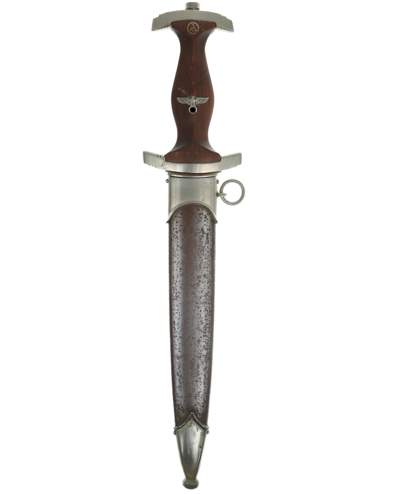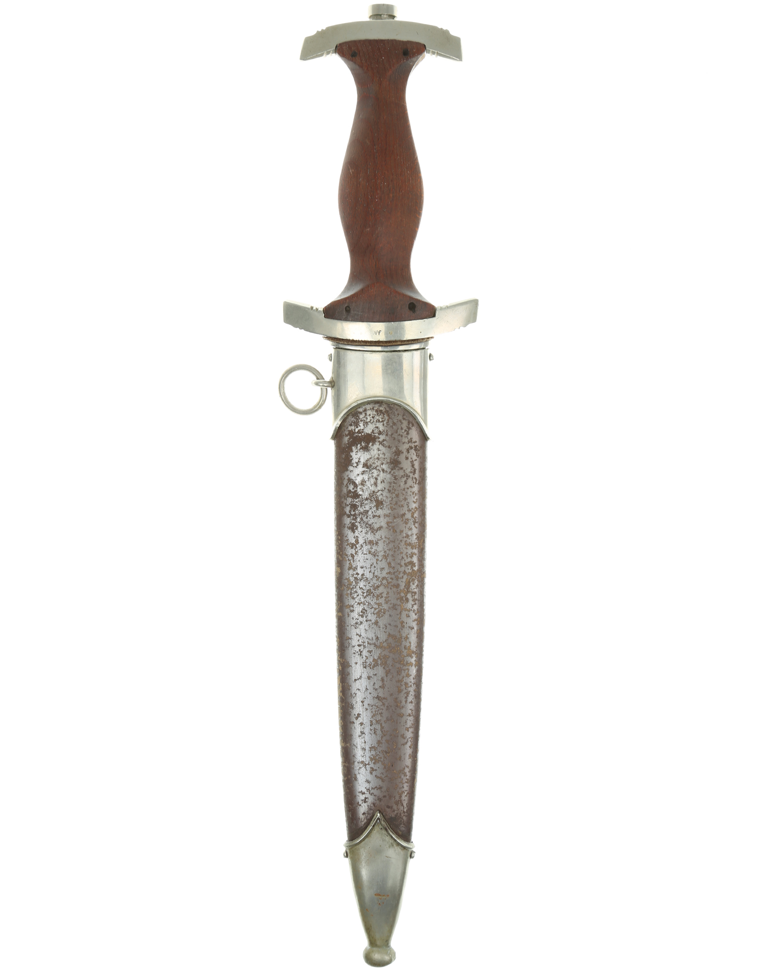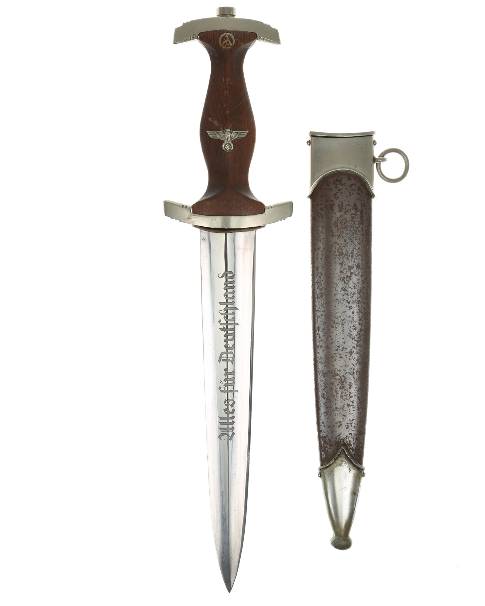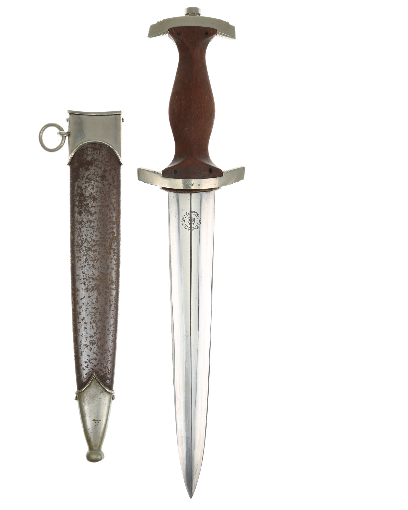 Кинжал членов штурмовых отрядов СА обр. 1933 г., Германия. Клинок классический кинжального типа, стальной, прямой, двулезвийный, с выраженным центральным ребром. На клинке сохранилась заводская полировка. На лицевой стороне нанесен травлением девиз СА Alles fur Deutschland (Все для Германии), на оборотной стороне у основания стоит редкое клеймо фирмы Сarl Schmidt Sohn A.-G., Solingen. Гарда маркирована клеймом в виде буквы Wf-Westfalen. Рукоять изготовлена из проваренного и прокрашенного в темно-бордовый цвет дерева в которую вмонтирован мельхиоровый орел и эмалевая таблетка SA. Ножны металлические в оригинальном оксидировании.