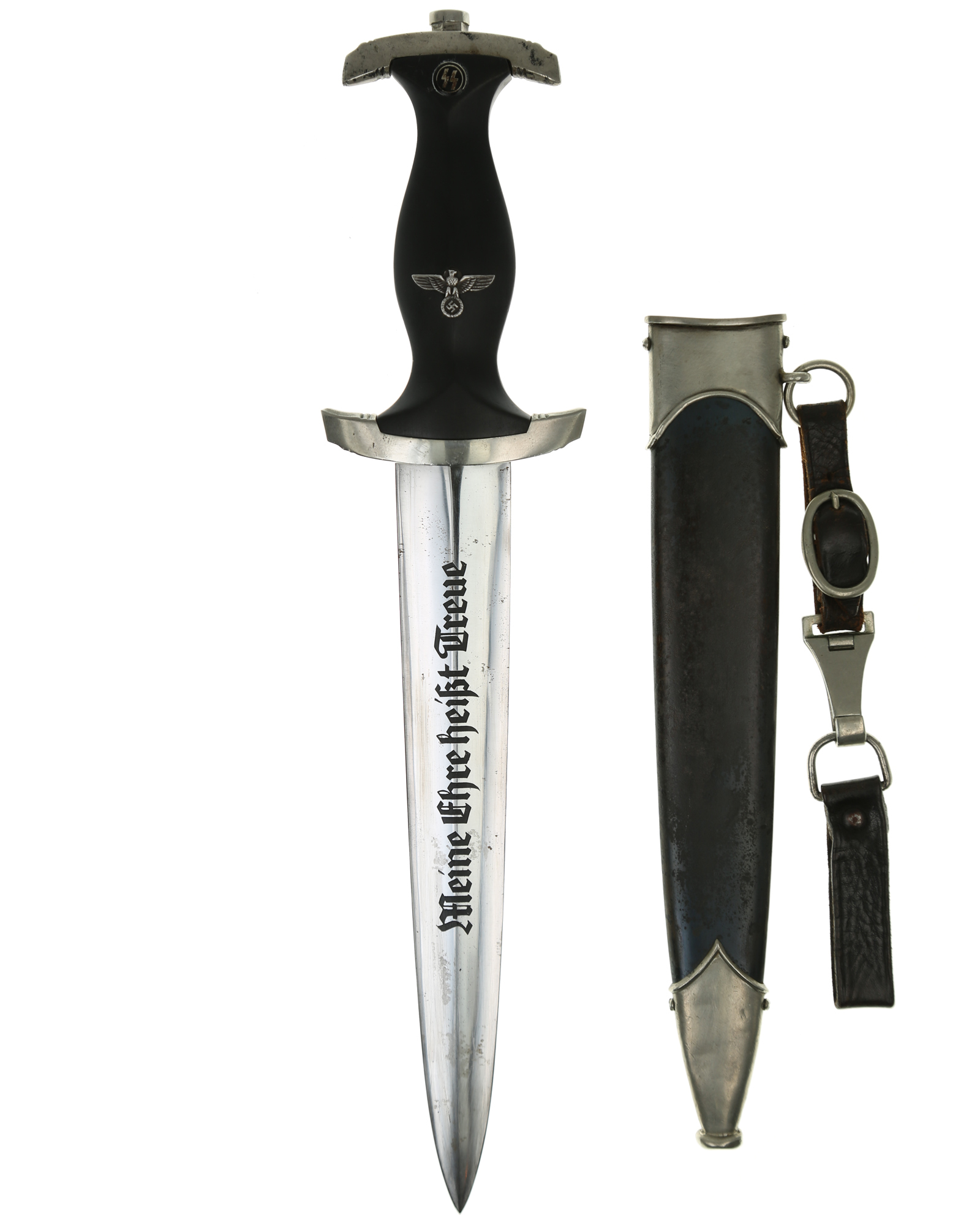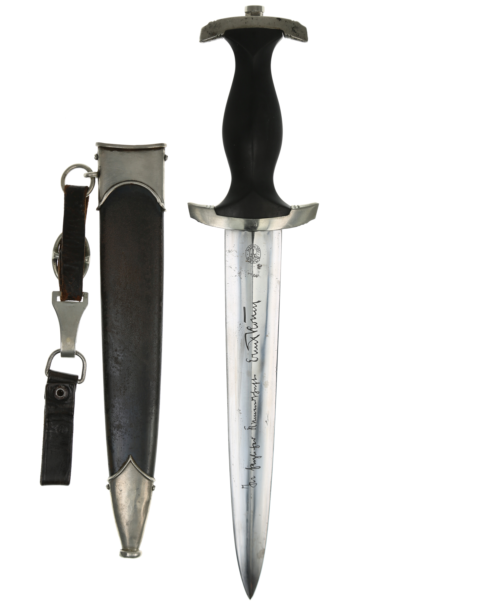 Служебные и наградные Кинжал СС (нем. SS-Dienstdolch) образца 1933 года с полностью сохранившейся дарственной подписью Эрнста Рёма на оборотной стороне клинка. Клинок стальной, классический кинжального типа, прямой, двулезвийный, с выраженным центральным ребром. На лицевой стороне нанесен травлением девиз SS "Meine Ehre heisst Treue" (Моя честь называется Верность). На оборотной стороне у основания стоит клеймо производителя „Böker“ - Генрих Бёкер и К. (БАУМВЕРК), Золинген и находится надпись "In herzlicher Kameradschaft Ernst Röhm" (В знак сердечной дружбы, Эрнст Рём). На нижней гарде с внутренней стороны клеймо "I". Металлические элементы гарды мельхиоровые, вмонтированный в рукоять орел также изготовлен из мельхиора, что свидетельствует о раннем выпуске кинжала. Рукоять изготовлена из мореного в черный цвет дерева. Ножны металлические в оригинальном черном оксидировании, ножны на оригинальном кожаном подвесе, прибор ножен изготовлен из белого металла. Один из лучших кинжалов за последние 10 лет, все цвета прибора совпадают, абсолютно соответствующая подпись Э. Рема, как описана в литературе. Кинжал не подвергался никаким воздействиям по очищению для придания более нового вида. Идеальное состояние.