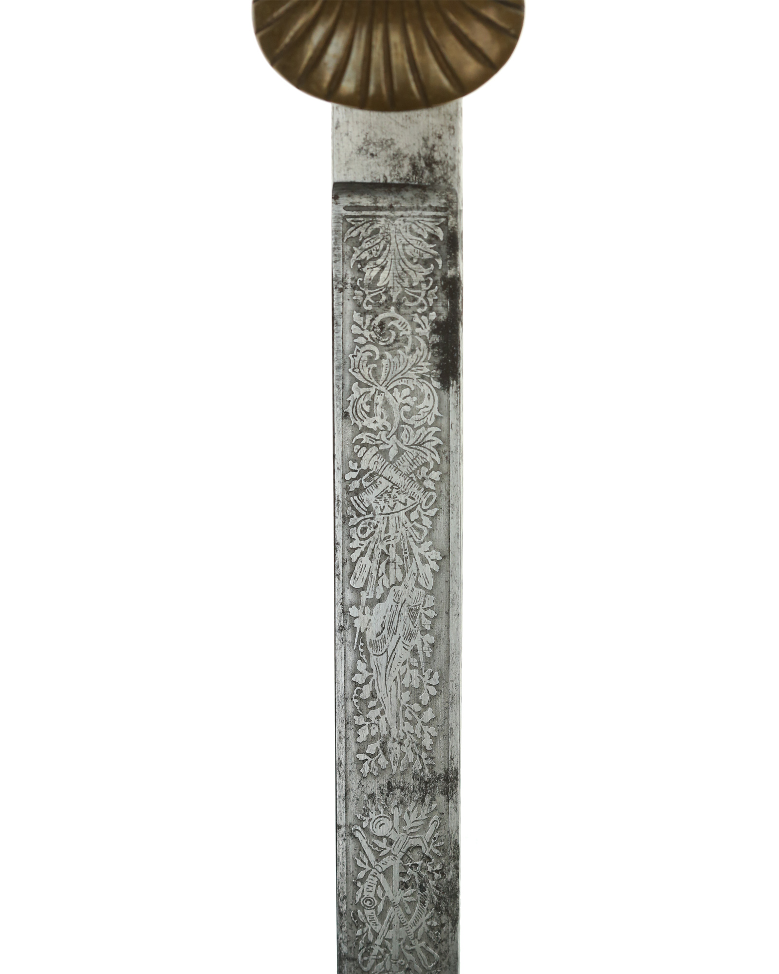 РУКОЯТЬ из рога, слегка изогнутая, головка круглая в виде плоской крышки с геометрическим узором. Нижняя гайка коническая с поперечными бороздками. На передней поверхности располагаются три накладки в виде желудей.