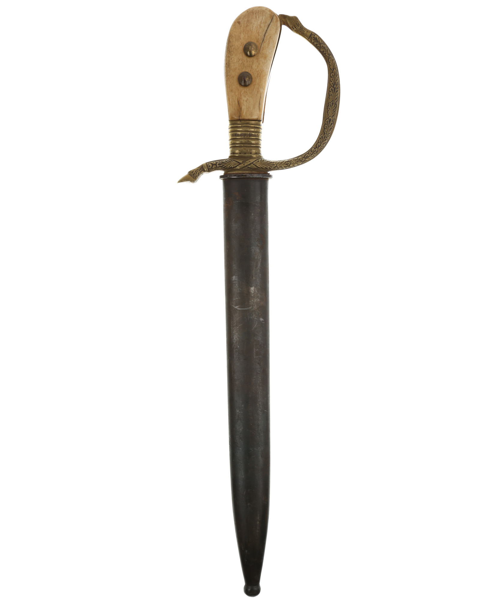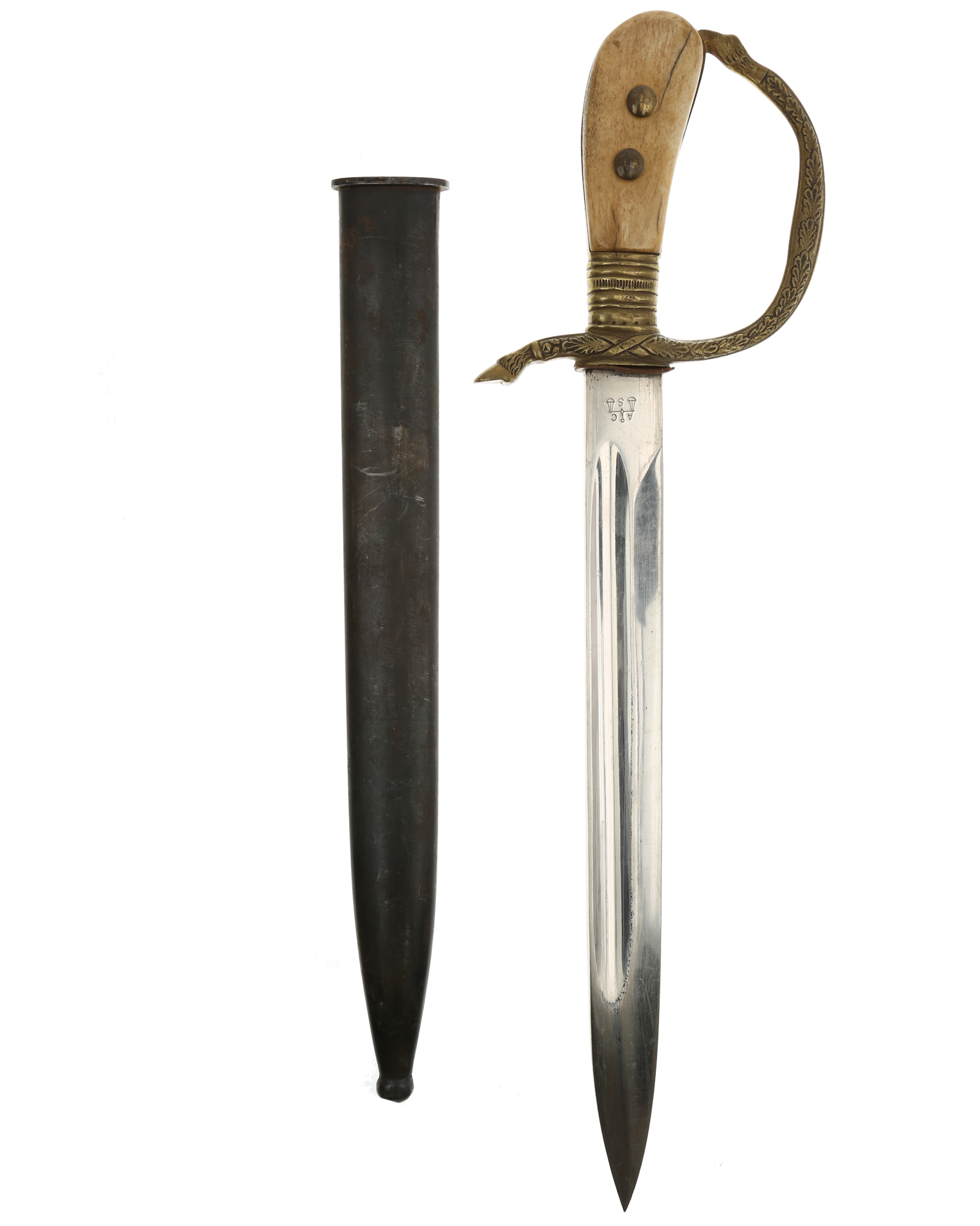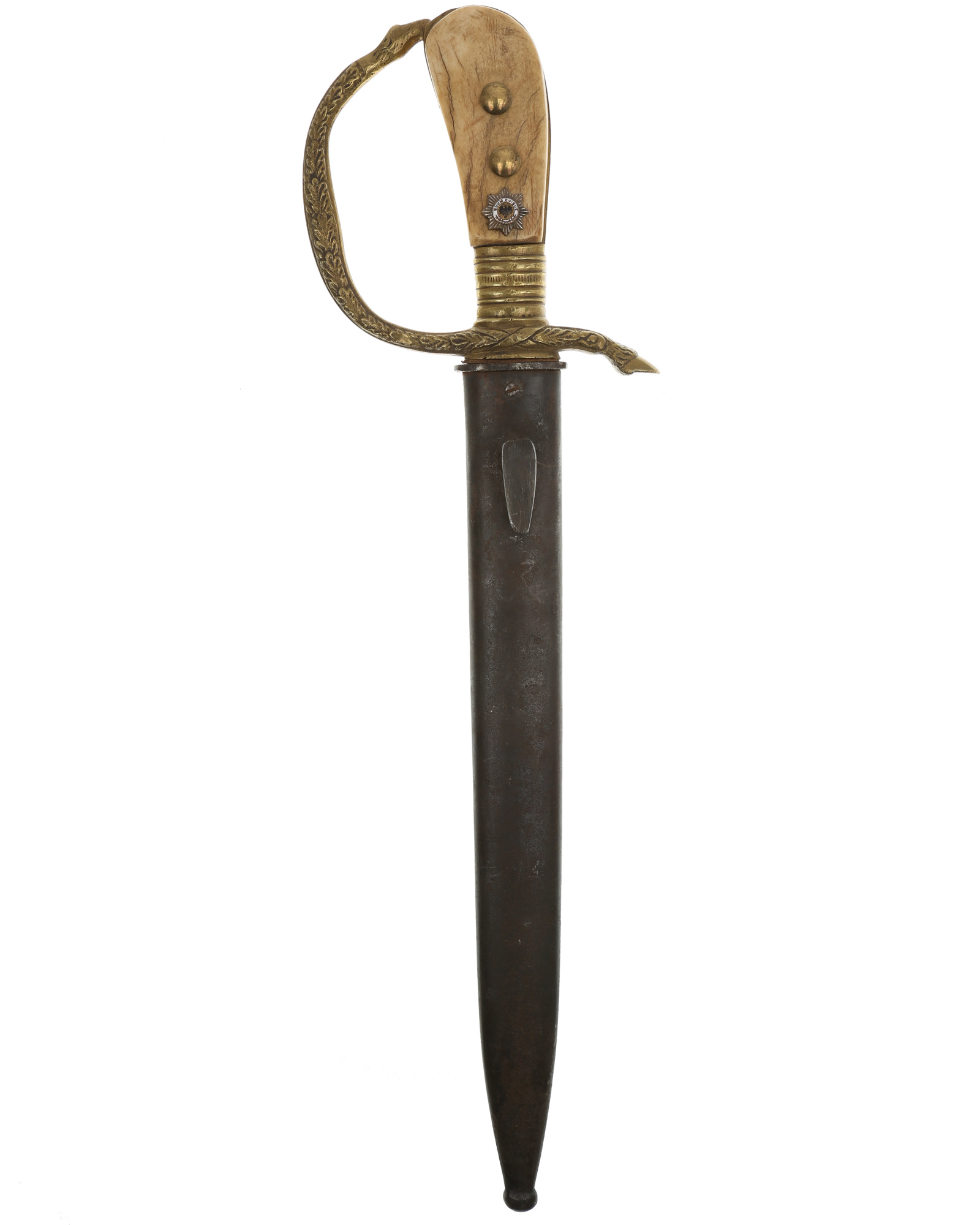 Клинок стальной. Клинок маркирован клеймом изготовителя Alex Coppel (ALCOSO) Solingen. Накладки на рукоять из рога, с накладнынам стекловидной эмали. Прибор рукояти покрытого золотым лаком, гарда рукояти выполнена в форме копыта.