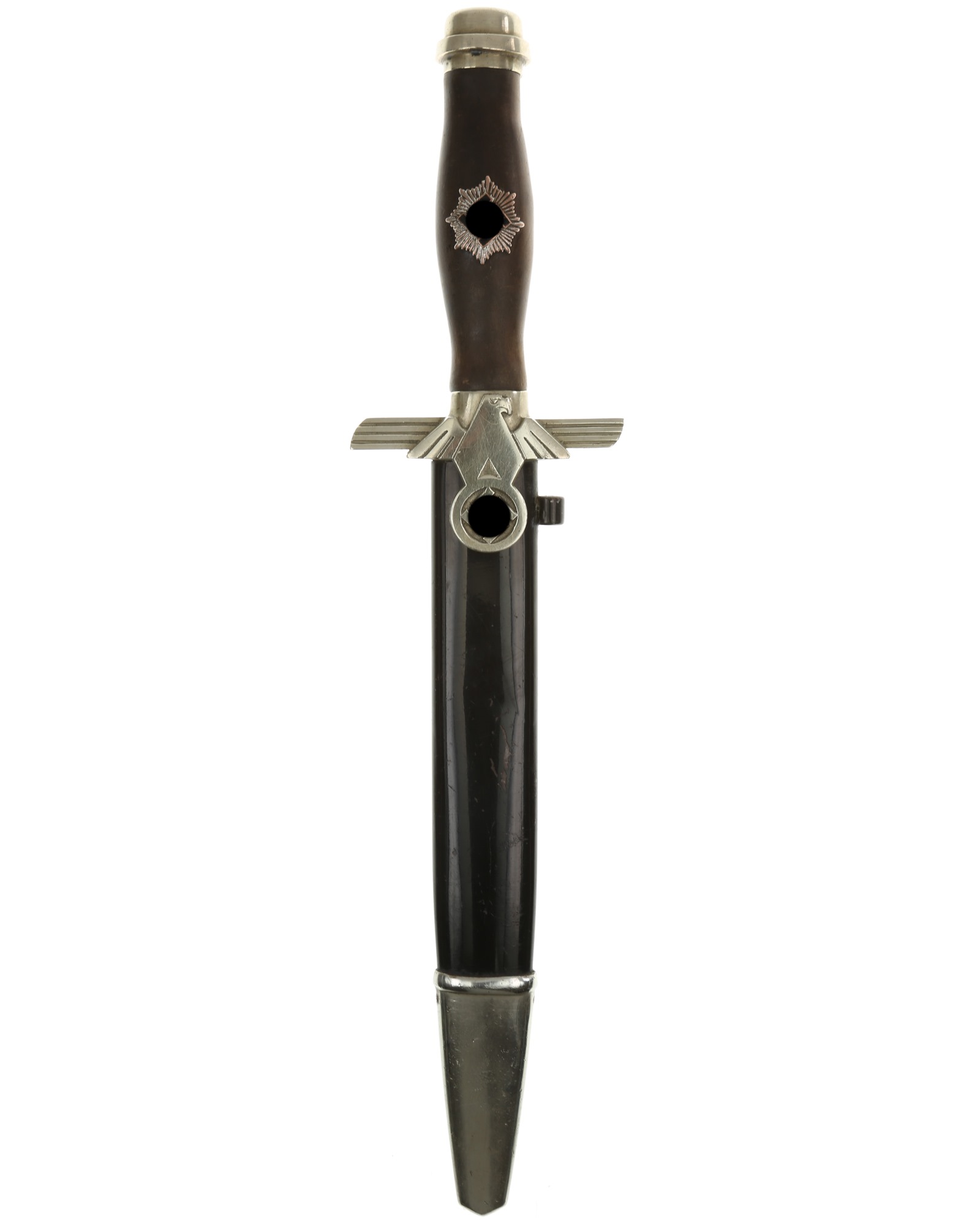 Кортик второго типа младшего командного состава Службы противовоздушной обороны (RLB) обр. 1938 года, Германия. Клинок кортика стальной, прямой, ромбического сечения, обоюдоострый. Рукоять деревянная, окрашена в черный цвет. В центре рукояти мельхиоровая накладка с эмалевой эмблемой RLB второго типа. Гарда в виде Имперского орла. Прибор ножен и рукояти из мельхиора, ножны окрашены черным лаком.
