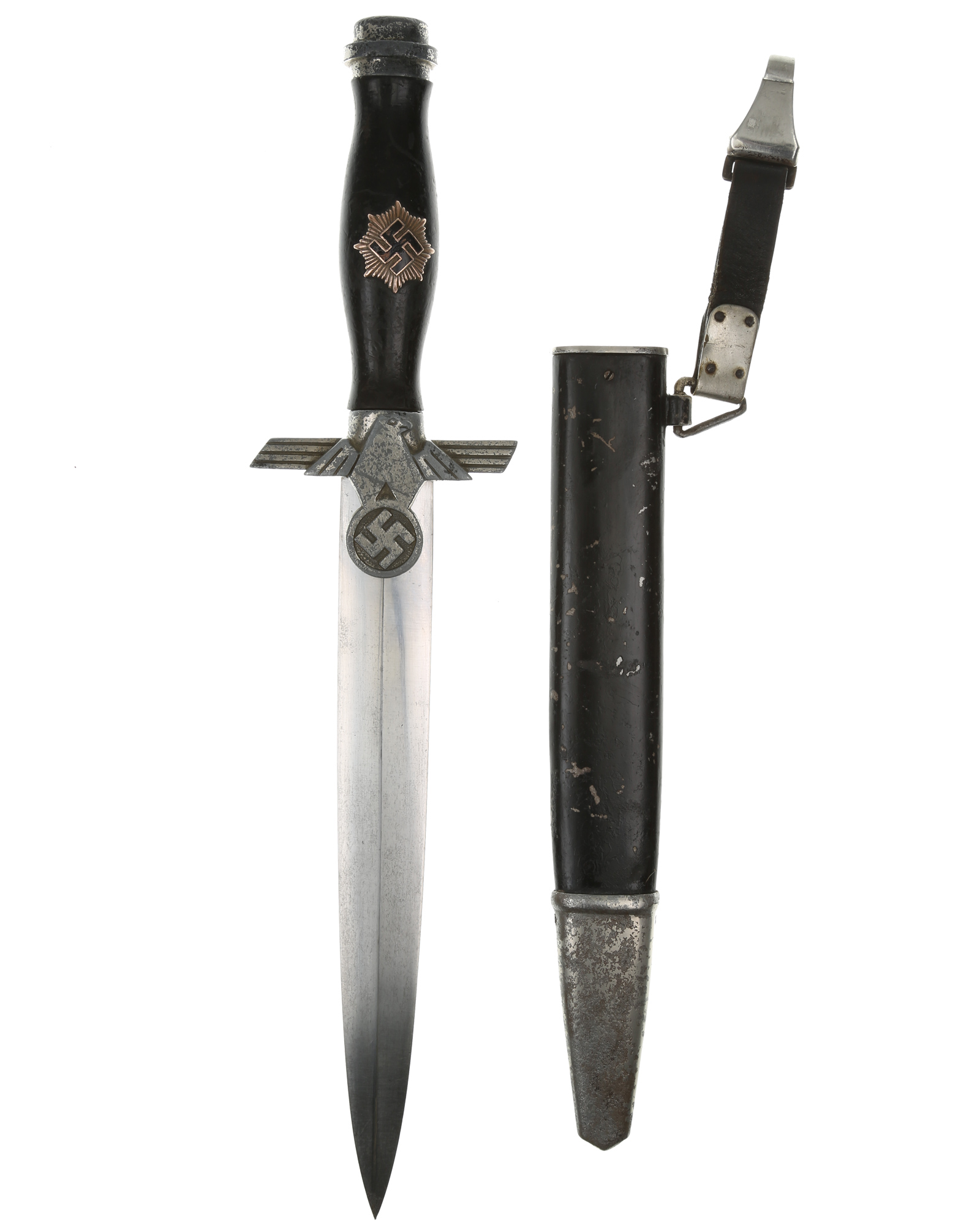 Кортик второго типа младшего командного состава Службы противовоздушной обороны (RLB) обр. 1938 года, Германия. Клинок кортика стальной, прямой, ромбического сечения, обоюдоострый. Рукоять деревянная, окрашена в черный цвет. В центре рукояти мельхиоровая накладк с эмалевой эмблемой RLB второго типа. Гарда в виде Имперского орла. Прибор ножен и рукояти из мельхиора, ножны окрашены черным лаком.