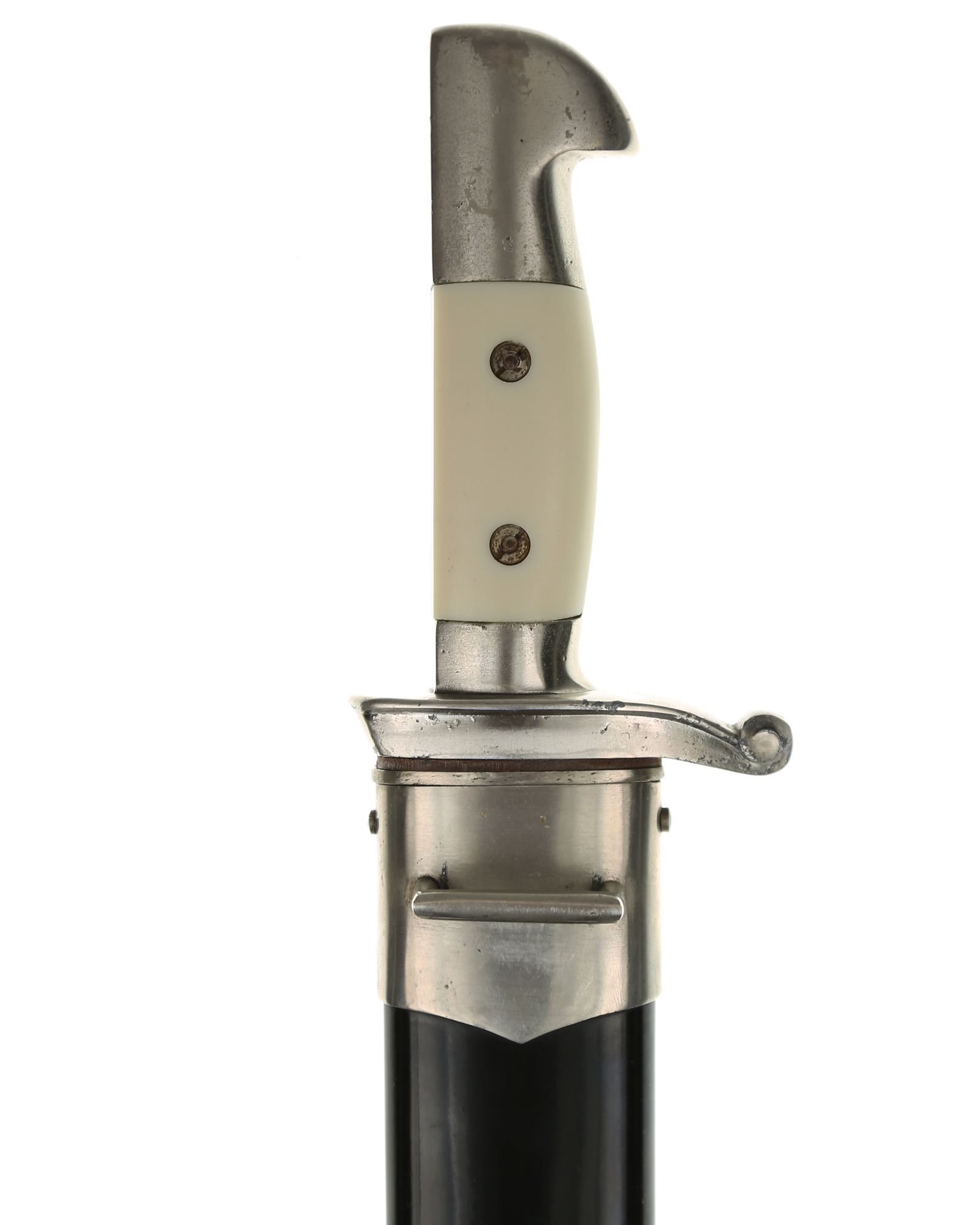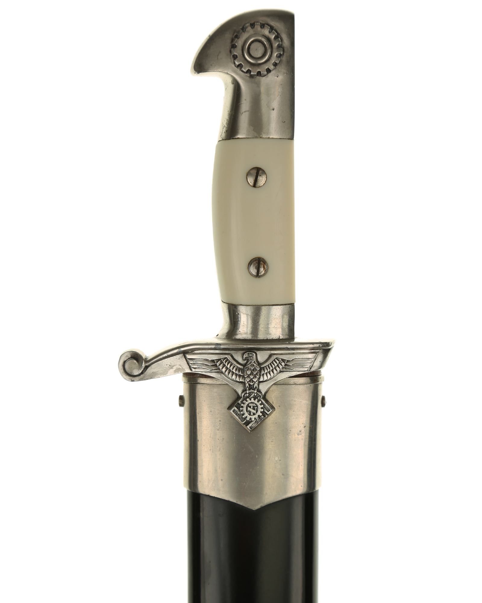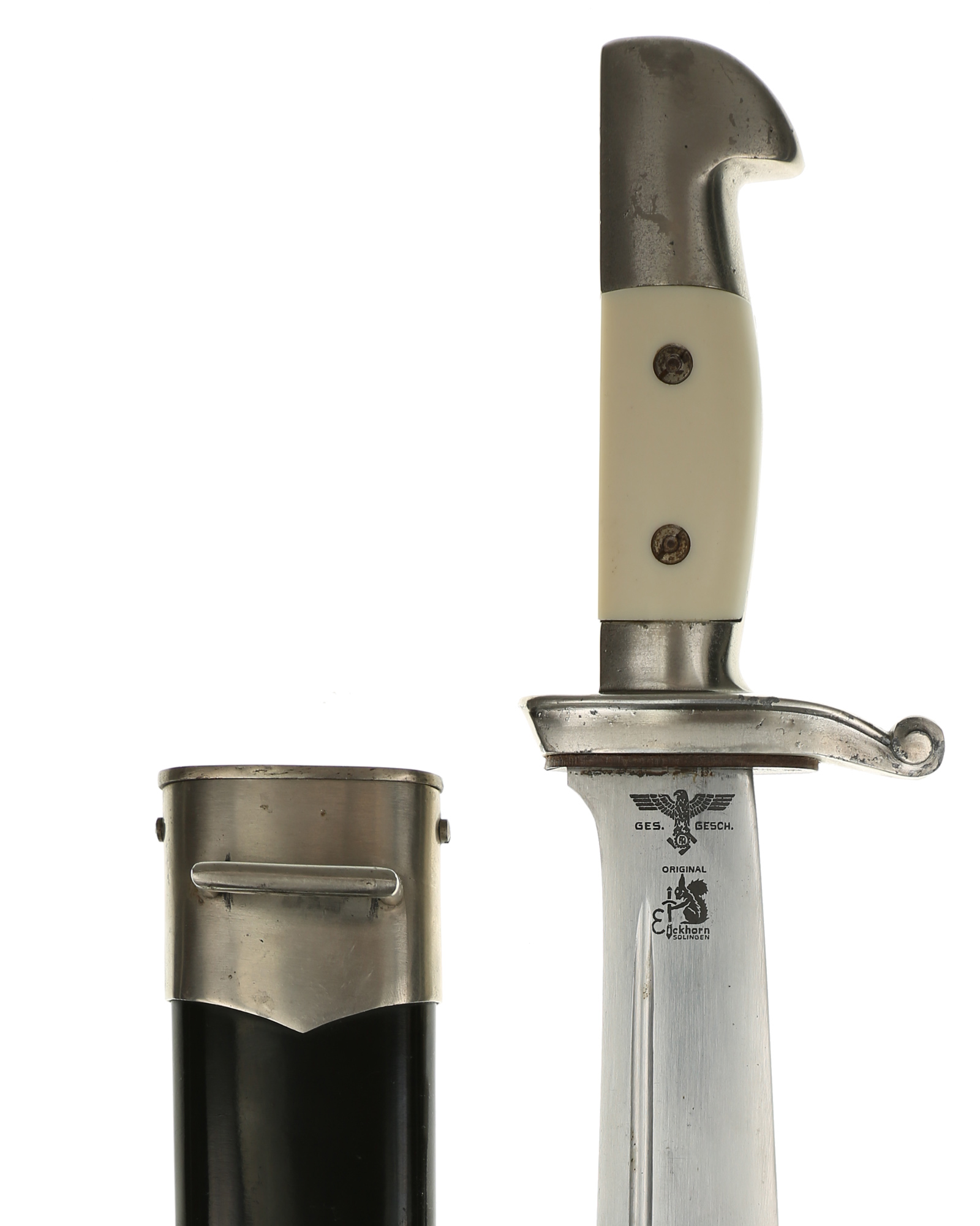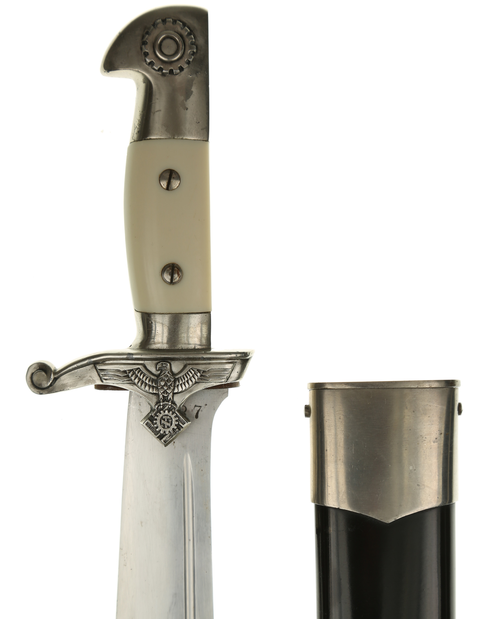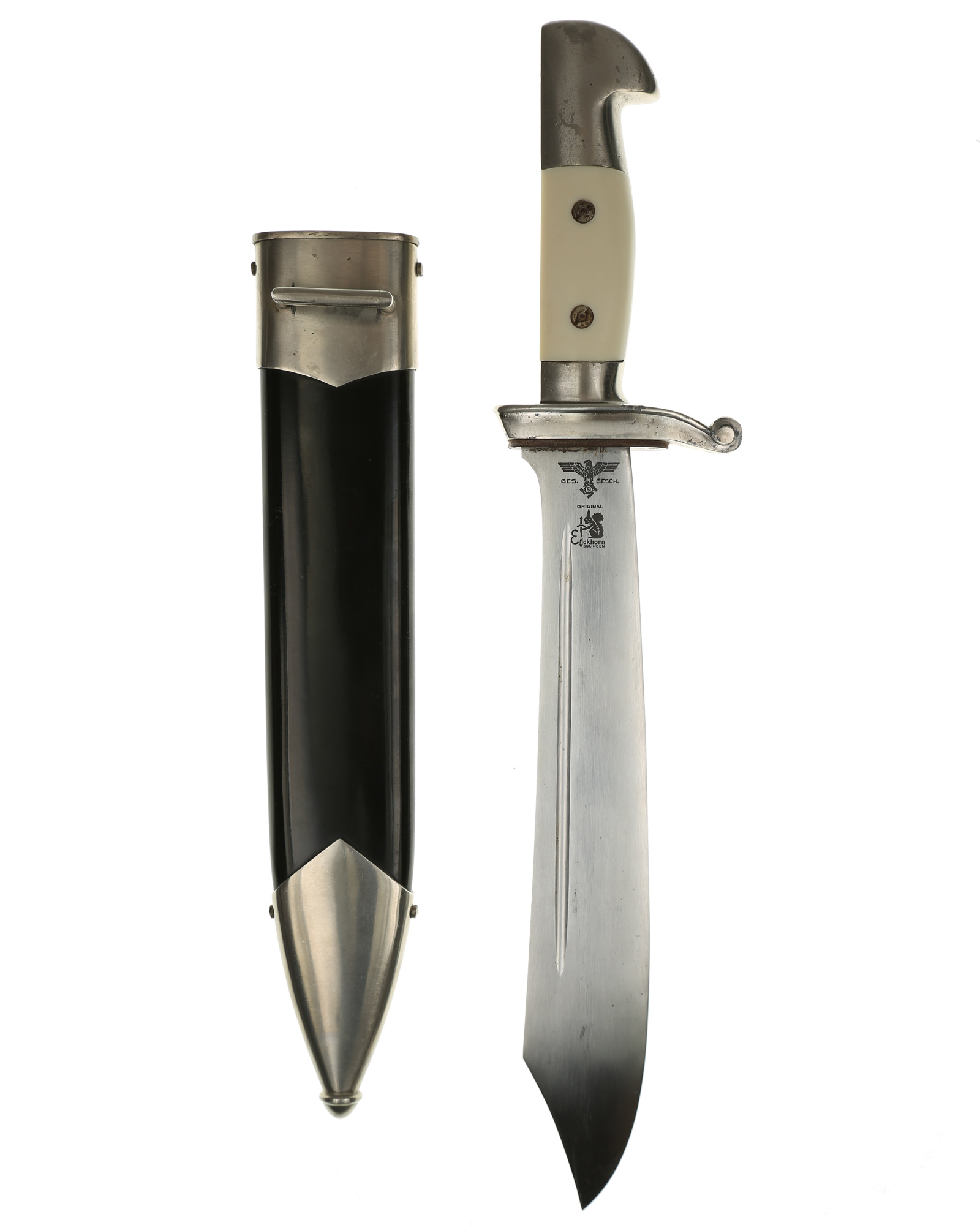Клинок плоский, однолезвийный, чуть искривленный, значительно расширяющийся к нижней части, полированный. Вдоль обуха идет узкий дол. На клинке имеются клейма: орел с символикой TeNo, вписанной в свастику и надписью - «Ges.Gesch» (защищенного патентом дизайна); известной оружейной фирмы «Original Eickhorn, Solingen» — клеймо немецкой фирмы Карл Айкхорн Золинген, изготовившей данный кинжал; на лицевой стороне основания клинка под гардой нанесен номер - «5087». На срезе устья ножен нанесен тот же номер - предмет полностью комплектный.