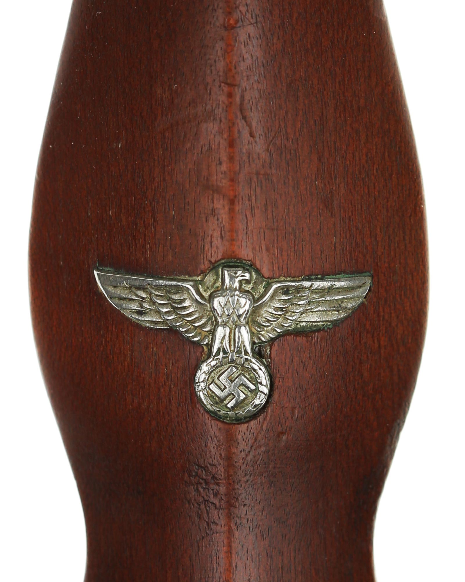 Рукоять: Рукоять из мореного в коричневый цвет дерева. Рукоять в верхней части имеет вставку в виде эмалевого глазка, в средней части – вставка в виде орла. Металлические элементы гарды изготовлены из мельхиора. Хвостовик клинка укреплен на верхней крестовине при помощи винта.