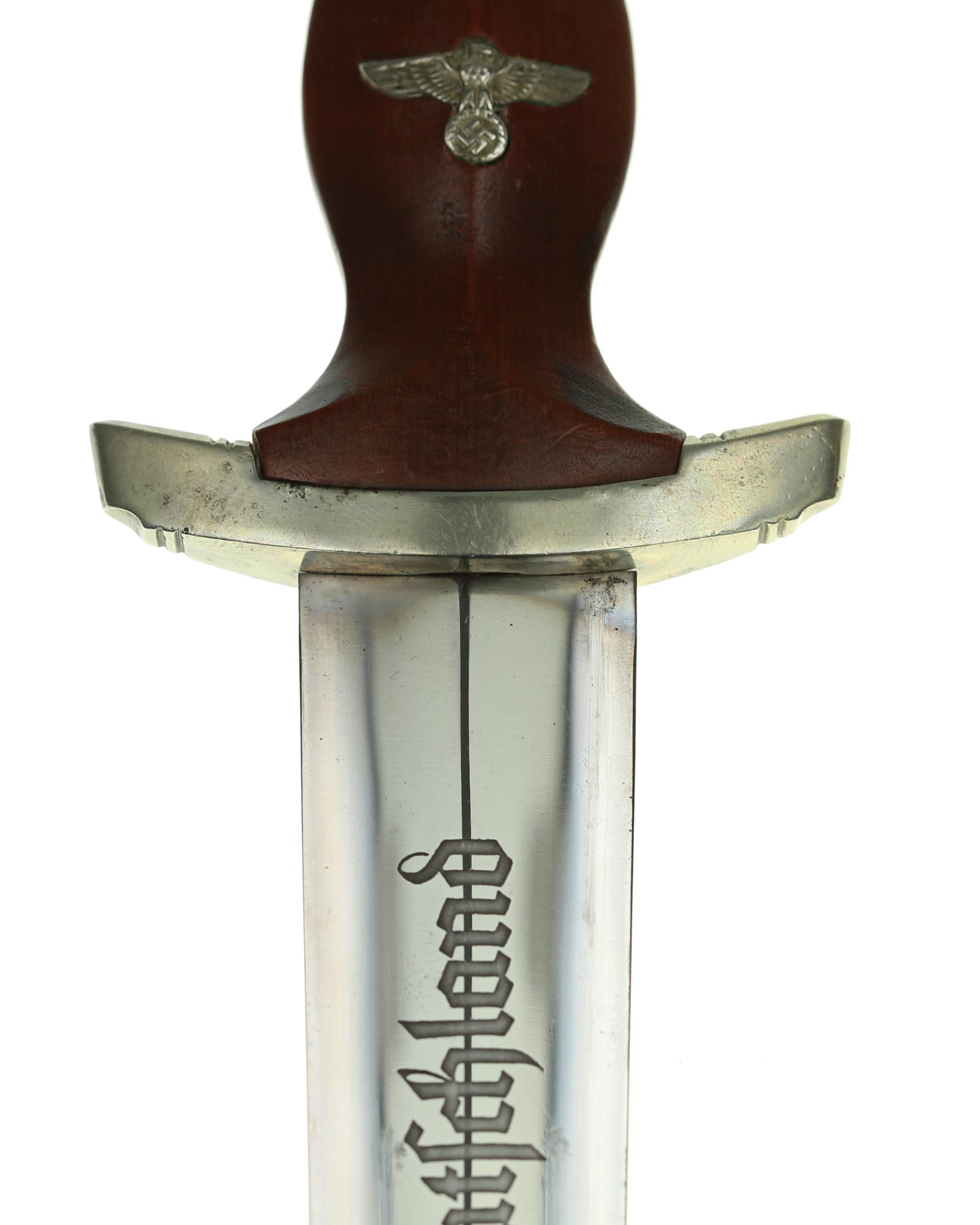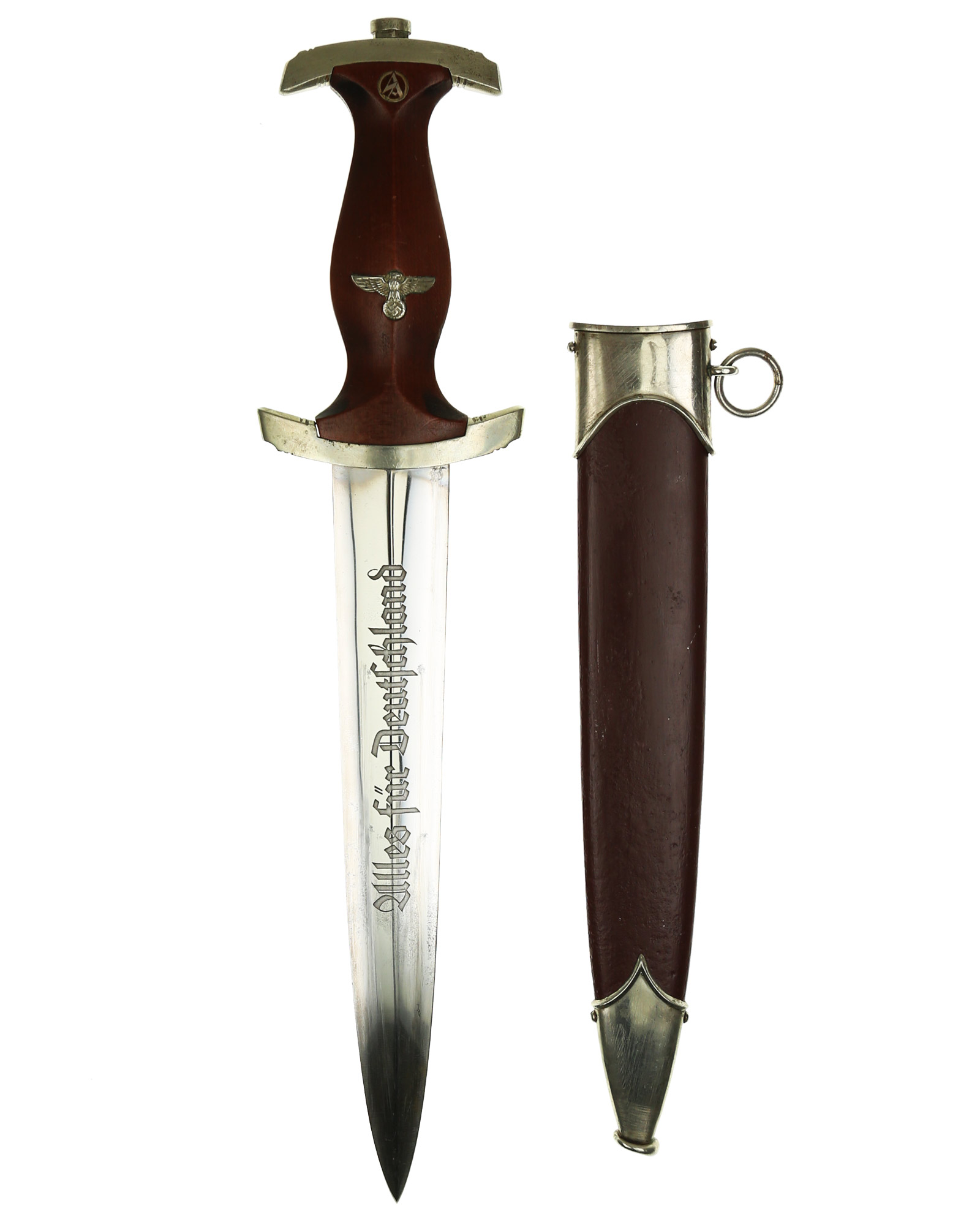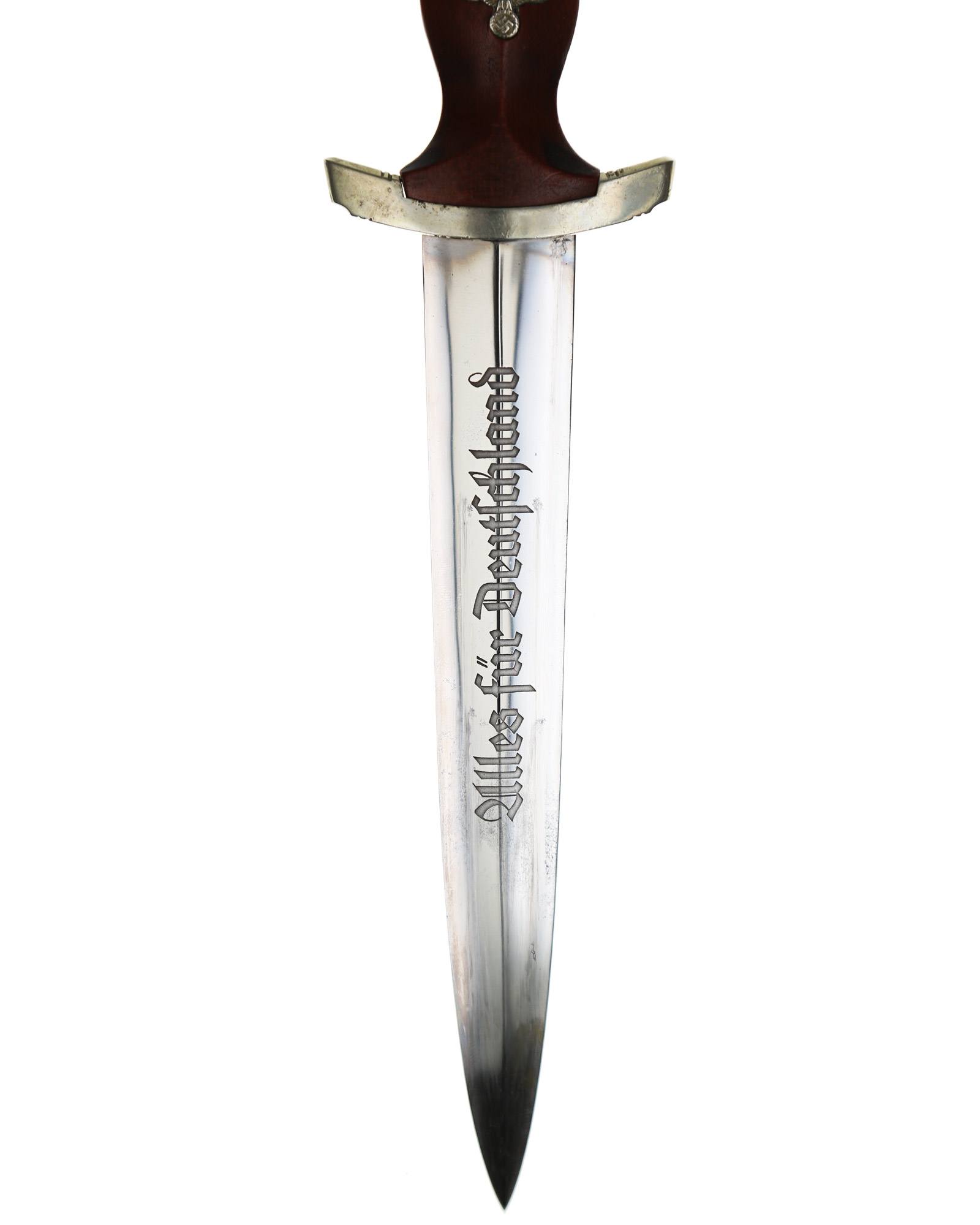 Клинок: Клинок кинжала прямой, стальной, двулезвийный, кинжального типа, с выраженным центральным ребром. На одной стороне клинка методом травления нанесен девиз СА «Всё для Германии» (Alles für Deutchland). Клинок на оборотной стороне у основания стоит клеймо производителя Эрнст Рёттген Золинген (Ernst Röttgen Solingen).