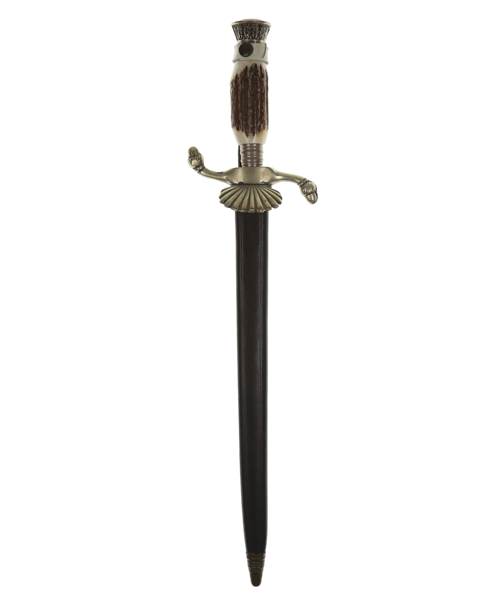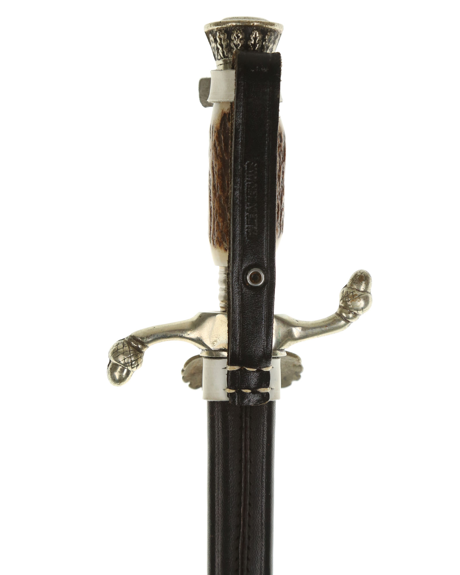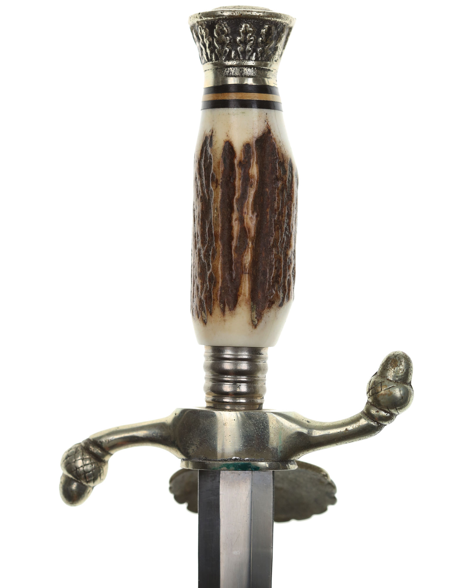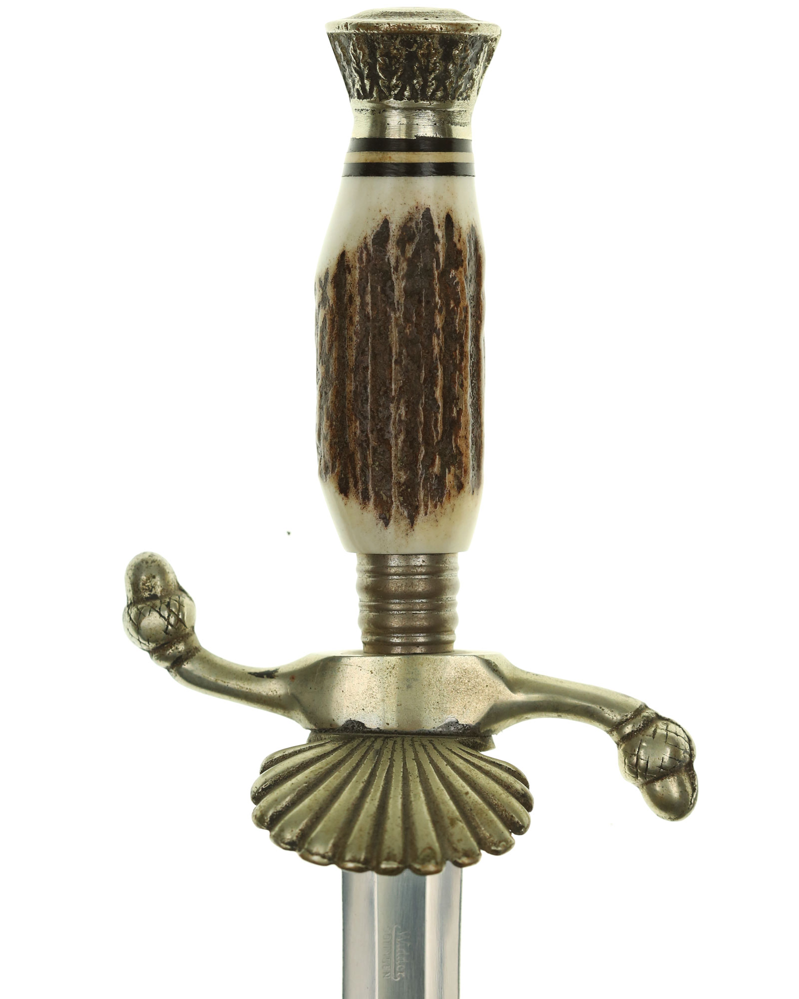 РУКОЯТЬ из рога, головка круглая в виде плоской крышки с узором. Нижняя гайка коническая с поперечными бороздками.