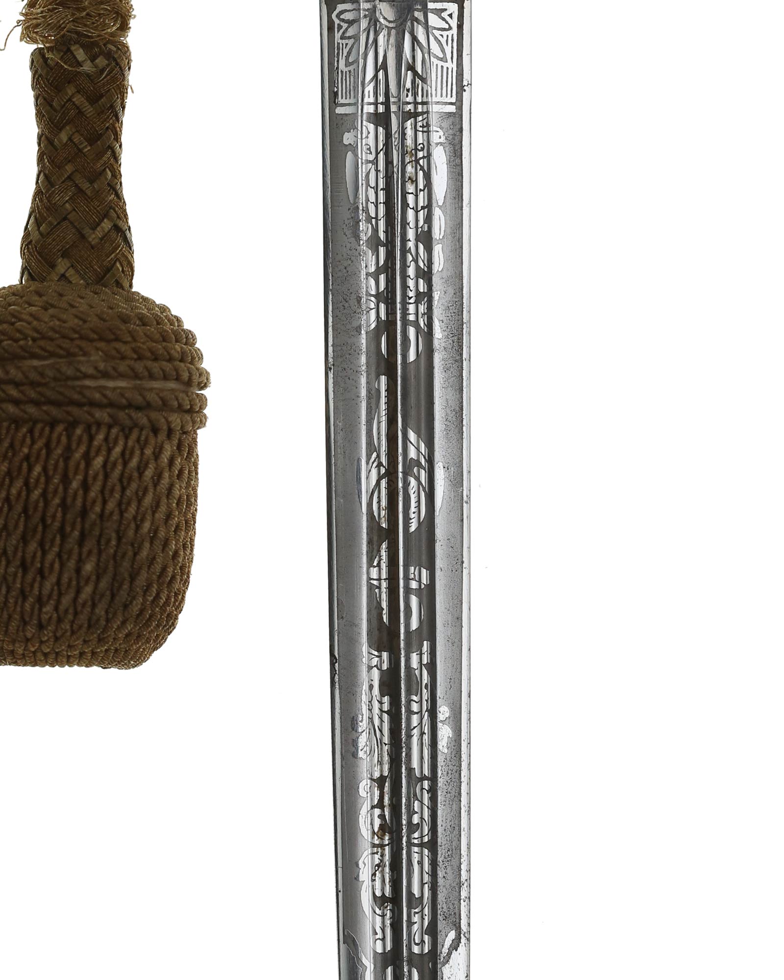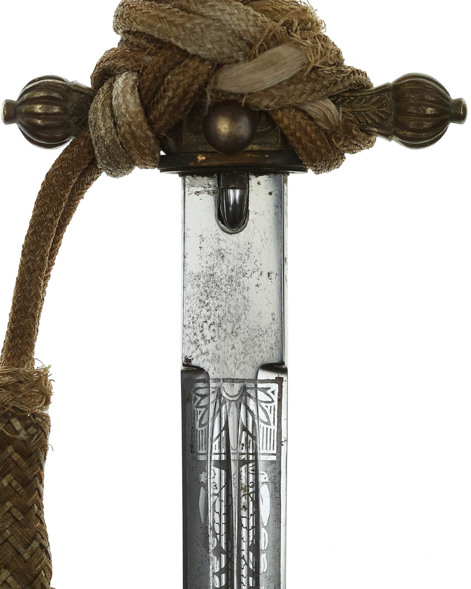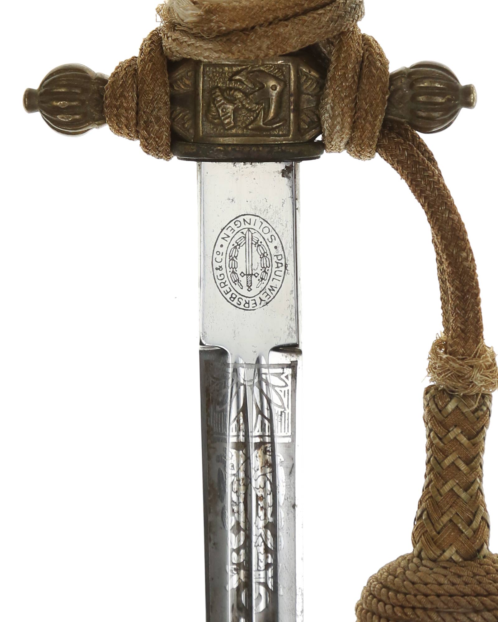 Клинок: Клинок стальной, прямой, двулезвийный, ромбического сечения, никелированный, с двумя долами. На клинке с двух сторон украшен травлением с изображением растительного орнамента и морской арматуры (якорь, обвитый канатом). На пяте клинка хорошо различимо клеймо фирмы-производителя - «Paul Weyersberg & Co., Solingen» — клеймо немецкой фирмы Пауль Вайерсберг, Золинген.