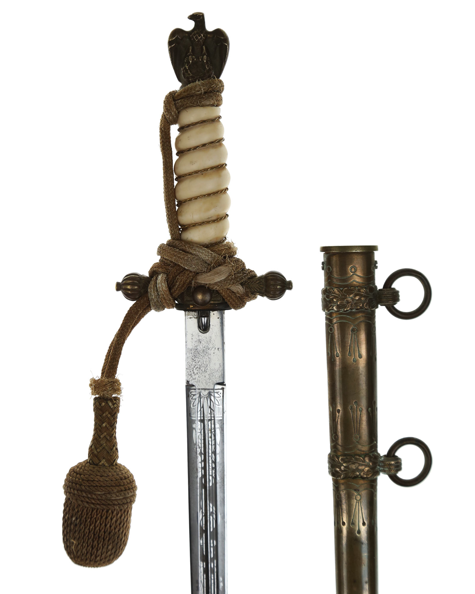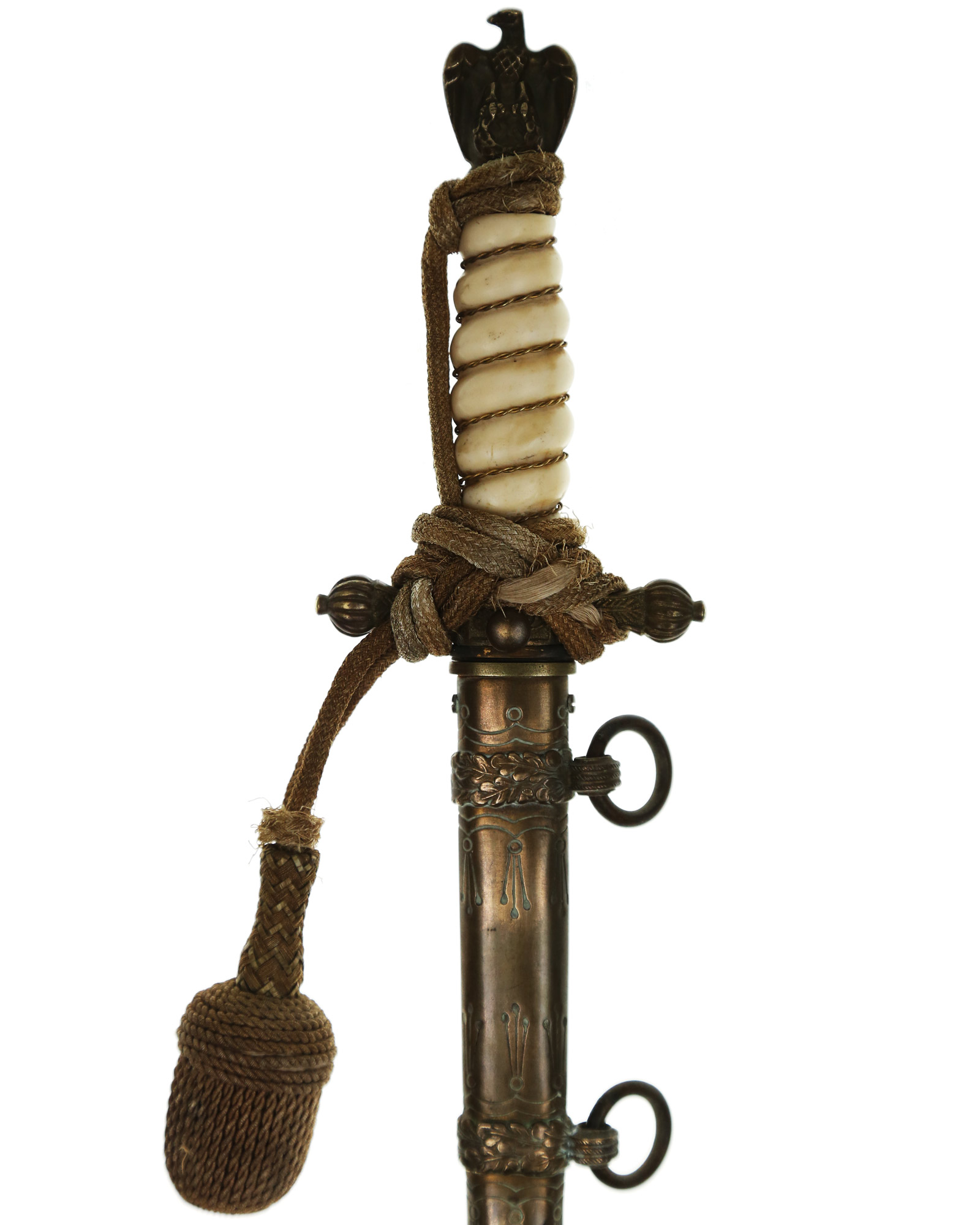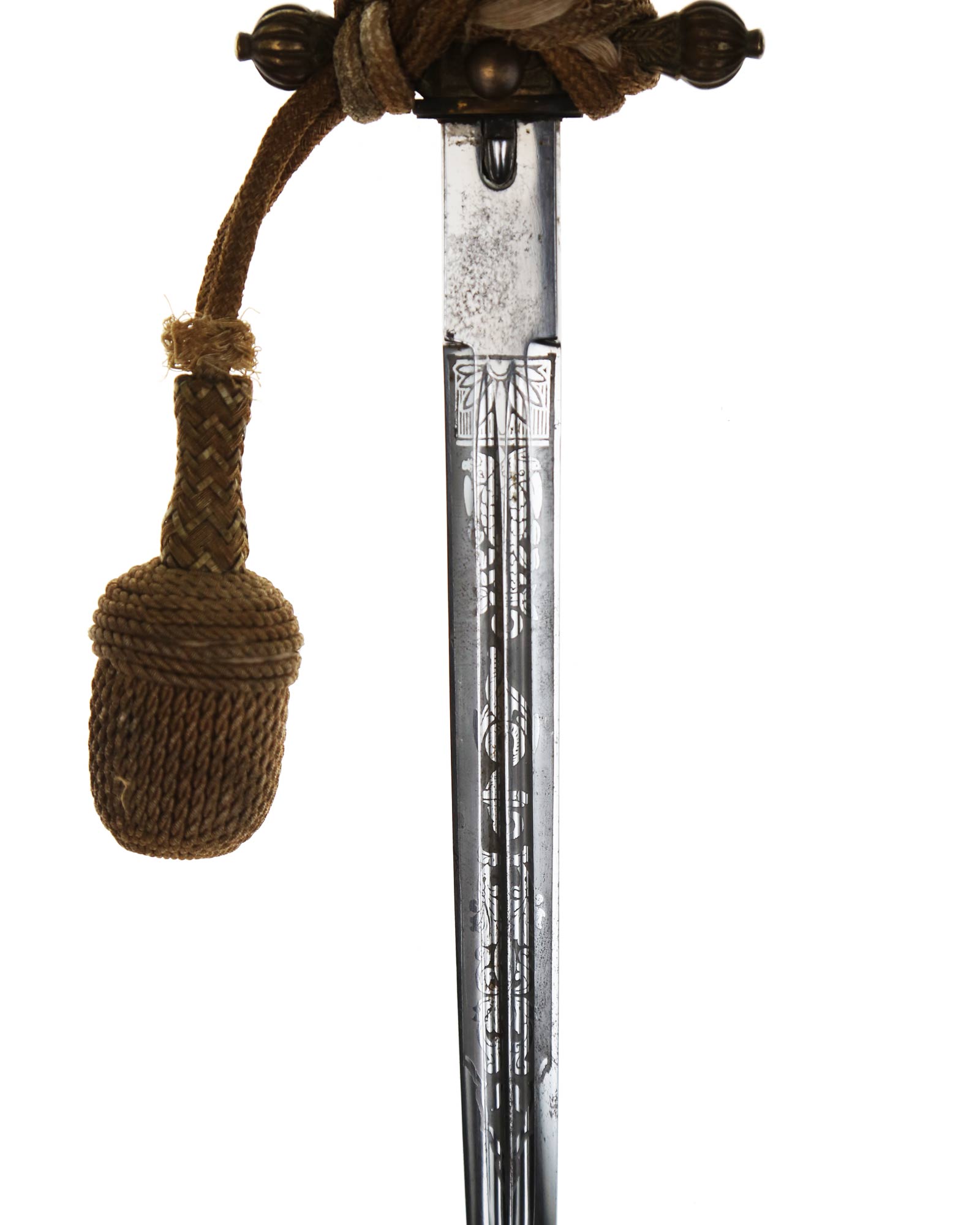 Клинок: Клинок стальной, прямой, двулезвийный, ромбического сечения, никелированный, с двумя долами. На клинке с двух сторон украшен травлением с изображением растительного орнамента и морской арматуры (якорь, обвитый канатом). На пяте клинка хорошо различимо клеймо фирмы-производителя - «Paul Weyersberg & Co., Solingen» — клеймо немецкой фирмы Пауль Вайерсберг, Золинген.